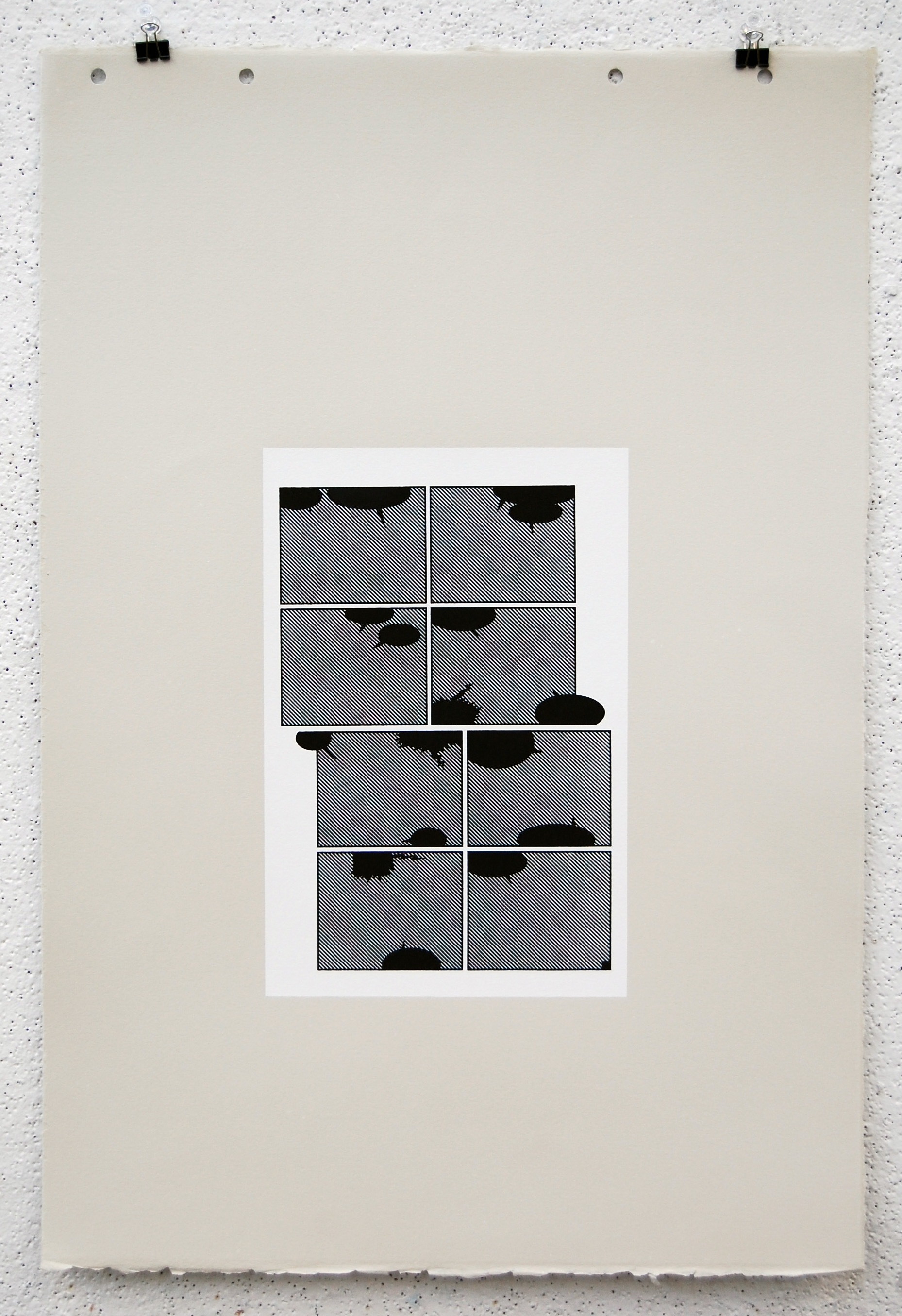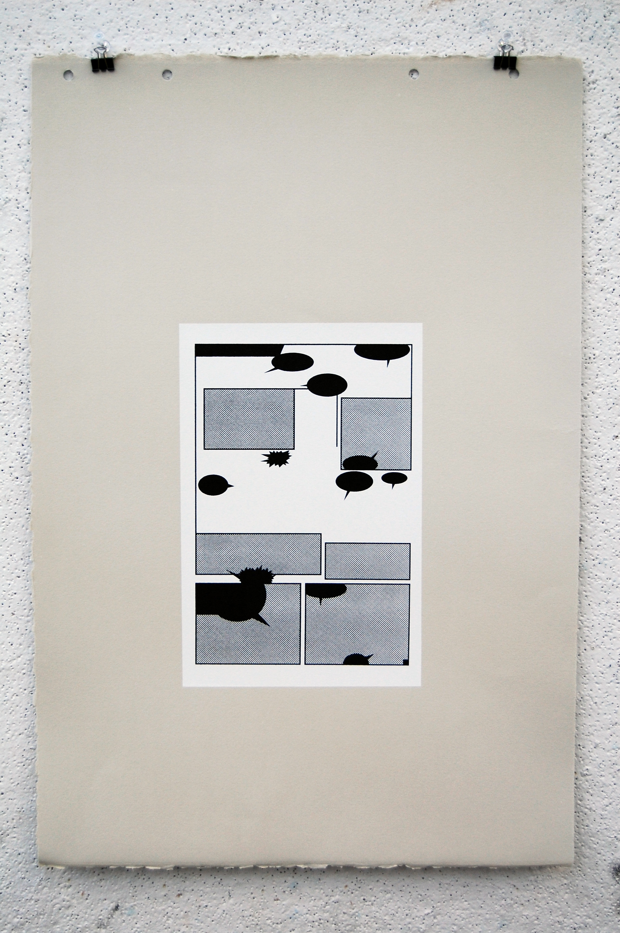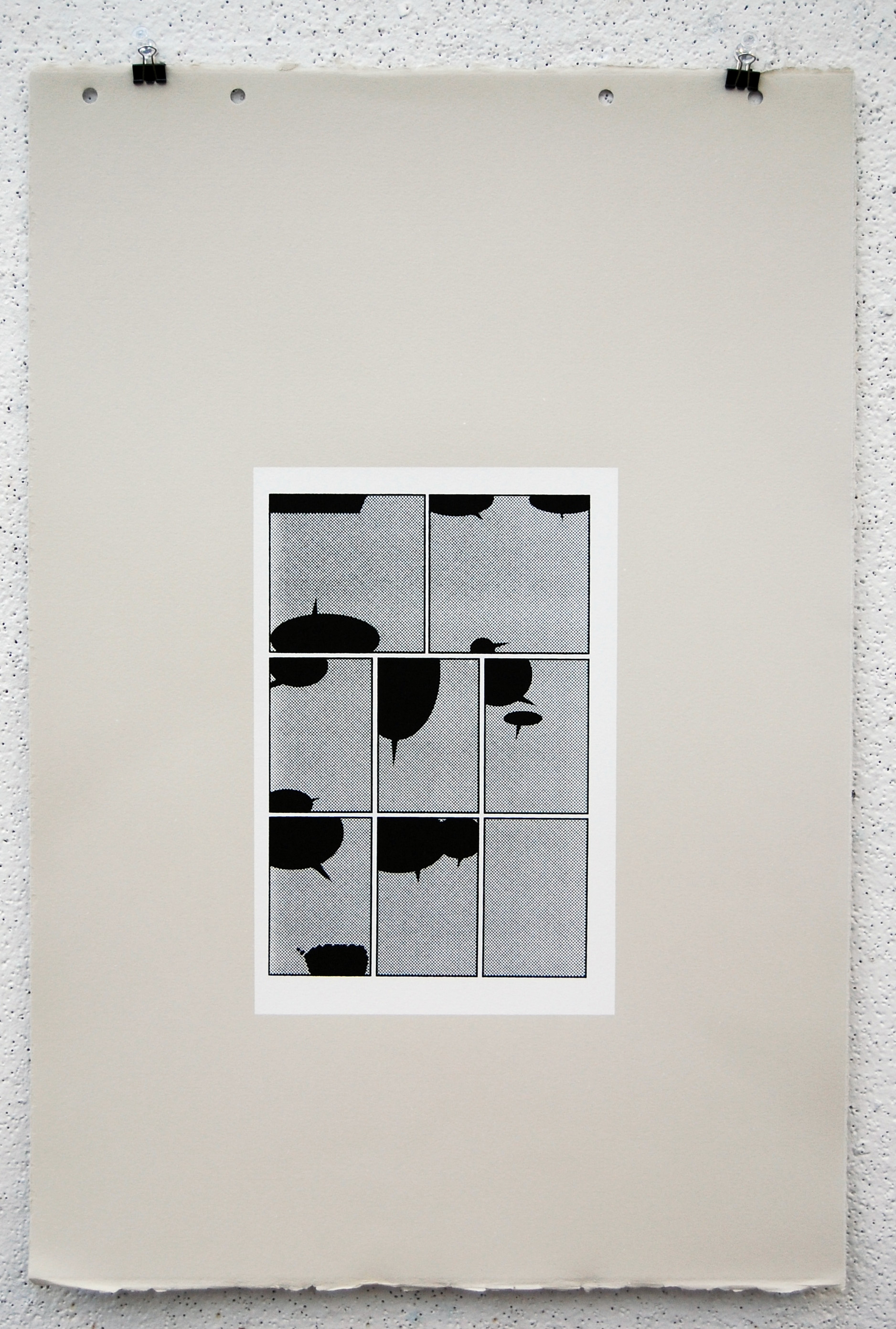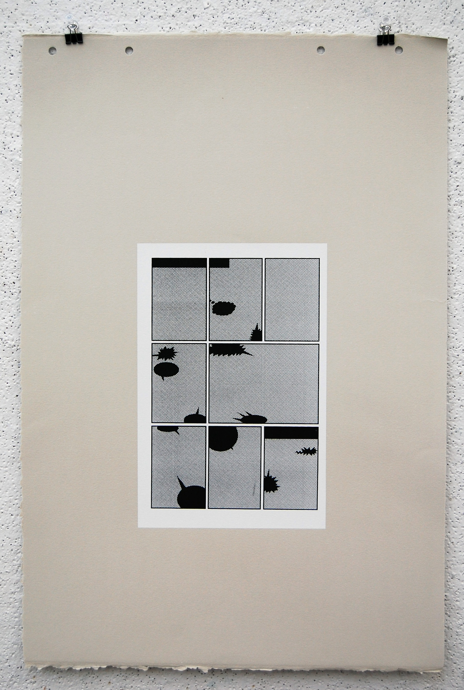 All imagery has been removed with only the frames and solid black talk bubbles remaining. All 23 pages of the original comic is printed with silkscreen on grey BFK.