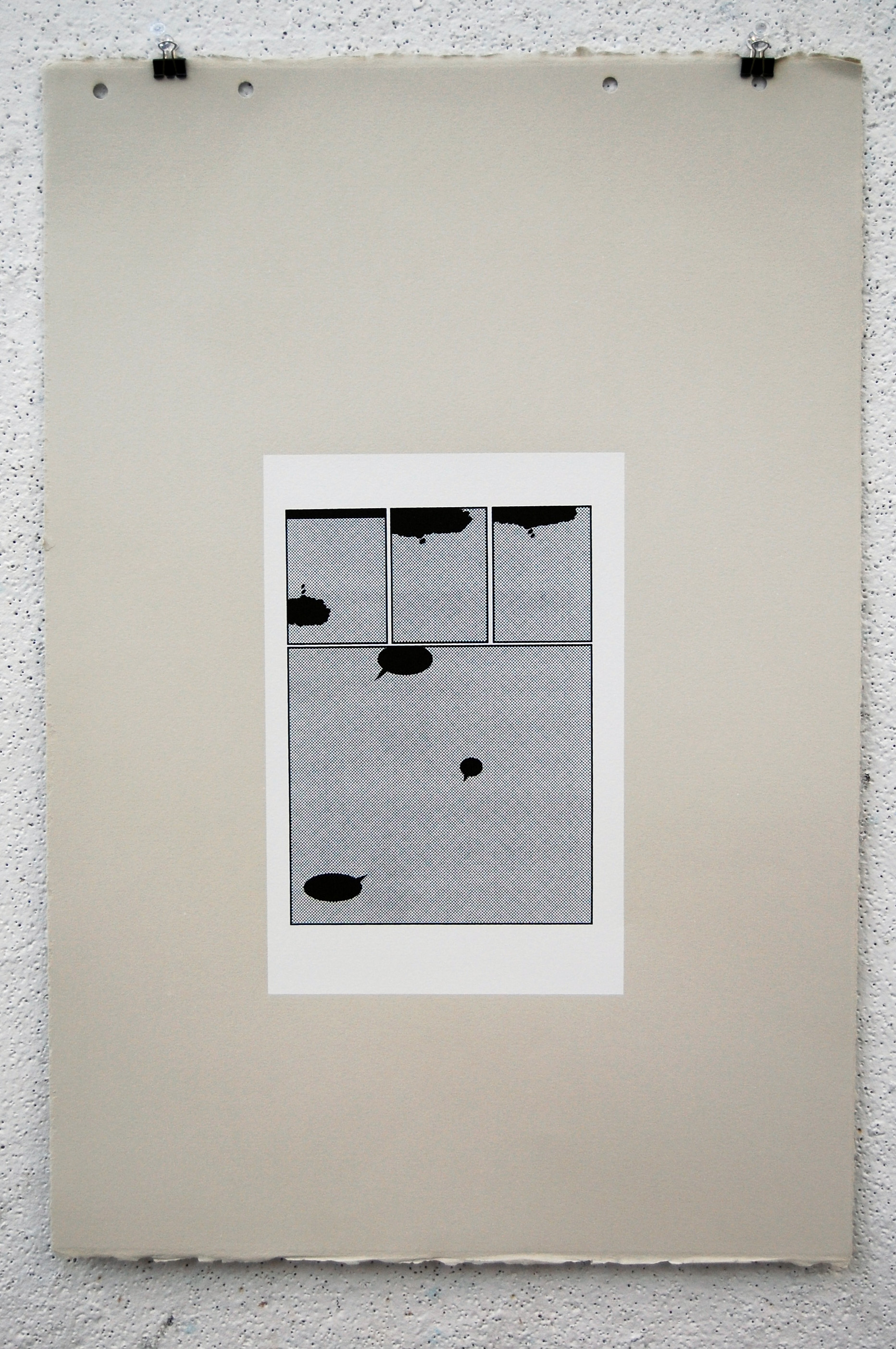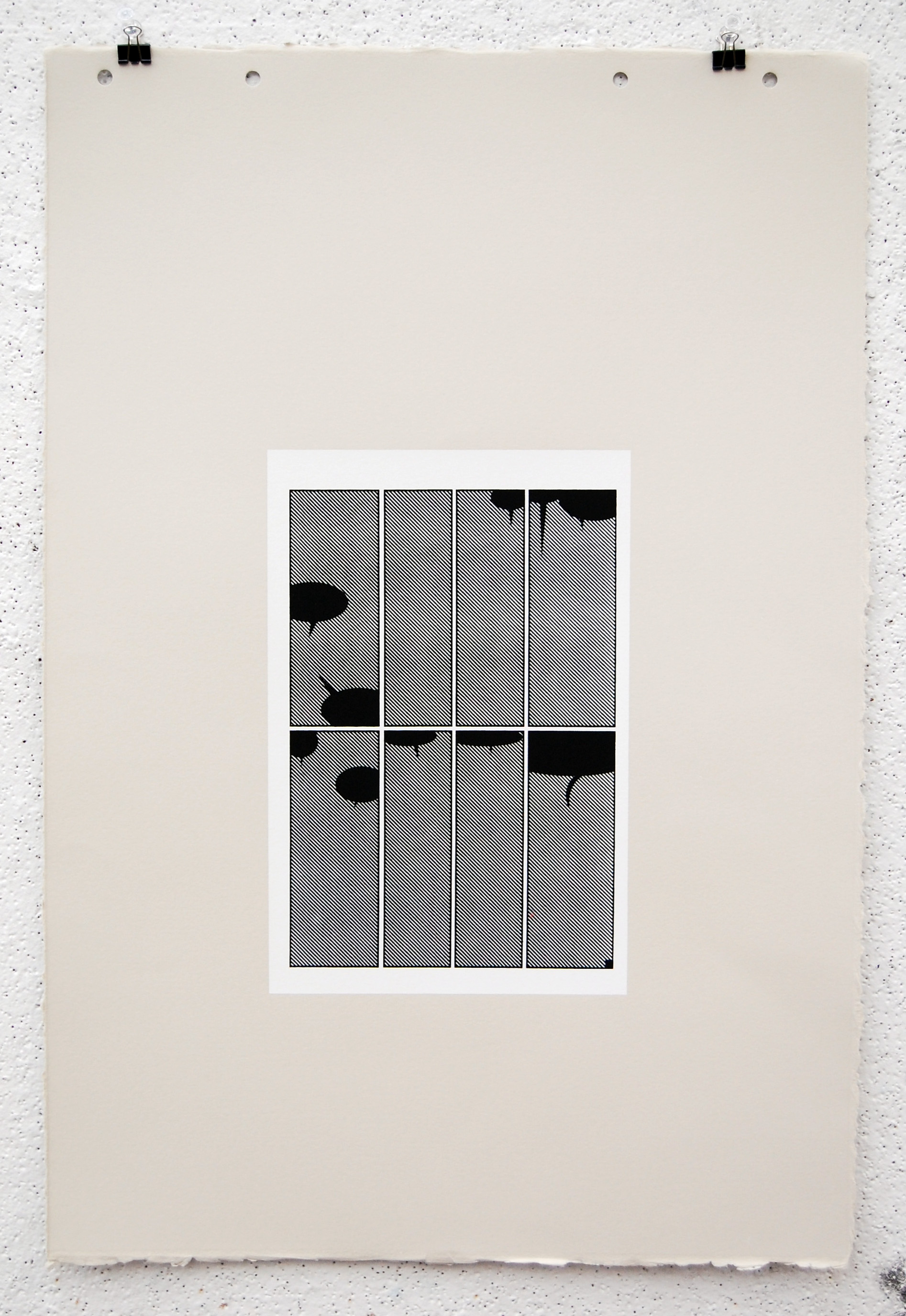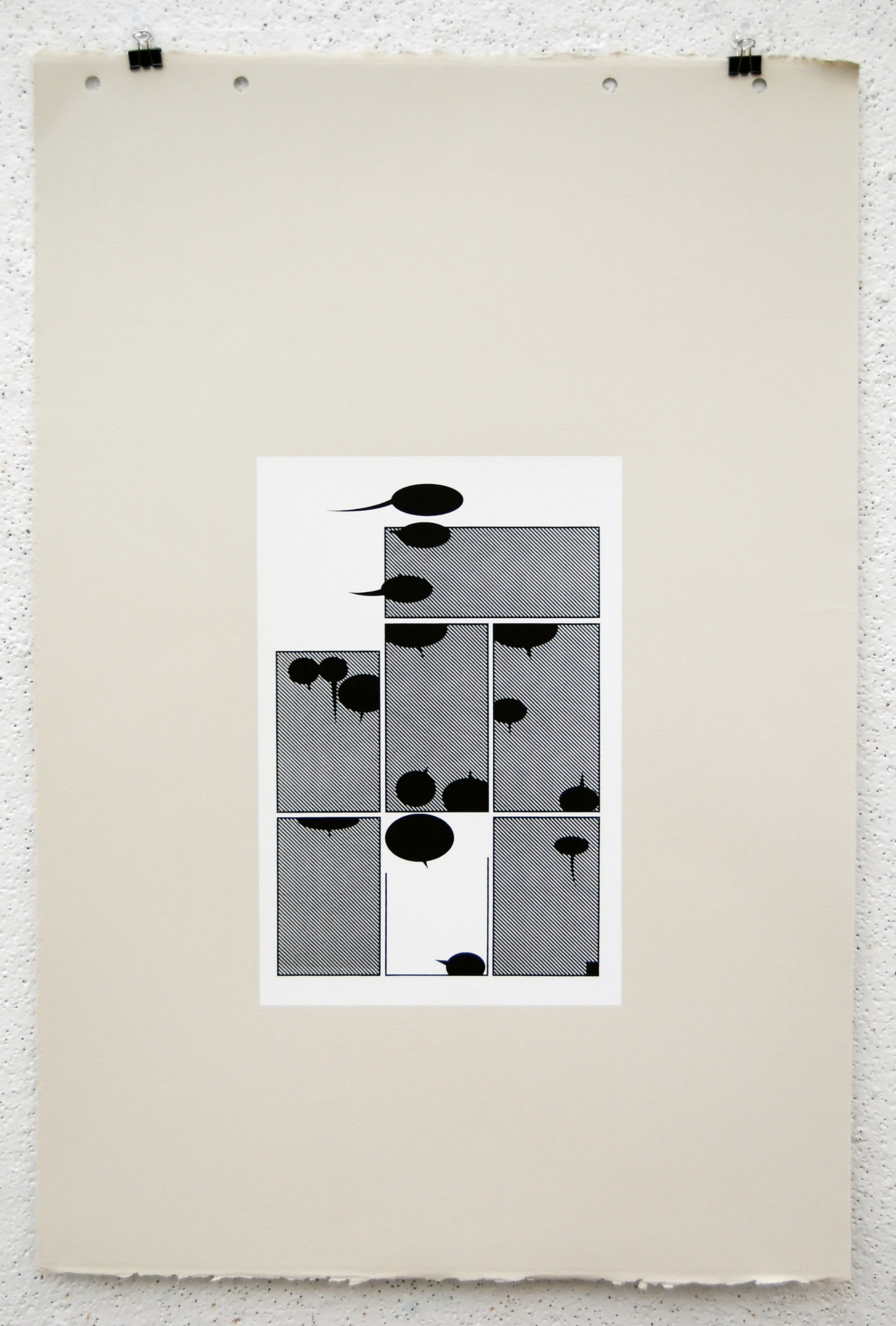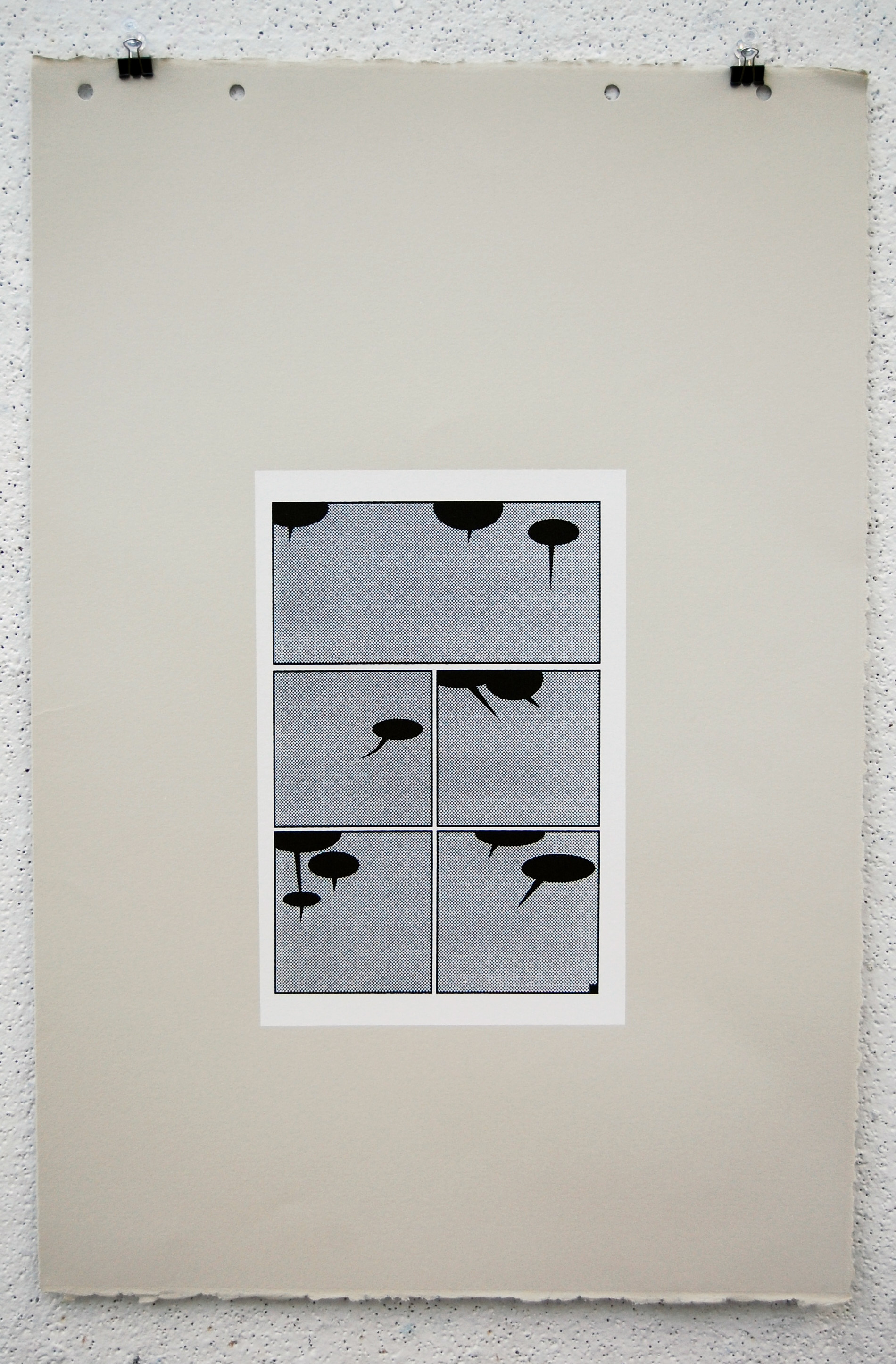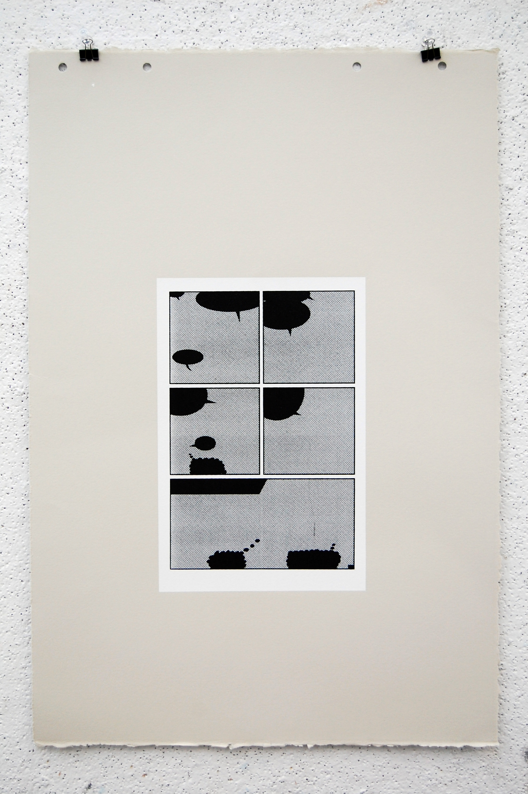 All imagery has been removed with only the frames and solid black talk bubbles remaining. All 23 pages of the original comic is printed with silkscreen on grey BFK.