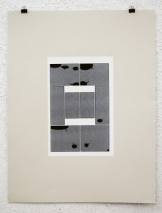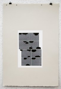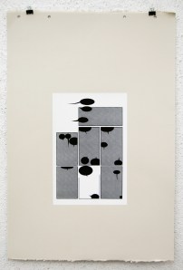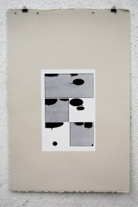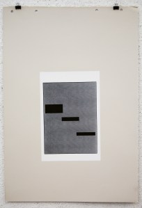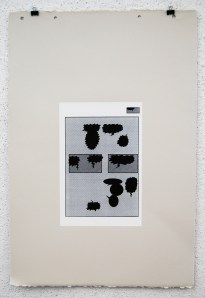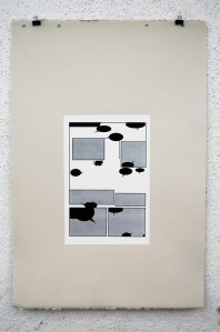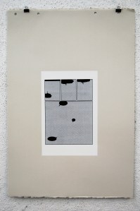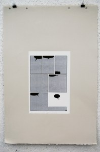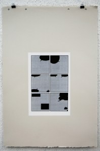 The white rectangle is representative of the original page; 10″x6.5″. I used two halftones in this series; dot and linear. These two halftones coincide with the two story lines that appear in the original book. Pages 1-11 utilize the dot halftone and represents the first story. Page 12 is a transitional page, so that print utilizes both the dot and the linear halftone. Pages 13-23 use the linear halftone and represents the second story.
