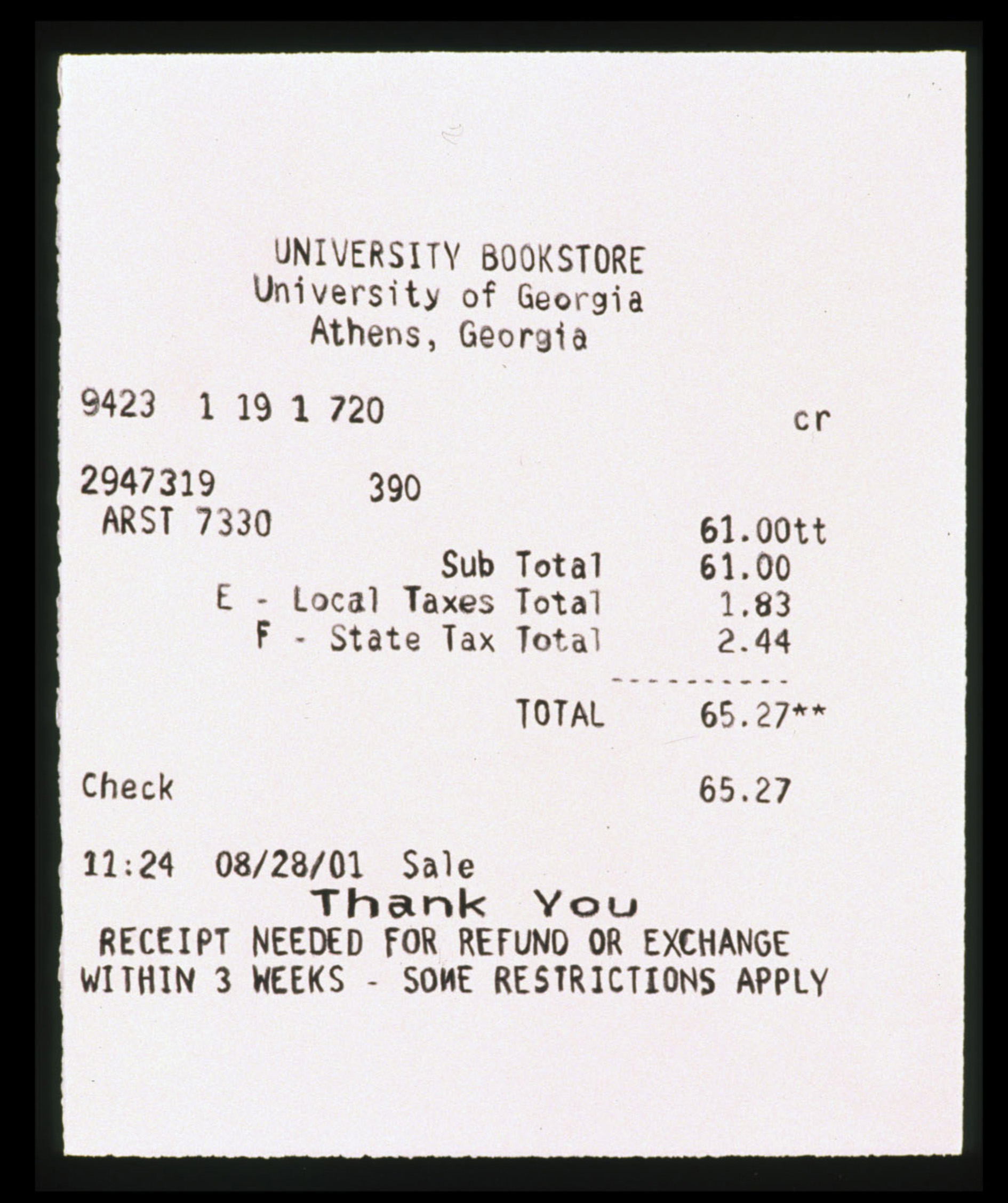 This is the first receipt drawing I ever did while I was a grad student at UGA. While I don’t know the exact date the drawing was made, I know it wasn’t too long after I received the original receipt. It is charcoal and is 20″ by 16″.