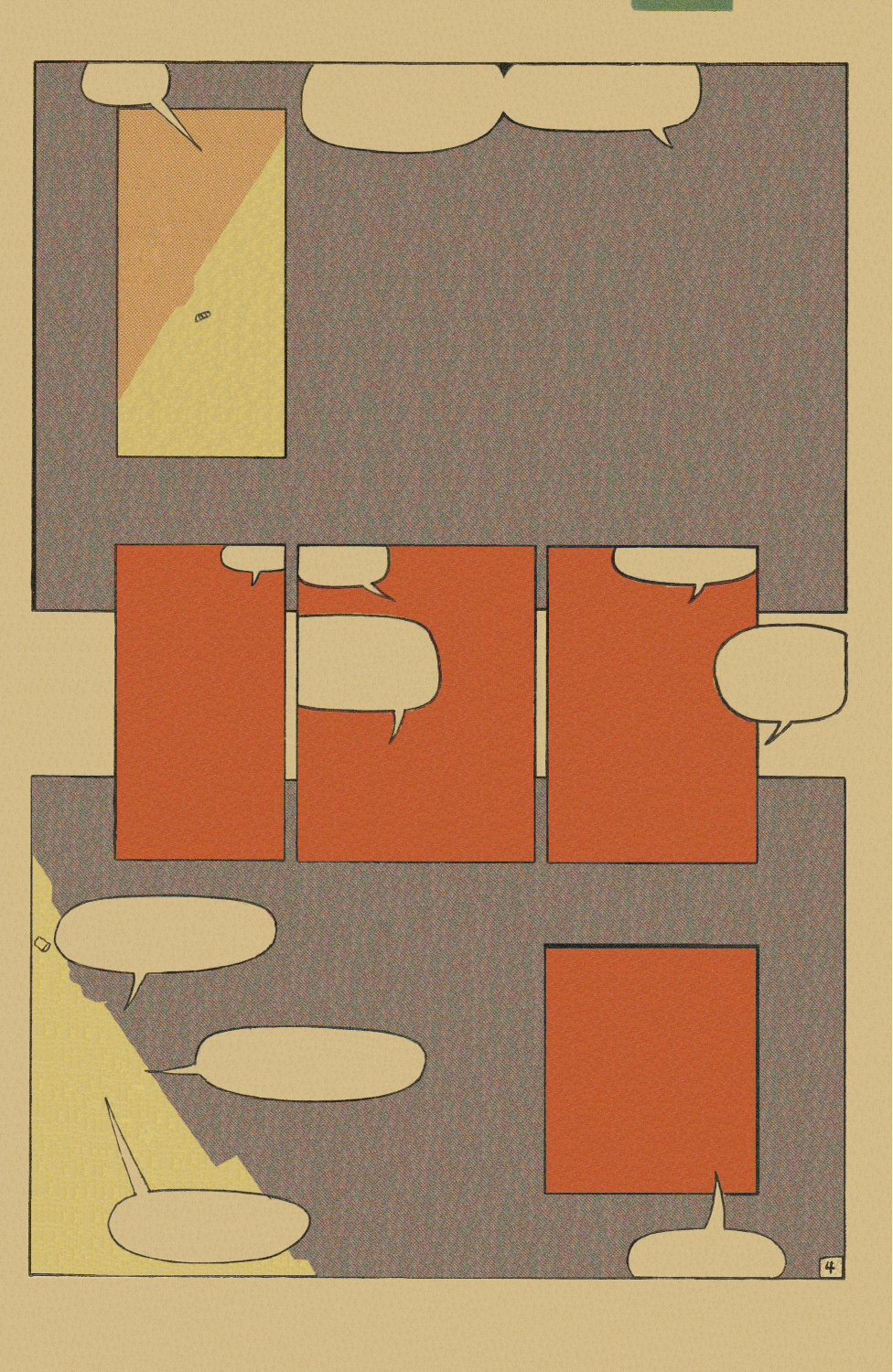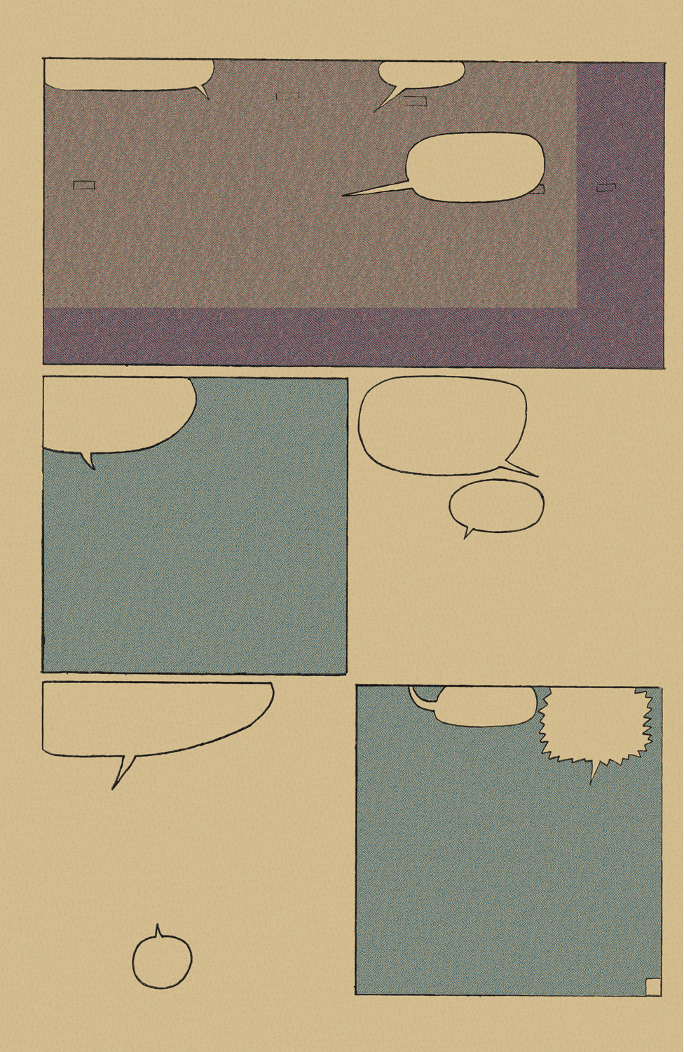 All prints are to scale of the original comic pages. There will be one print for every page, 23 in all. All information has been removed, except for the dominant background color and the talk/thought bubbles, which are left blank.