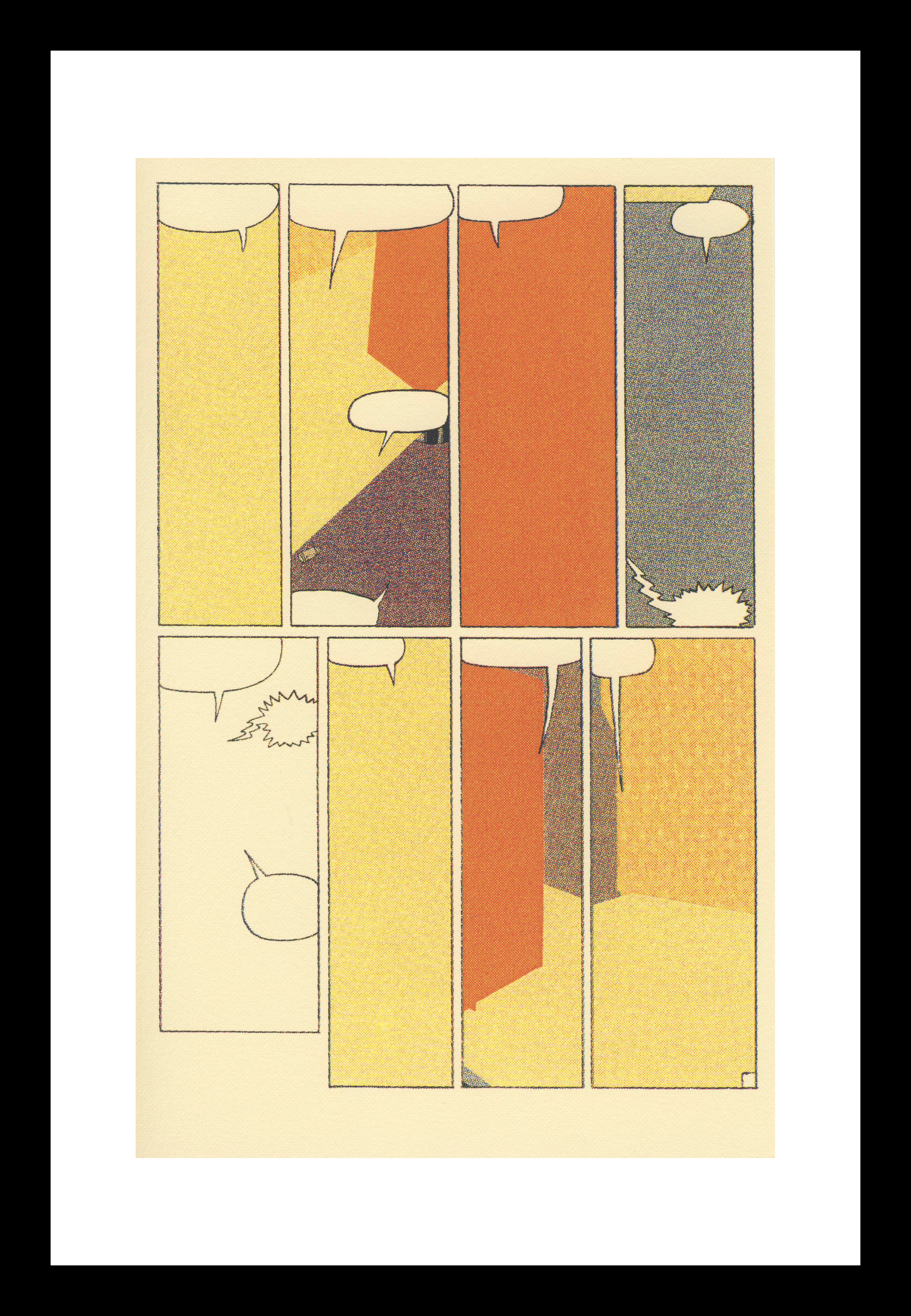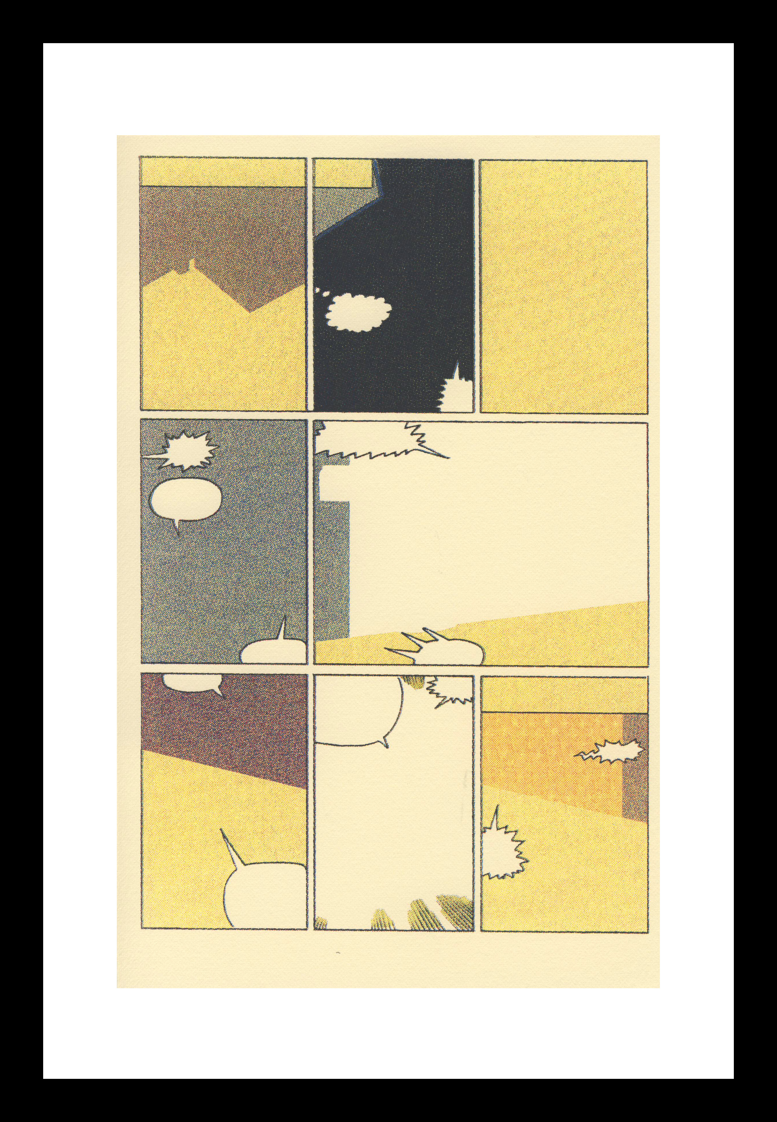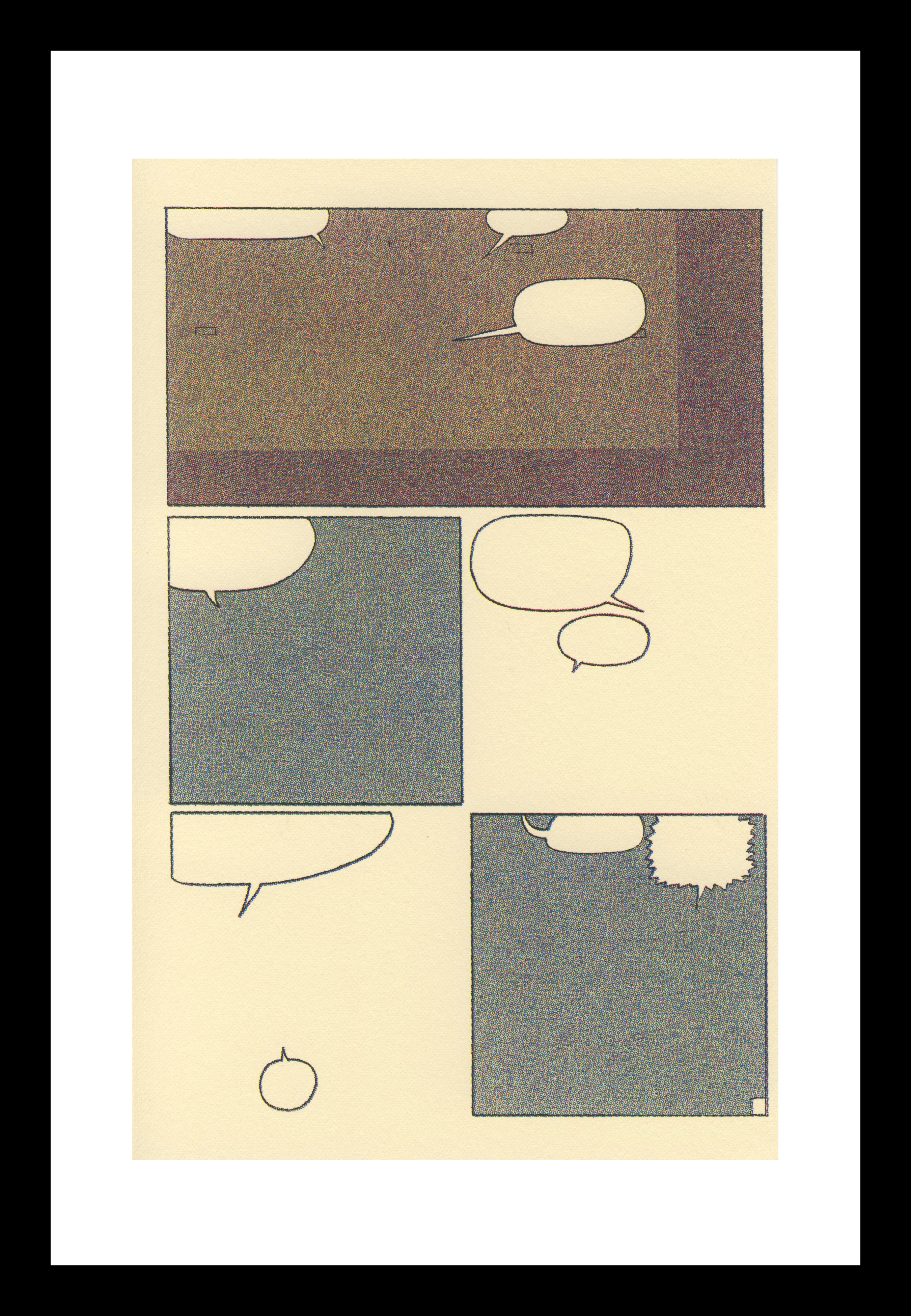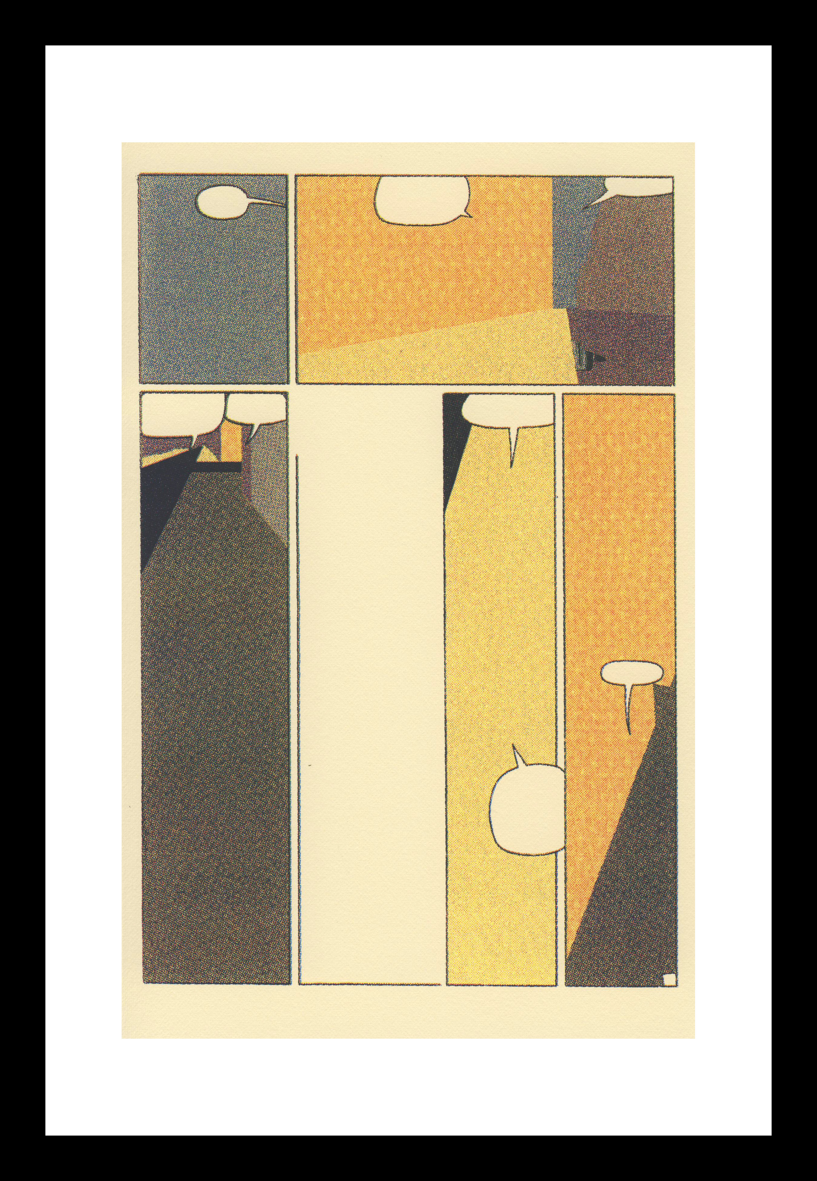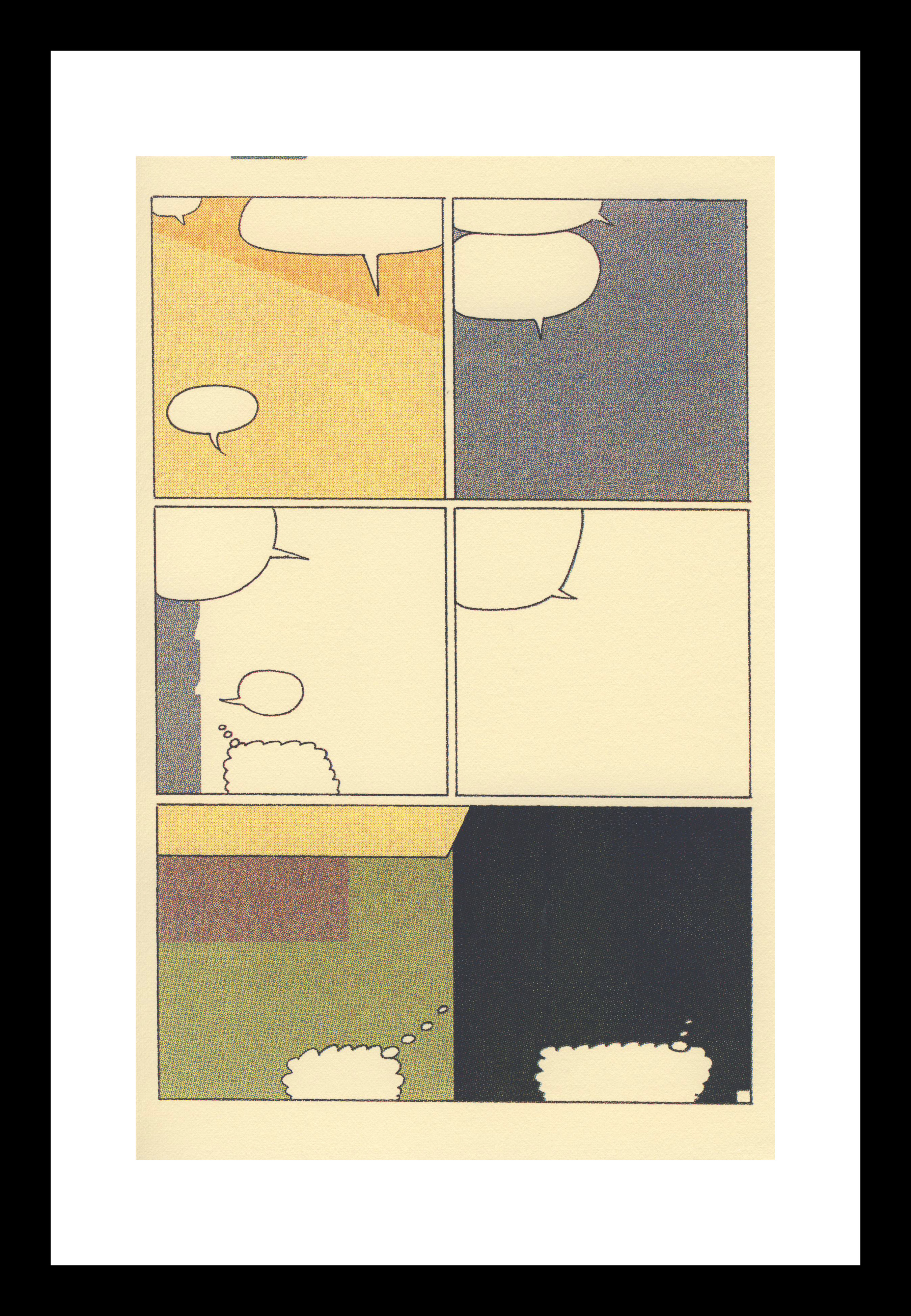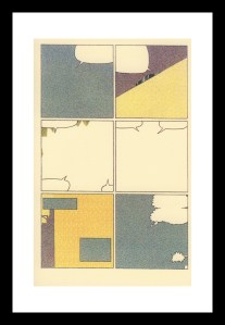 All imagery is removed, and only the dominant background color(s) remain. In order to achieve this effect, I only use the color scanned from the original pages. I had to digitally cut and paste small parts of the original halftones in order to create seamless color. Each print is 10″x6.5″, the same size as the original, printed on tan BFK paper then mounted on white BFK.