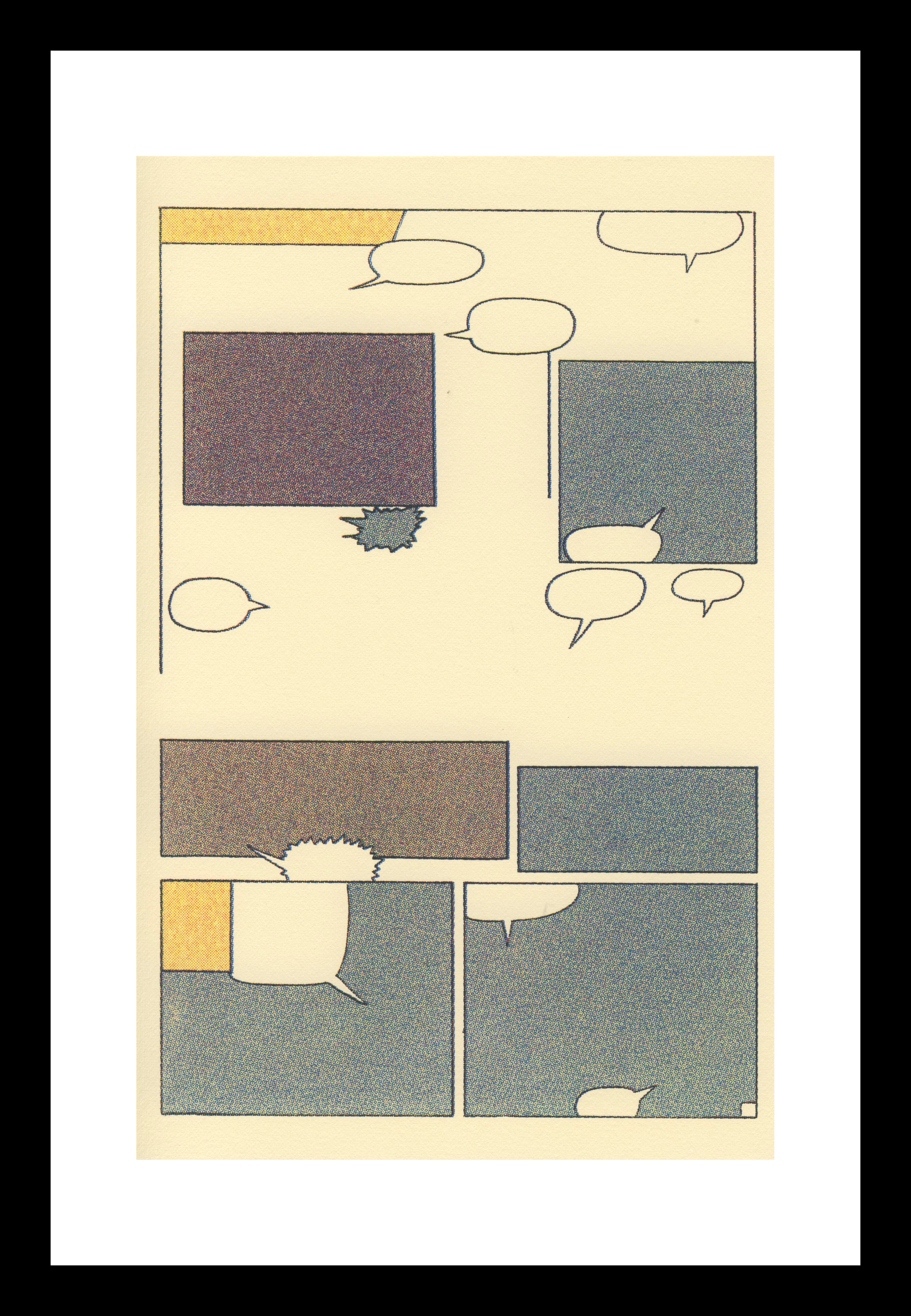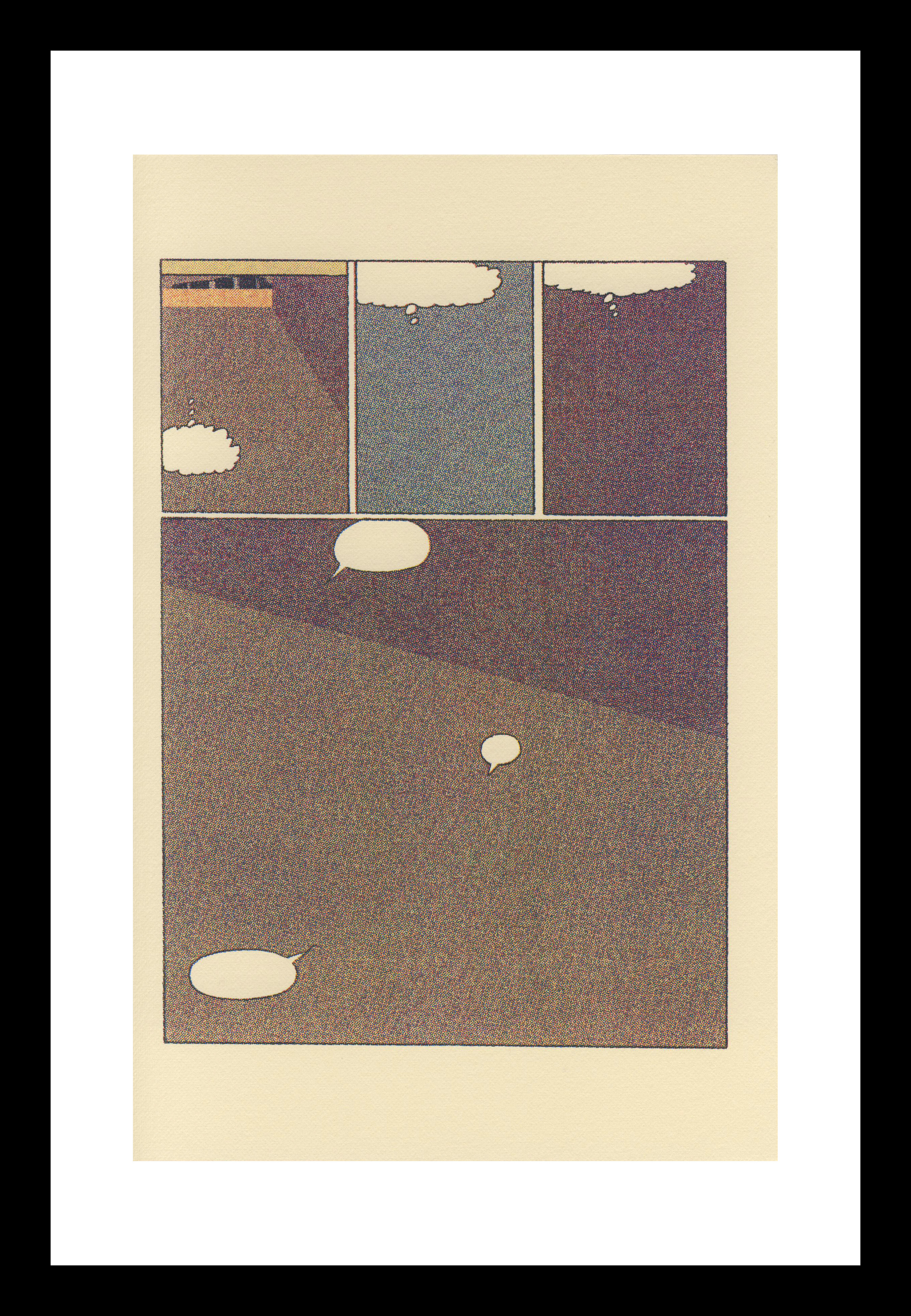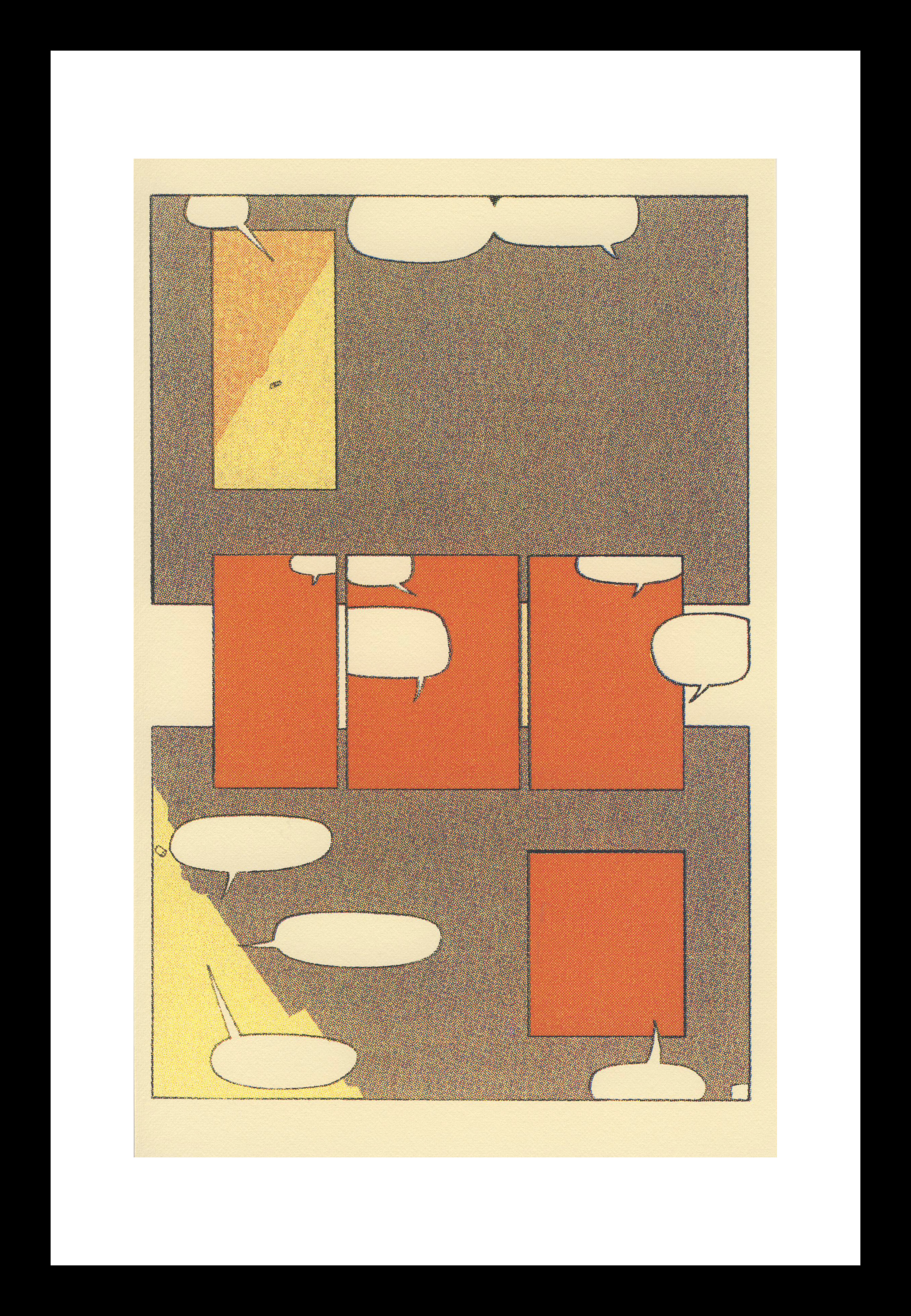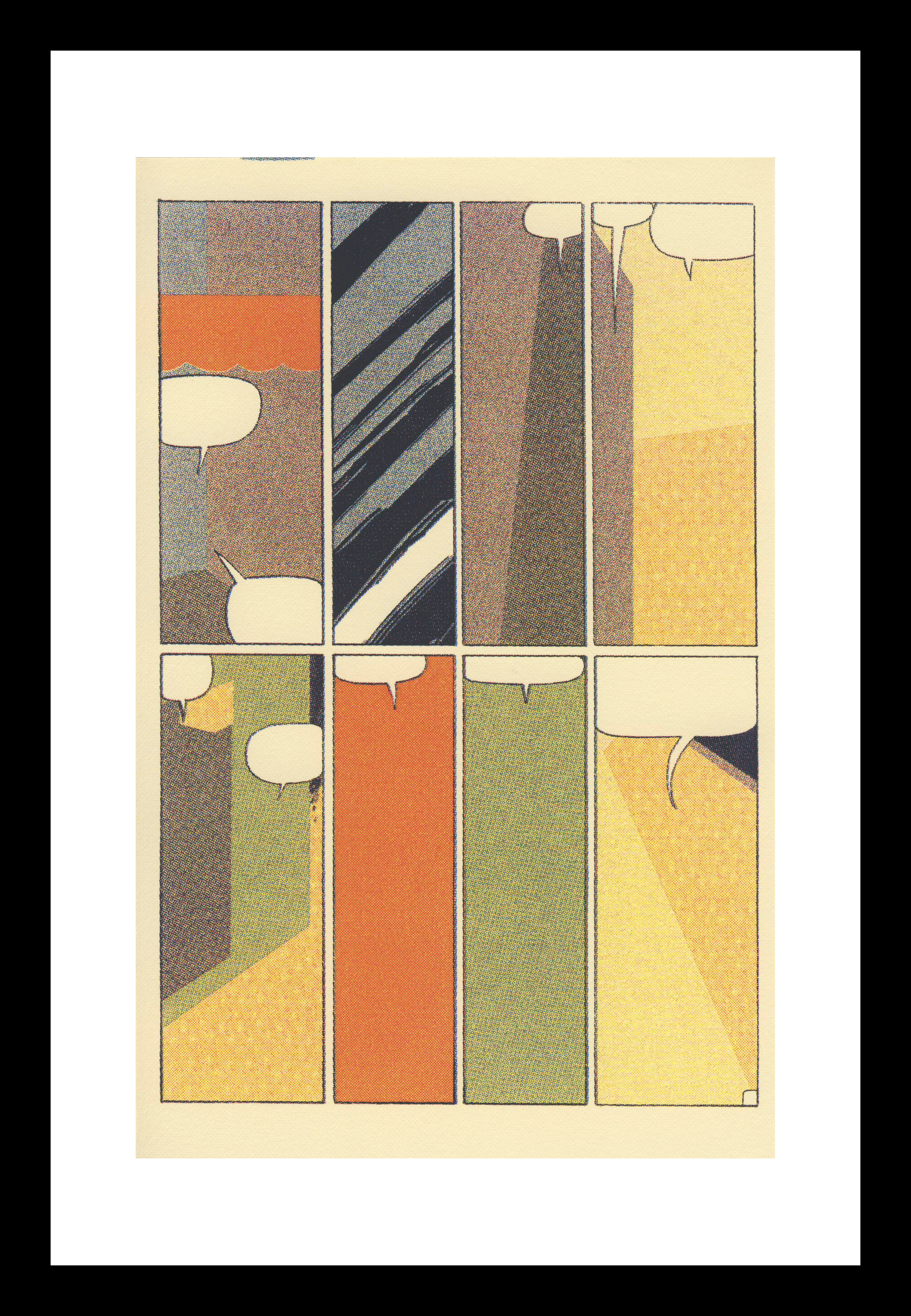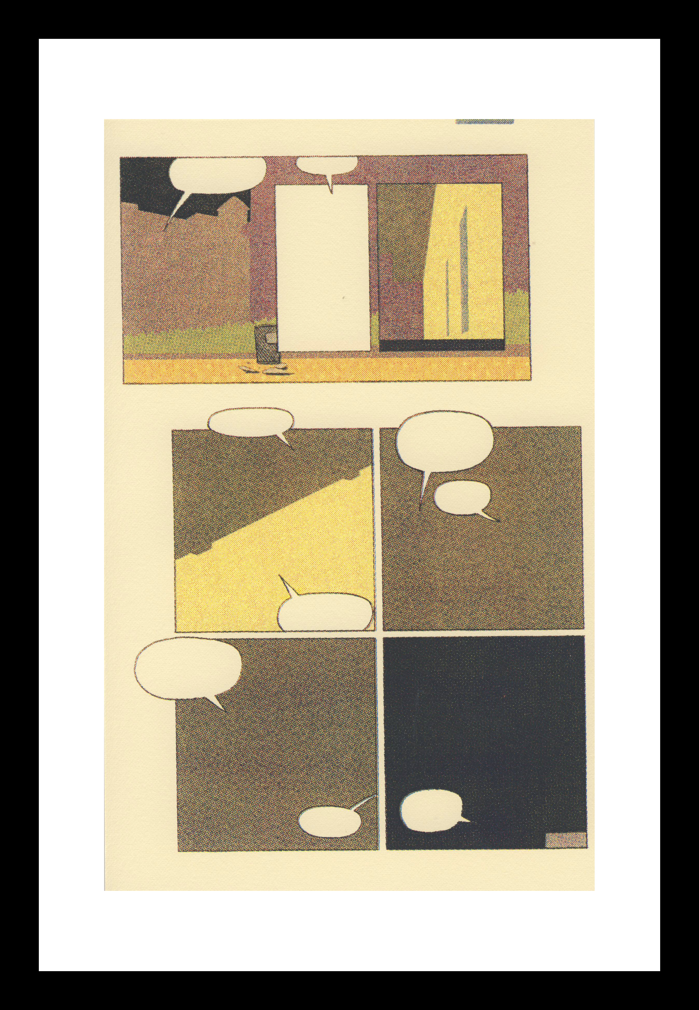 All imagery is removed, and only the dominant background color(s) remain. In order to achieve this effect, I only use the color scanned from the original pages. I had to digitally cut and paste small parts of the original halftones in order to create seamless color. Each print is 10″x6.5″, the same size as the original, printed on tan BFK paper then mounted on white BFK.