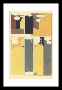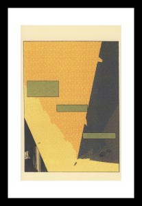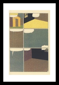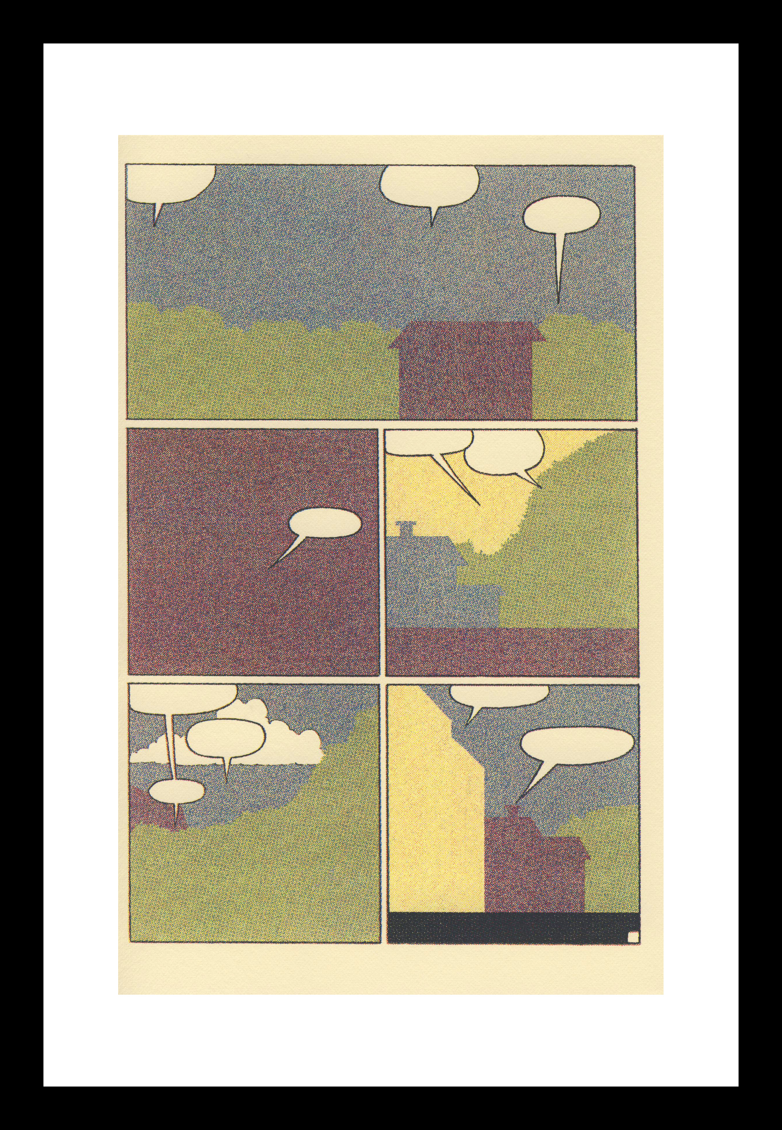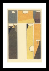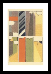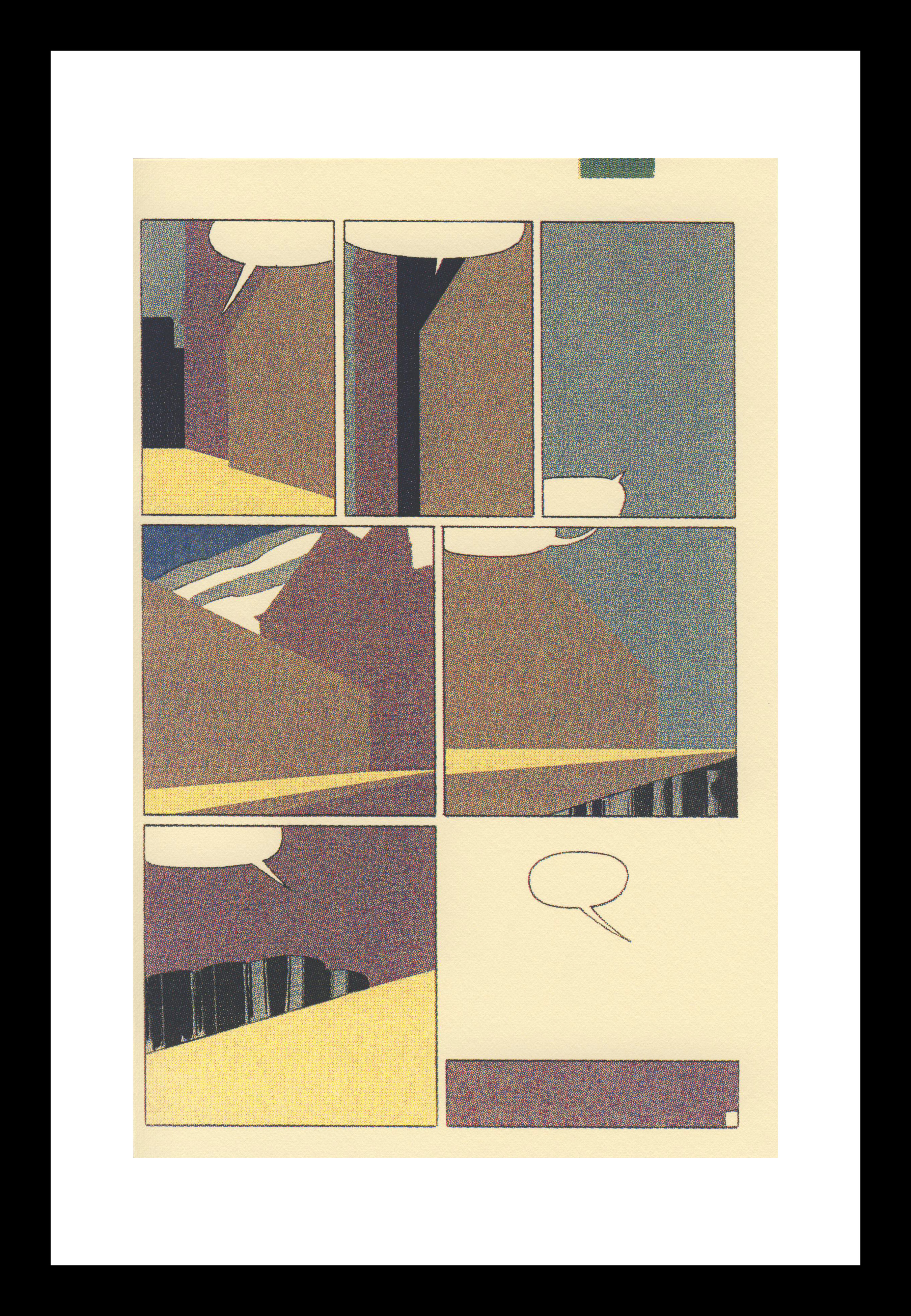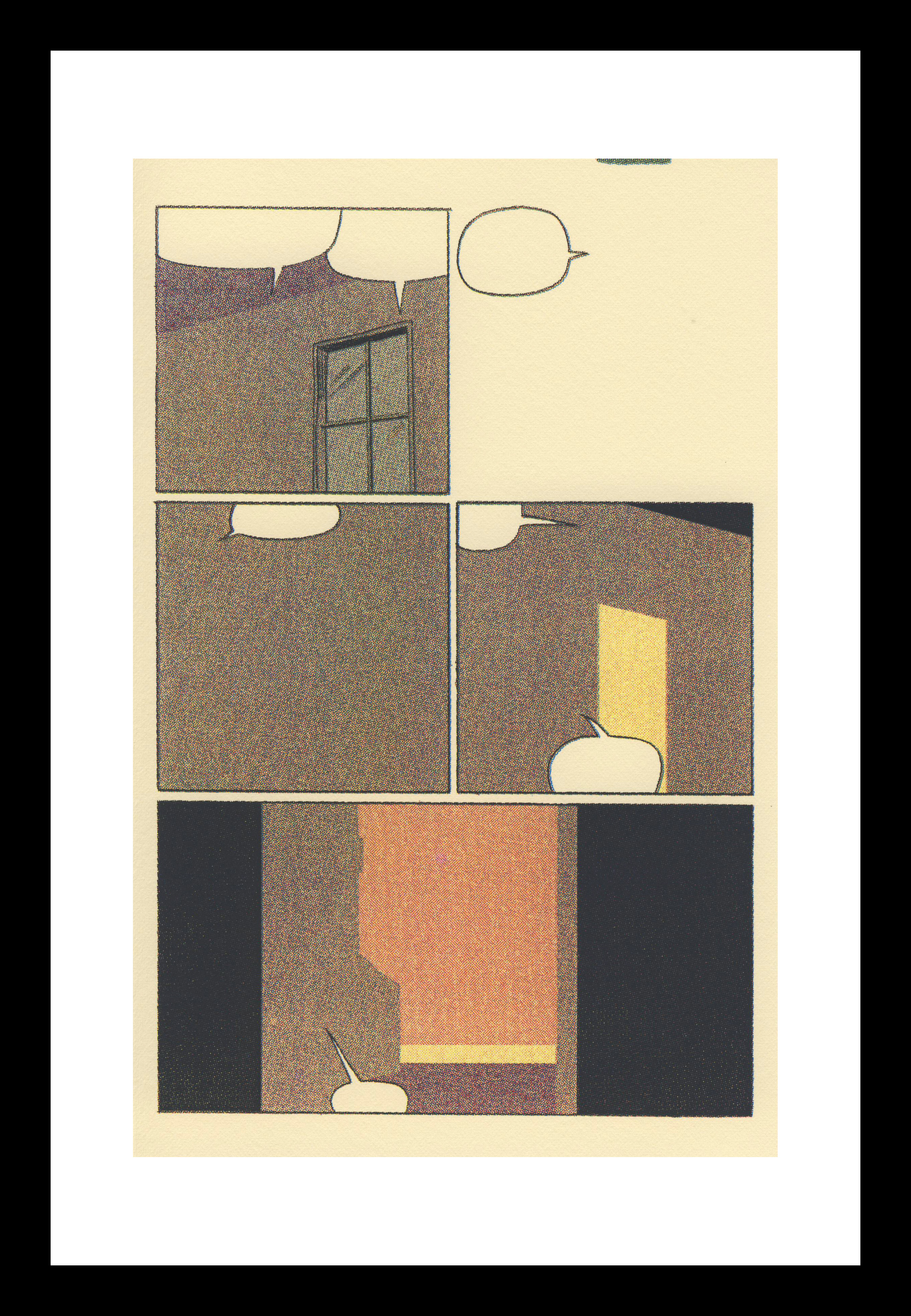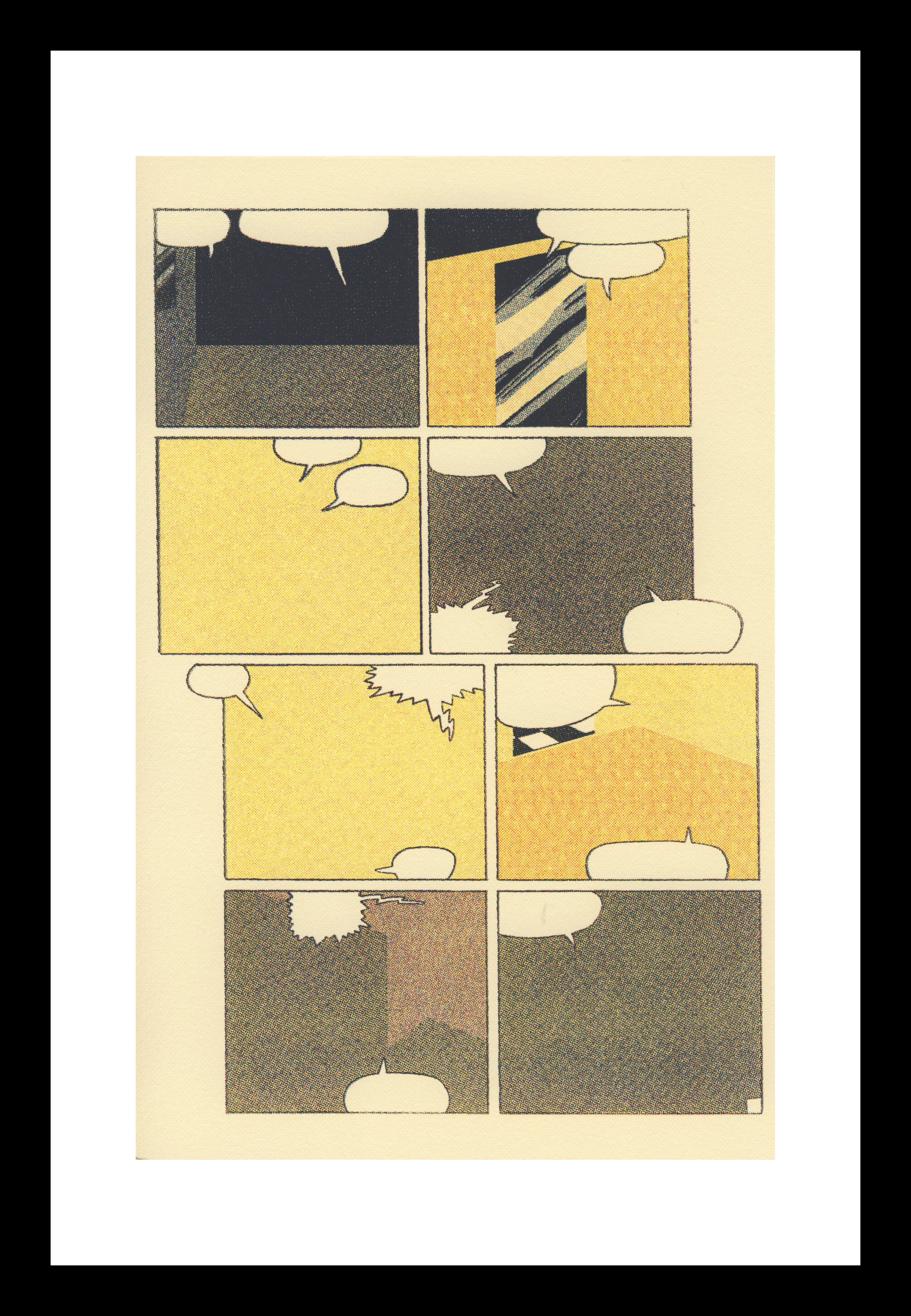 All imagery is removed, and only the dominant background color(s) remain. In order to achieve this effect, I only use the color scanned from the original pages. I had to digitally cut and paste small parts of the original halftones in order to create seamless color. Each print is 10″x6.5″, the same size as the original, printed on tan BFK paper then mounted on white BFK.