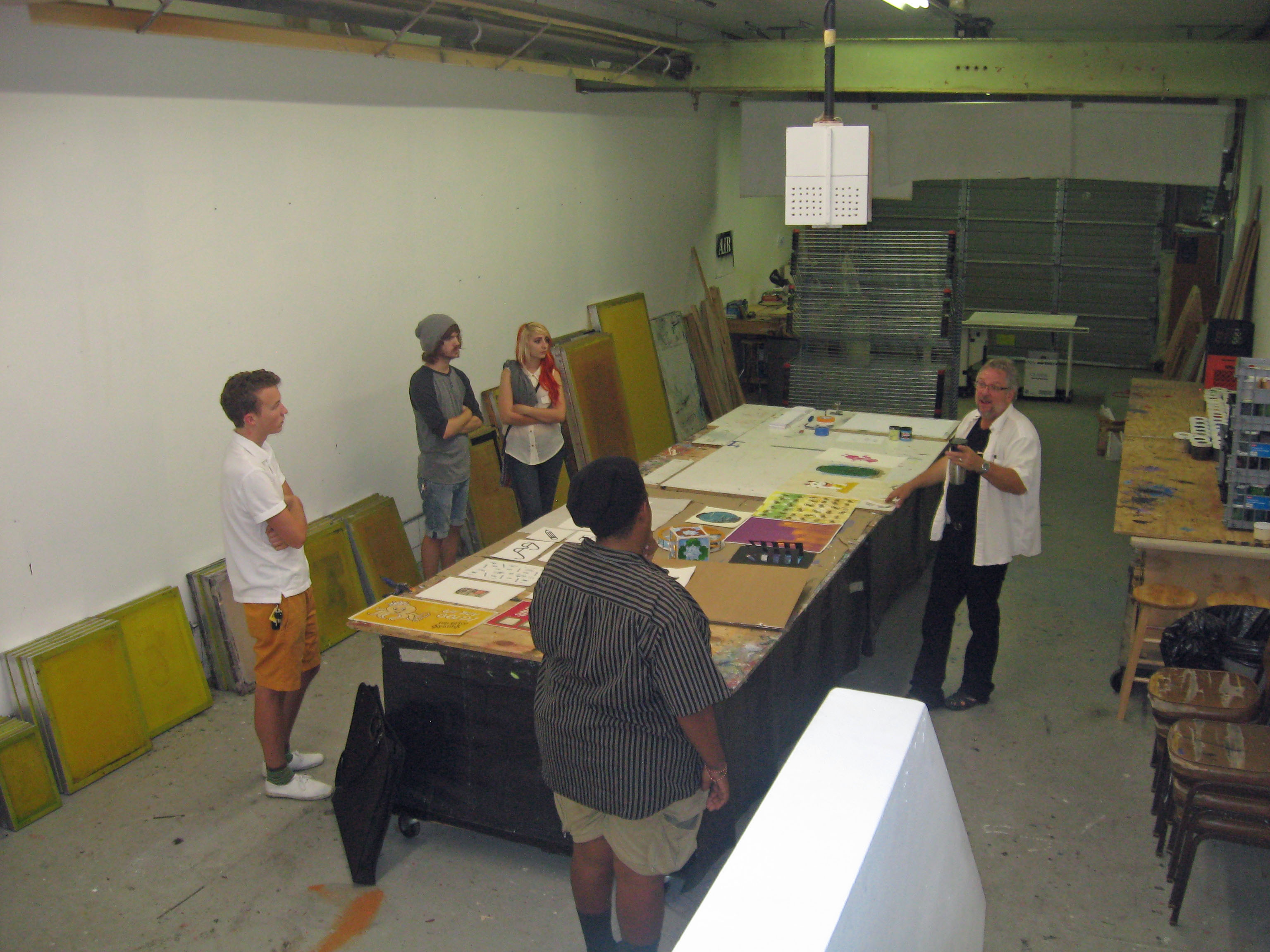 AIR Director Robert Beckman tellin’ it straight to WVU Printmakers Cassandra Delimon, Jordan Welsch, Alex and Sam…