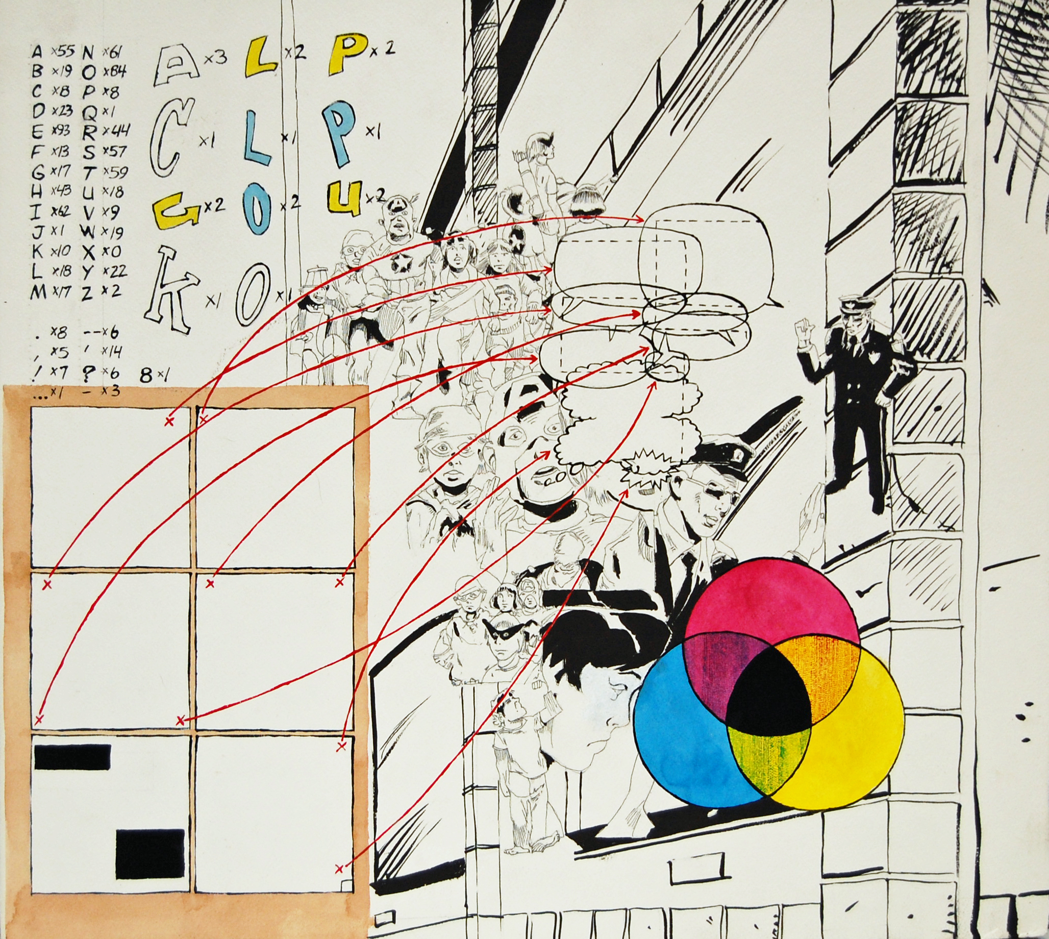 The following are images of the work, shown in the order they were displayed, next to the original comic page they were assigned.