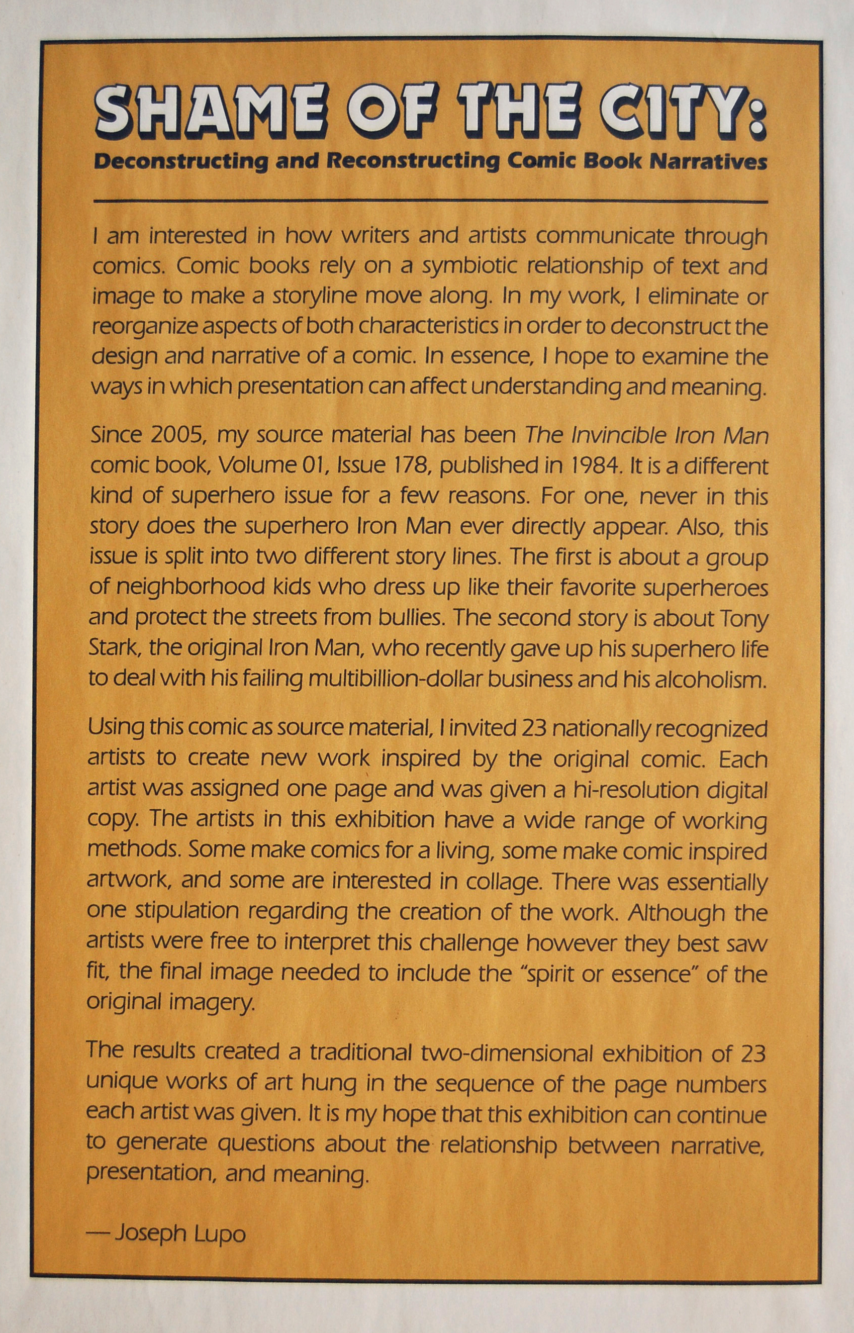 This exhibition featured 23 artists from all over the country (and Canada). Every artist was assigned a page from the “Iron Man” comic I have been working with and was asked to make new work inspired by the original artwork.