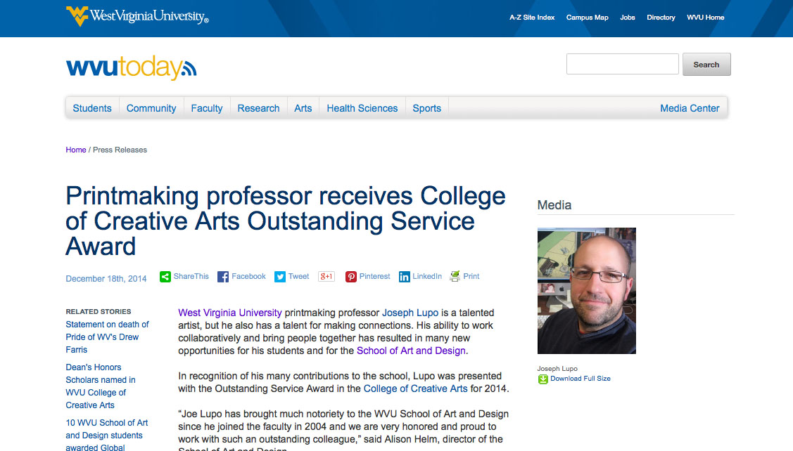 This semester I was given the College of Creative Arts Outstanding Service Award. The award was given for my recent service to the School of Art and the profession.
