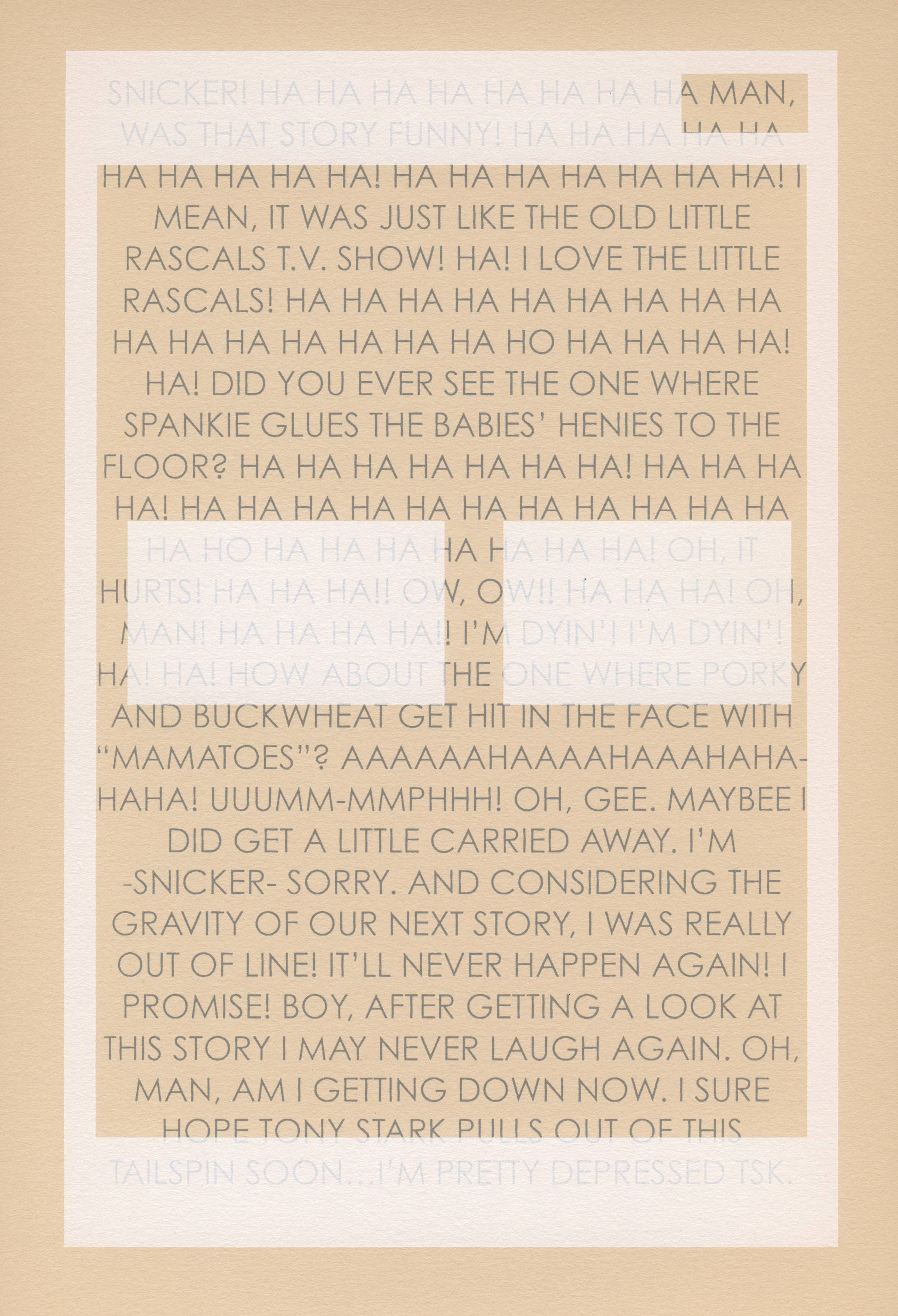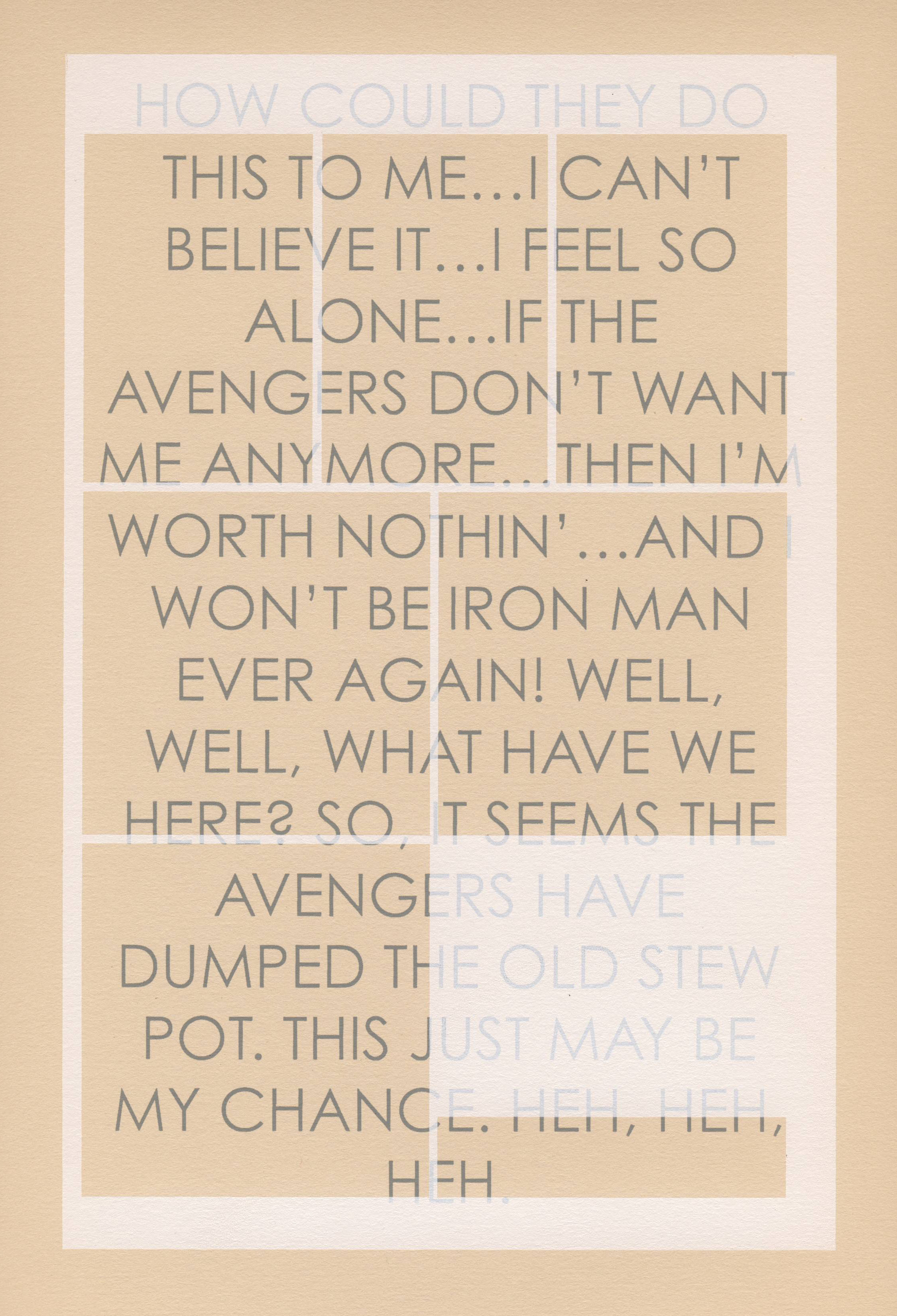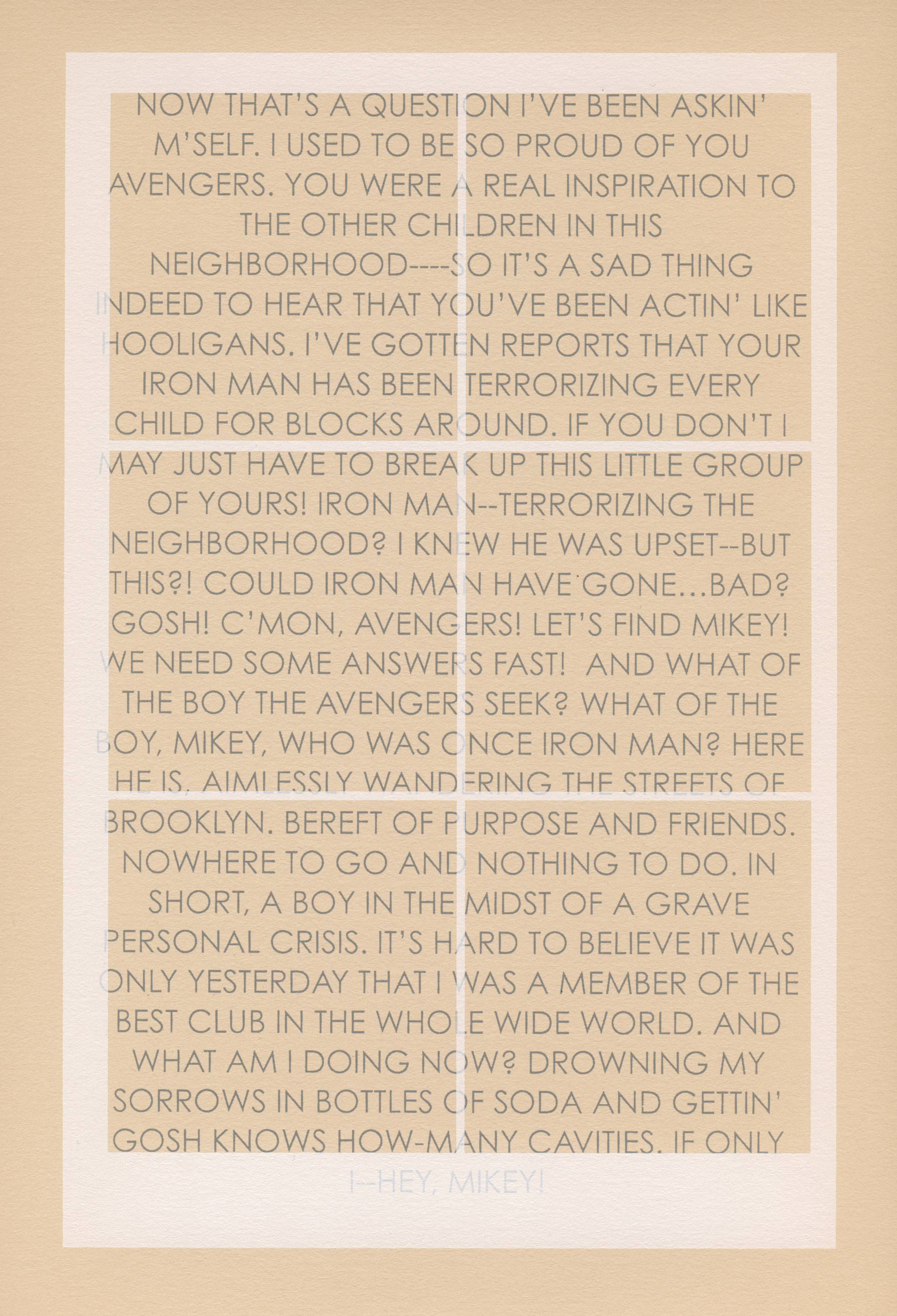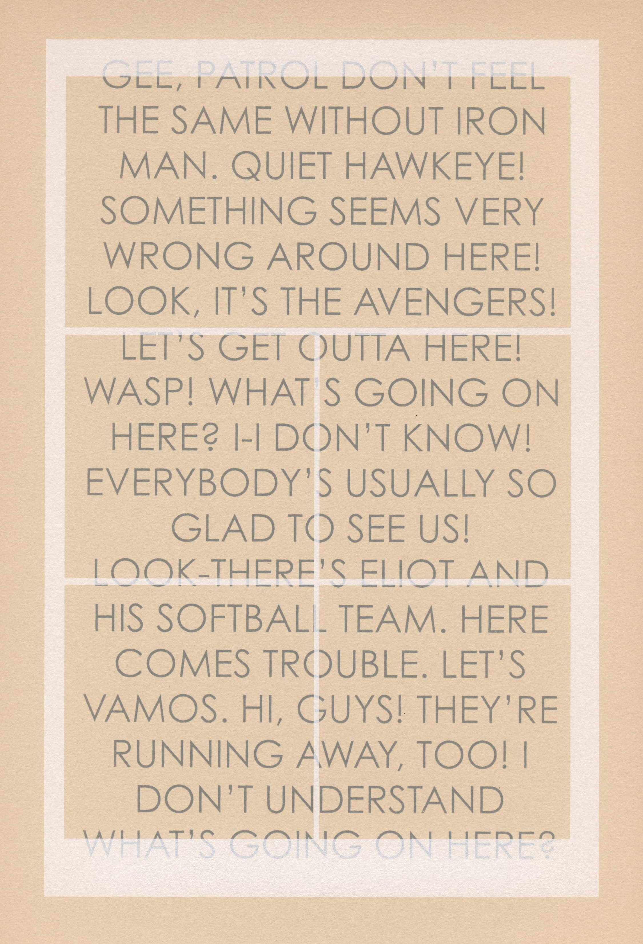 This series is similar to an earlier series of black and white prints and CMYK prints using the entire page of the comic. All imagery is removed, and the panel compositions of each page are combined with the text from that corresponding page. Each print is 10″x6.5″, the same size as the original, printed on tan stonehenge.