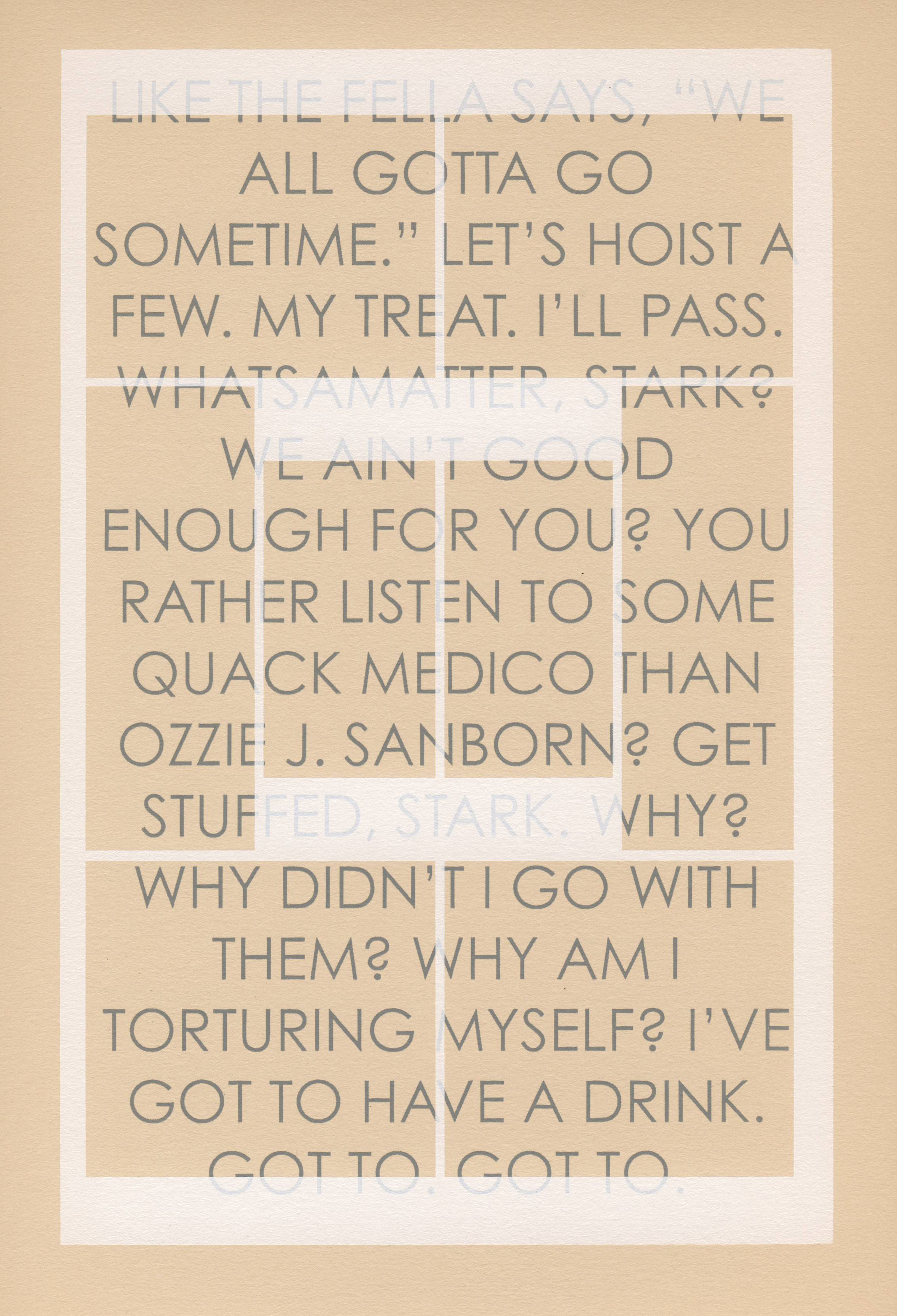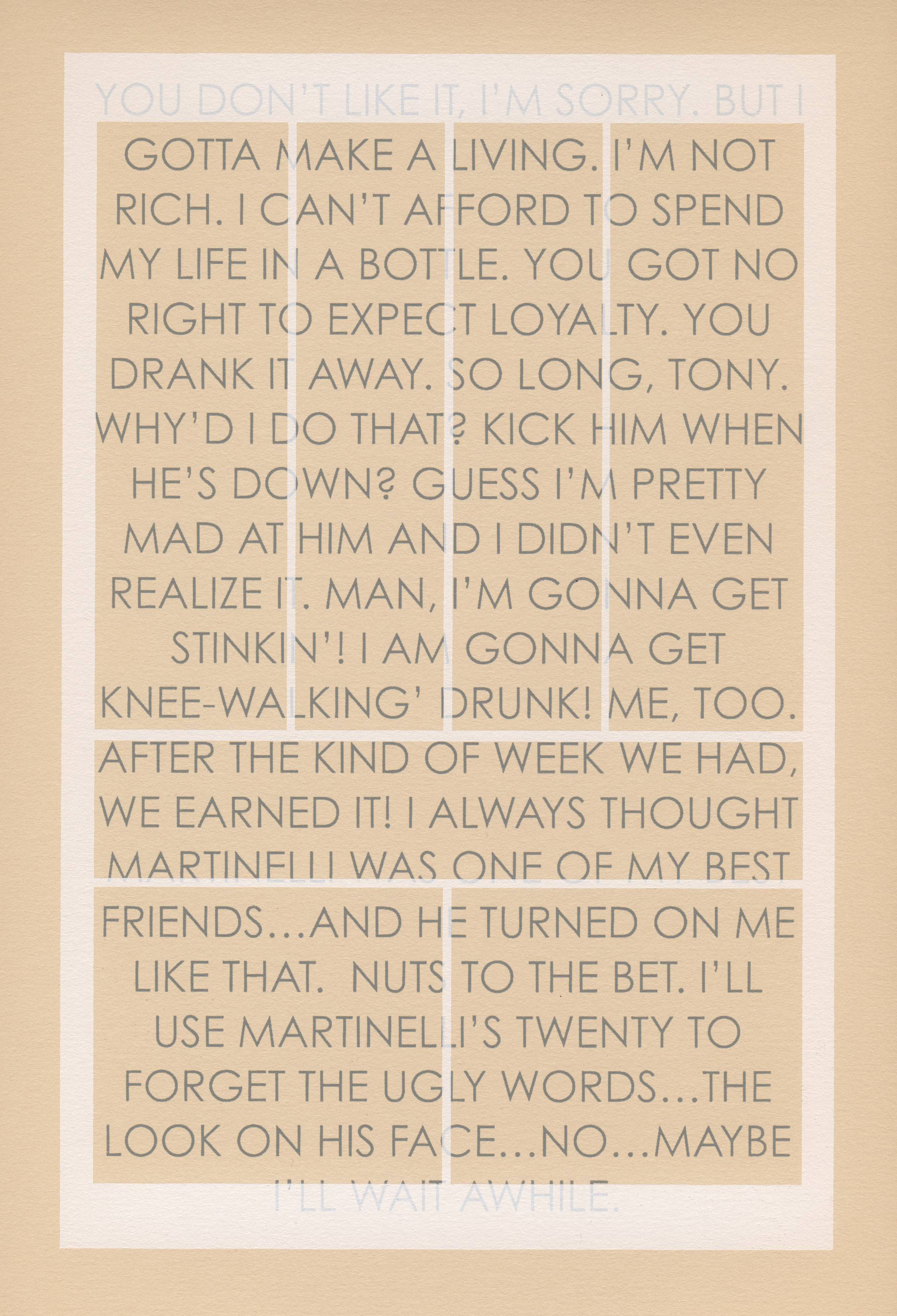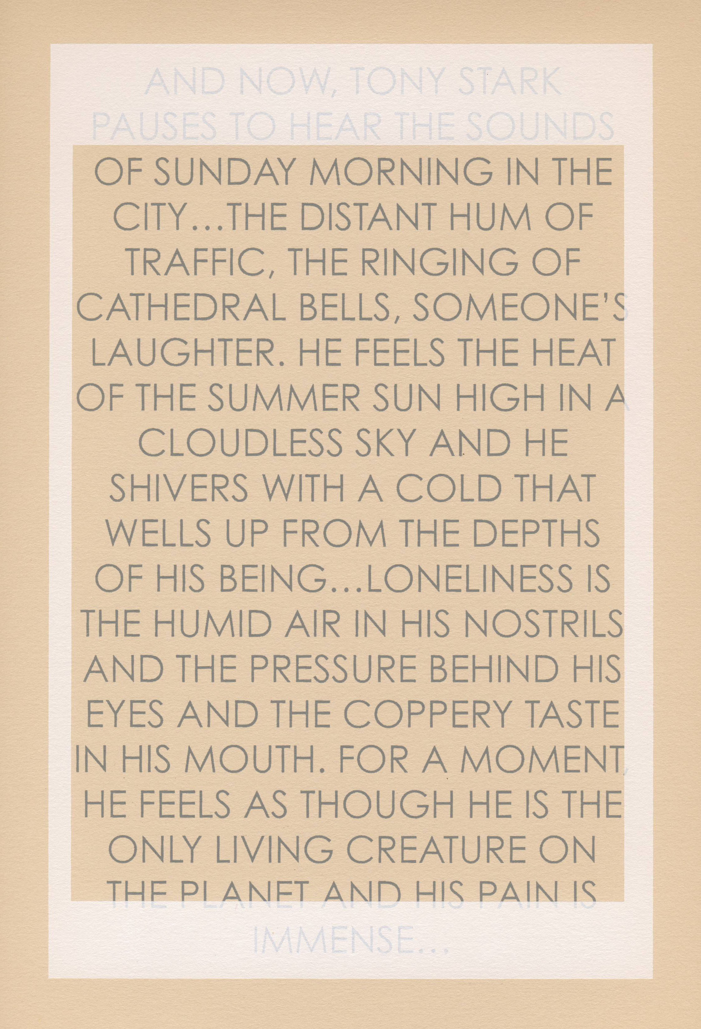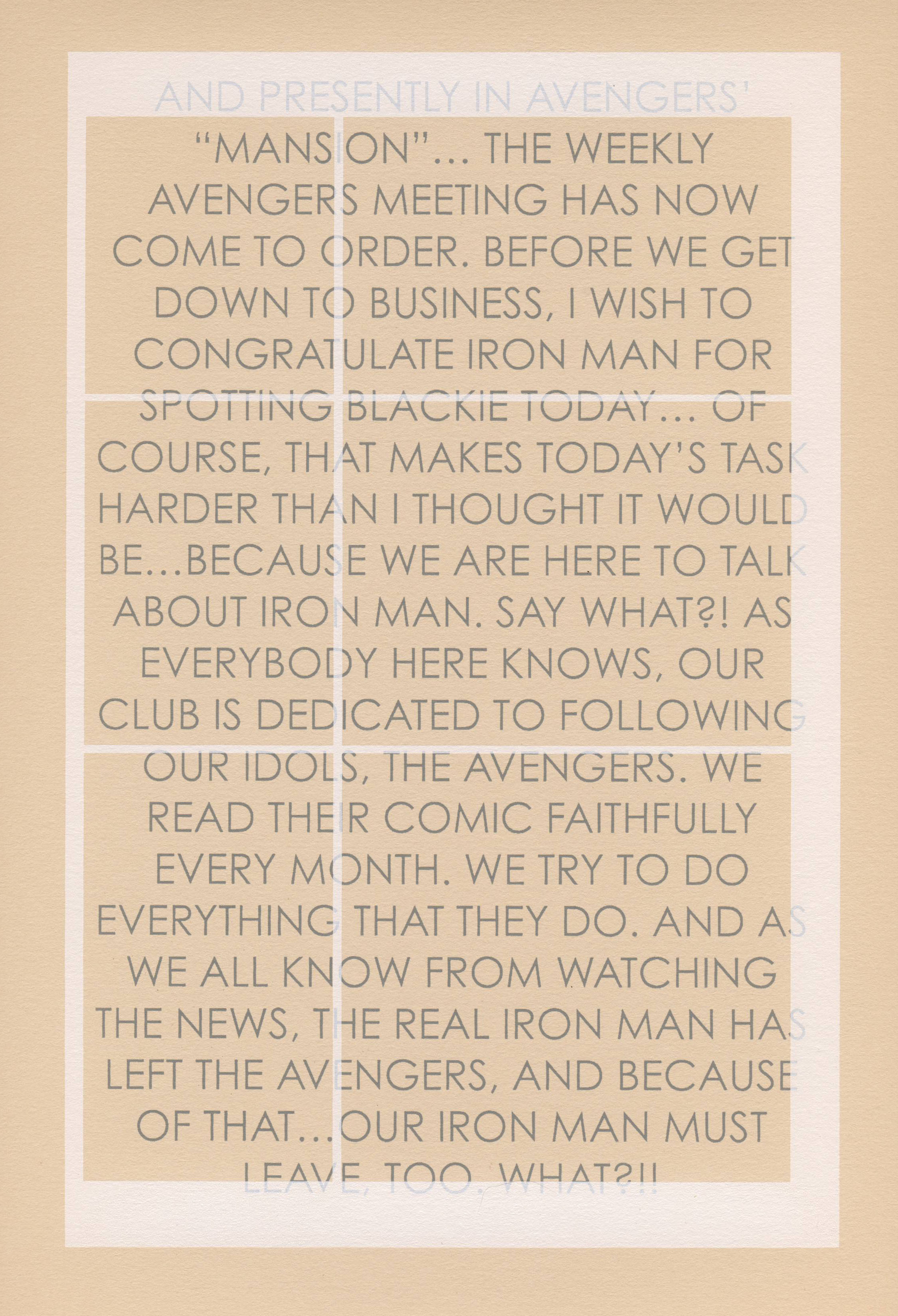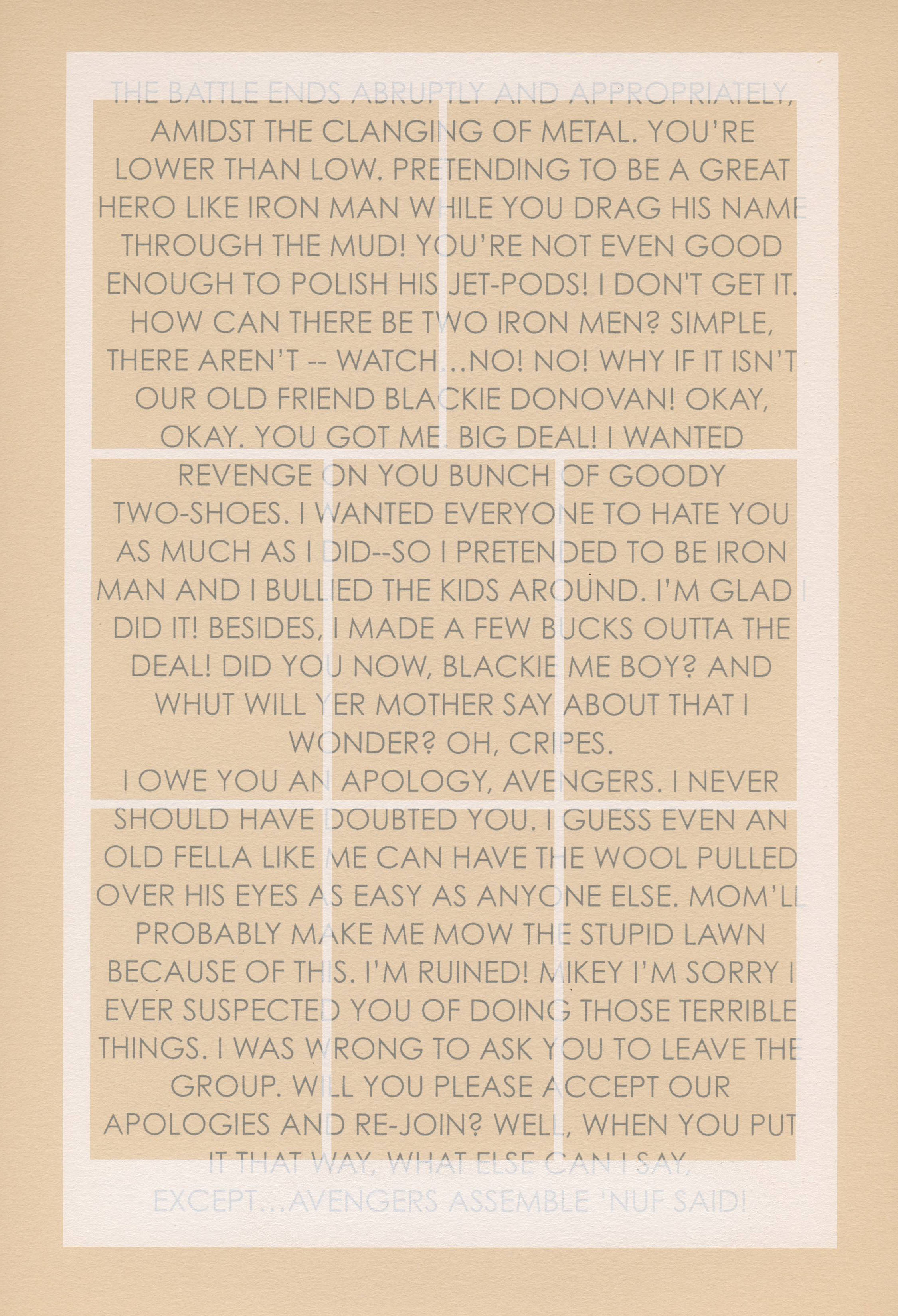 This series is similar to an earlier series of black and white prints and CMYK prints using the entire page of the comic. All imagery is removed, and the panel compositions of each page are combined with the text from that corresponding page. Each print is 10″x6.5″, the same size as the original, printed on tan stonehenge.