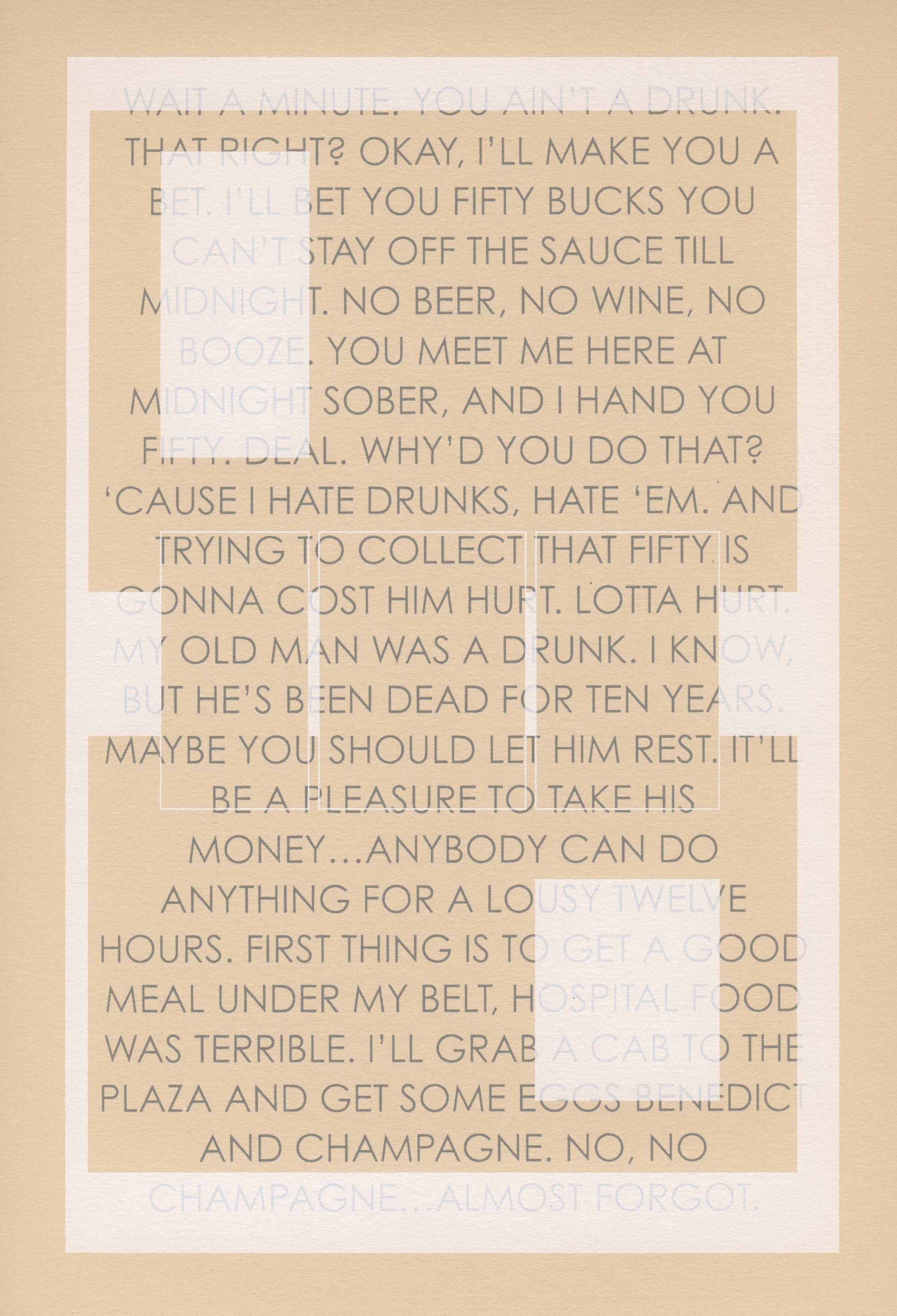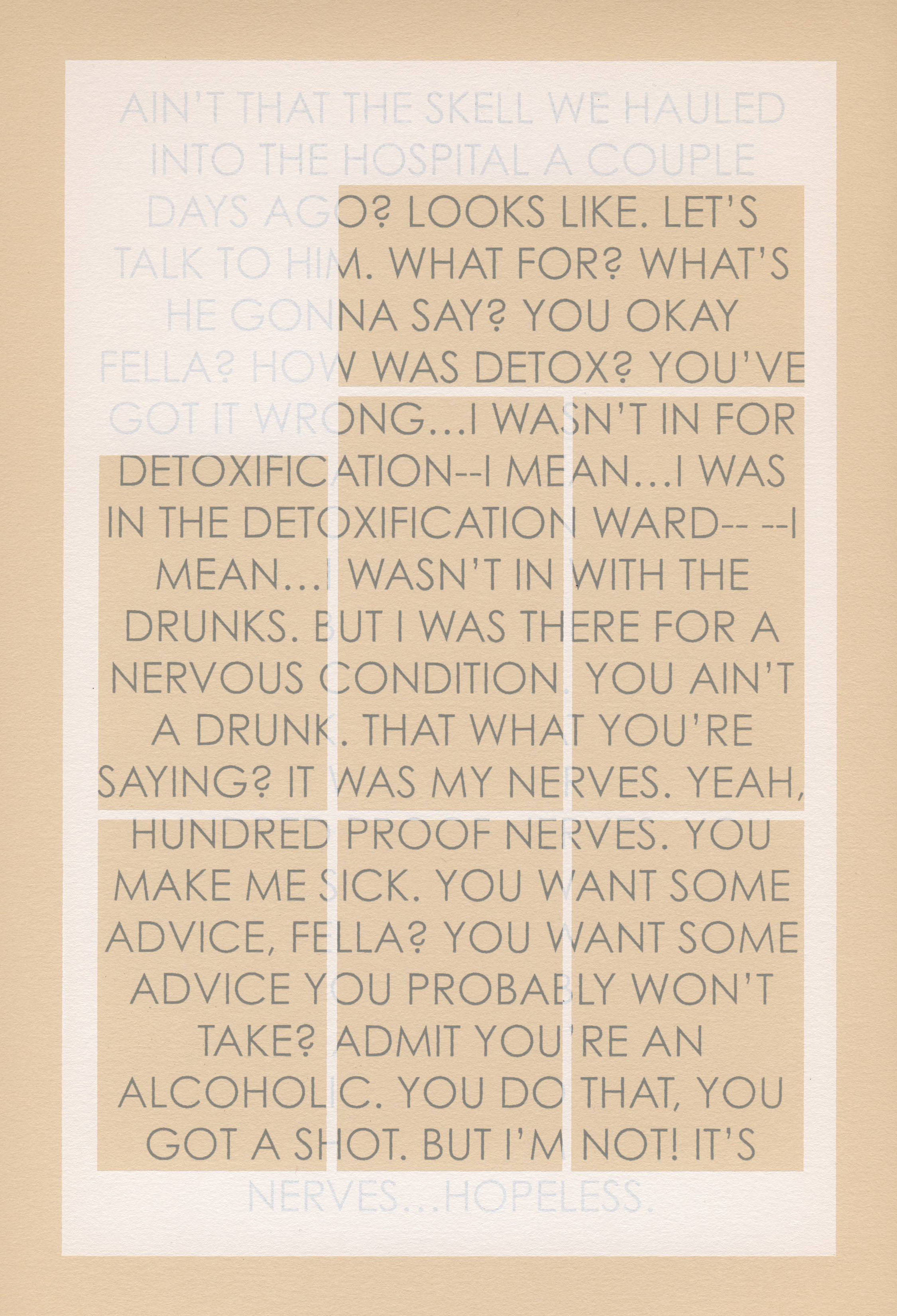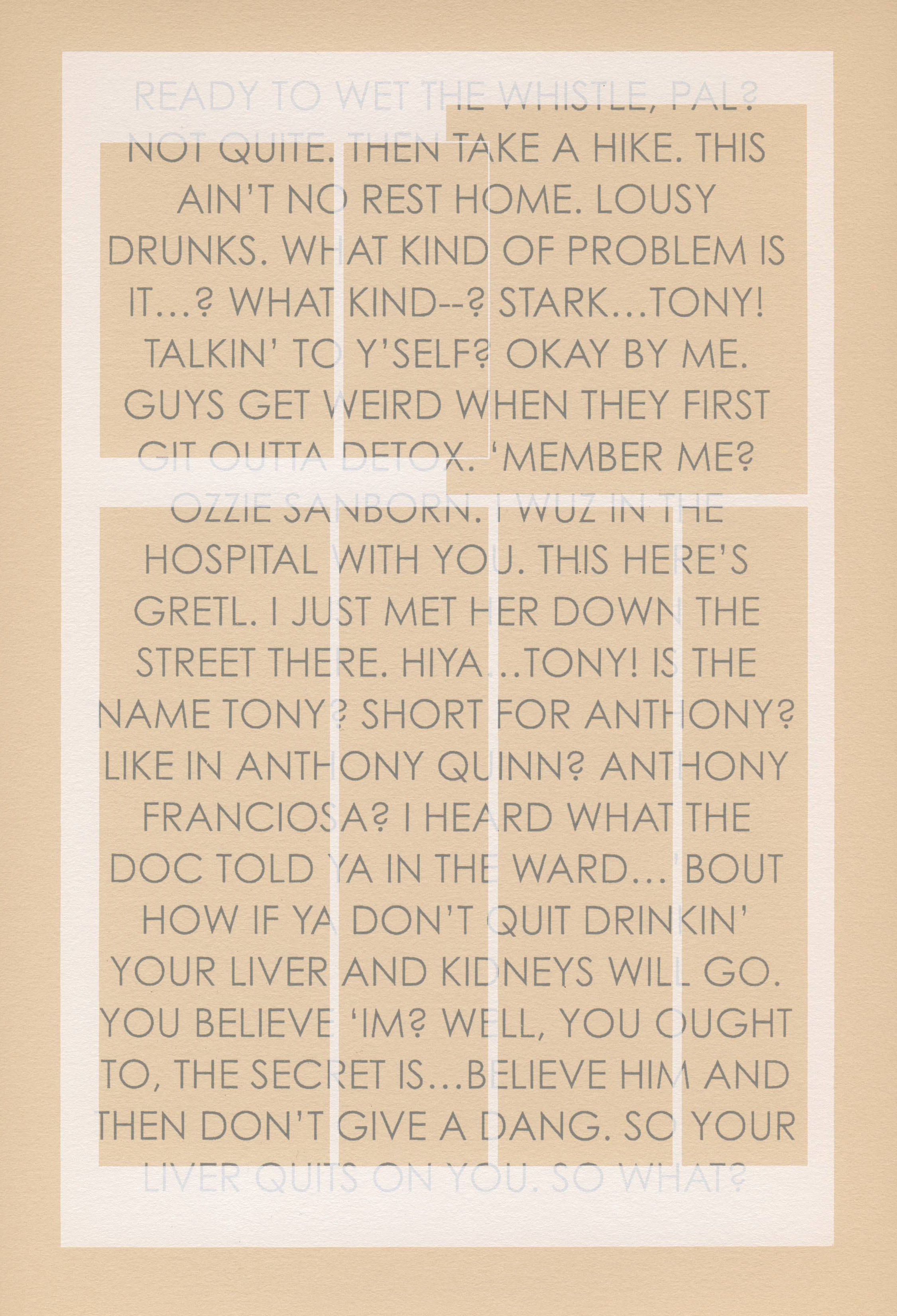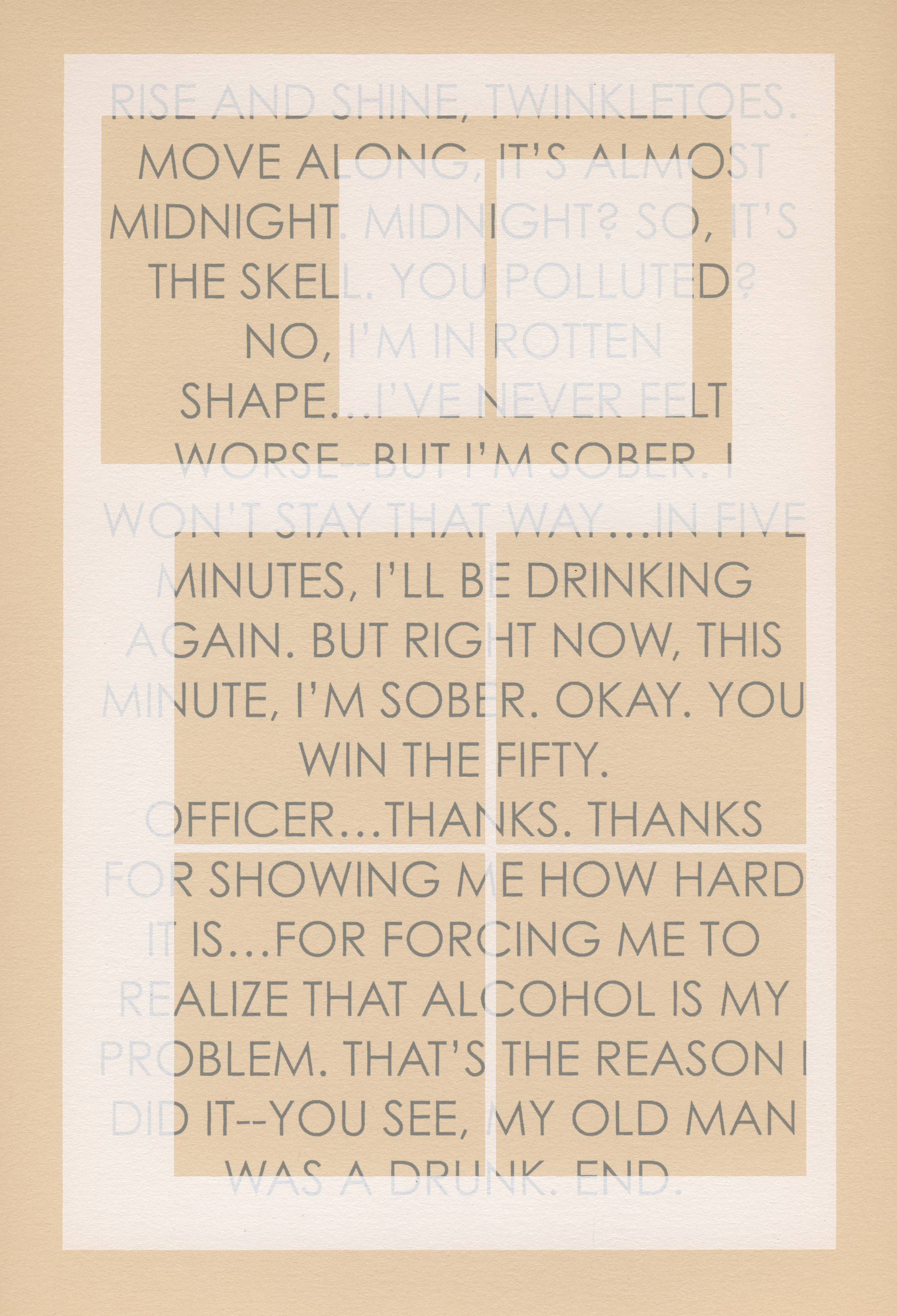 This series is similar to an earlier series of black and white prints and CMYK prints using the entire page of the comic. All imagery is removed, and the panel compositions of each page are combined with the text from that corresponding page. Each print is 10″x6.5″, the same size as the original, printed on tan stonehenge.