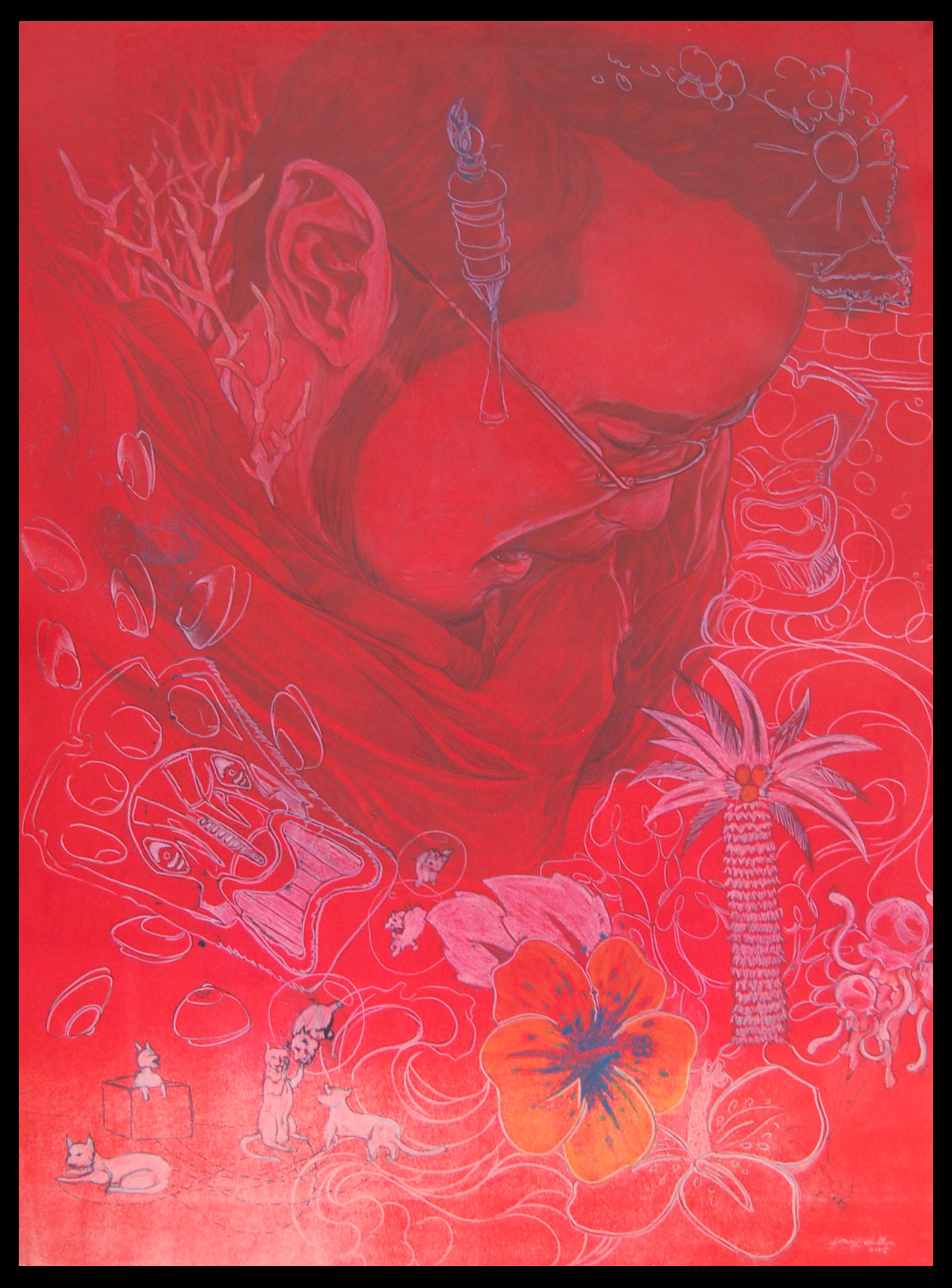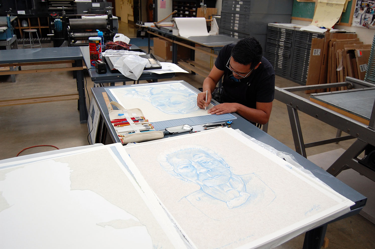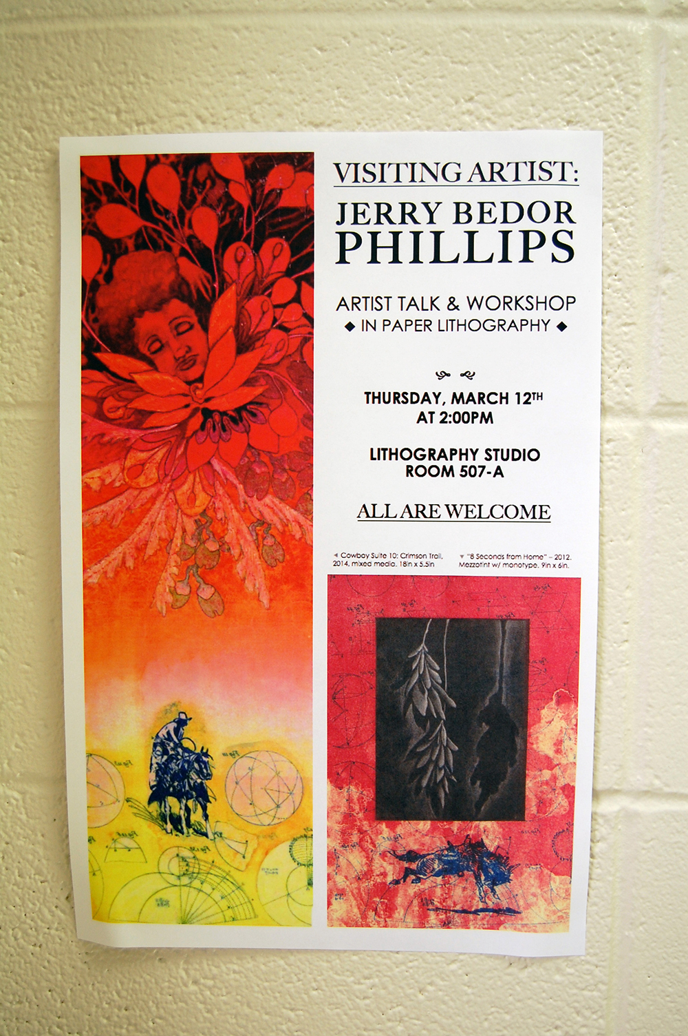 Jerry gave a really compelling talk and worked with students during a paper litho demo. Jerry stayed for an extra day or two to complete the piece made during the workshop. The whole event was a total success, and Jerry was an absolute blast to be around.