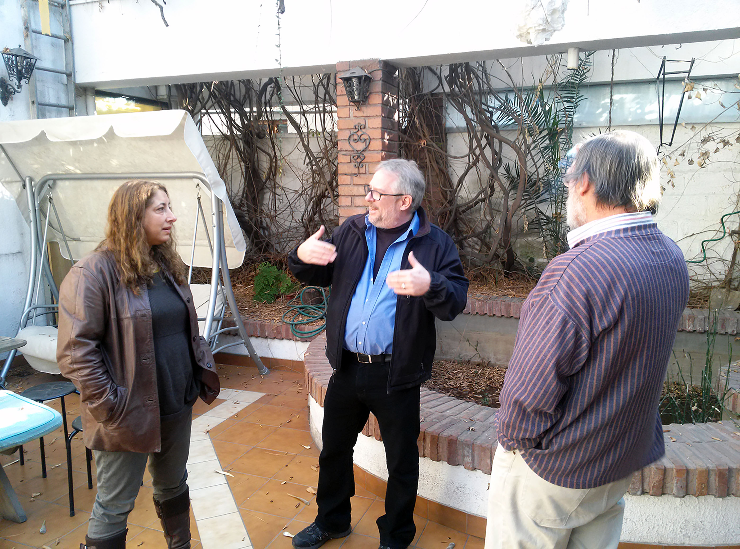 Discussing the potentials of the printshop, Isabel, Bob and Raphael in the courtyard.