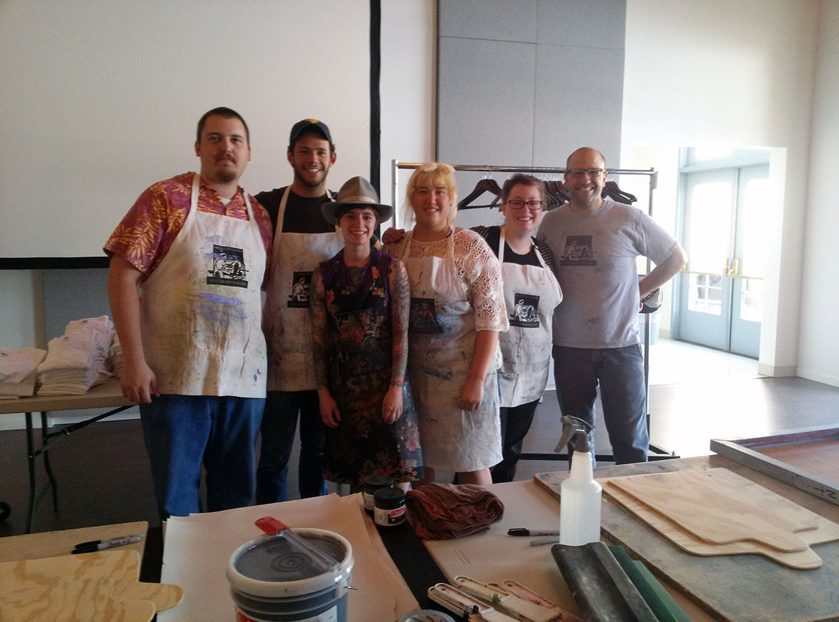 The printmakers: Jake Guzan, Brett Herron, Allison Blair, Jessica Poole, Leslie Norris and myself…getting ready for the day.