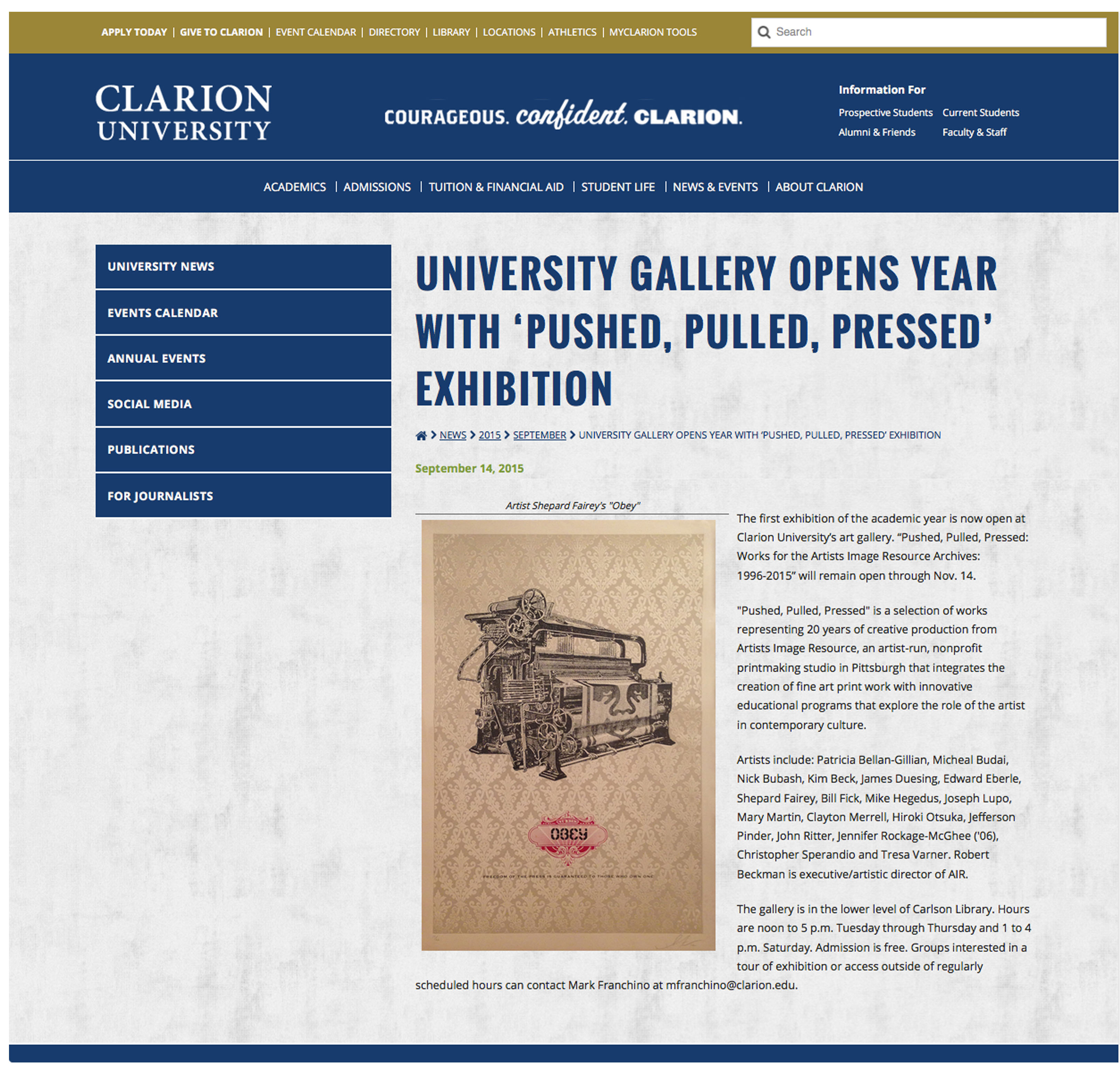 Recent work of mine will be on display in the “Pushed, Pulled, Pressed: Works for the Artists Image Resource Archives: 1996-2015” exhibition at the Clarion University Art Gallery in Clarion, PA.