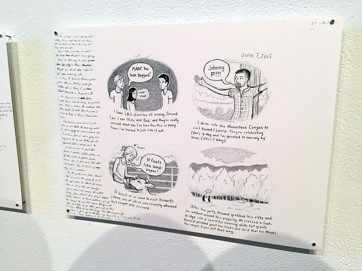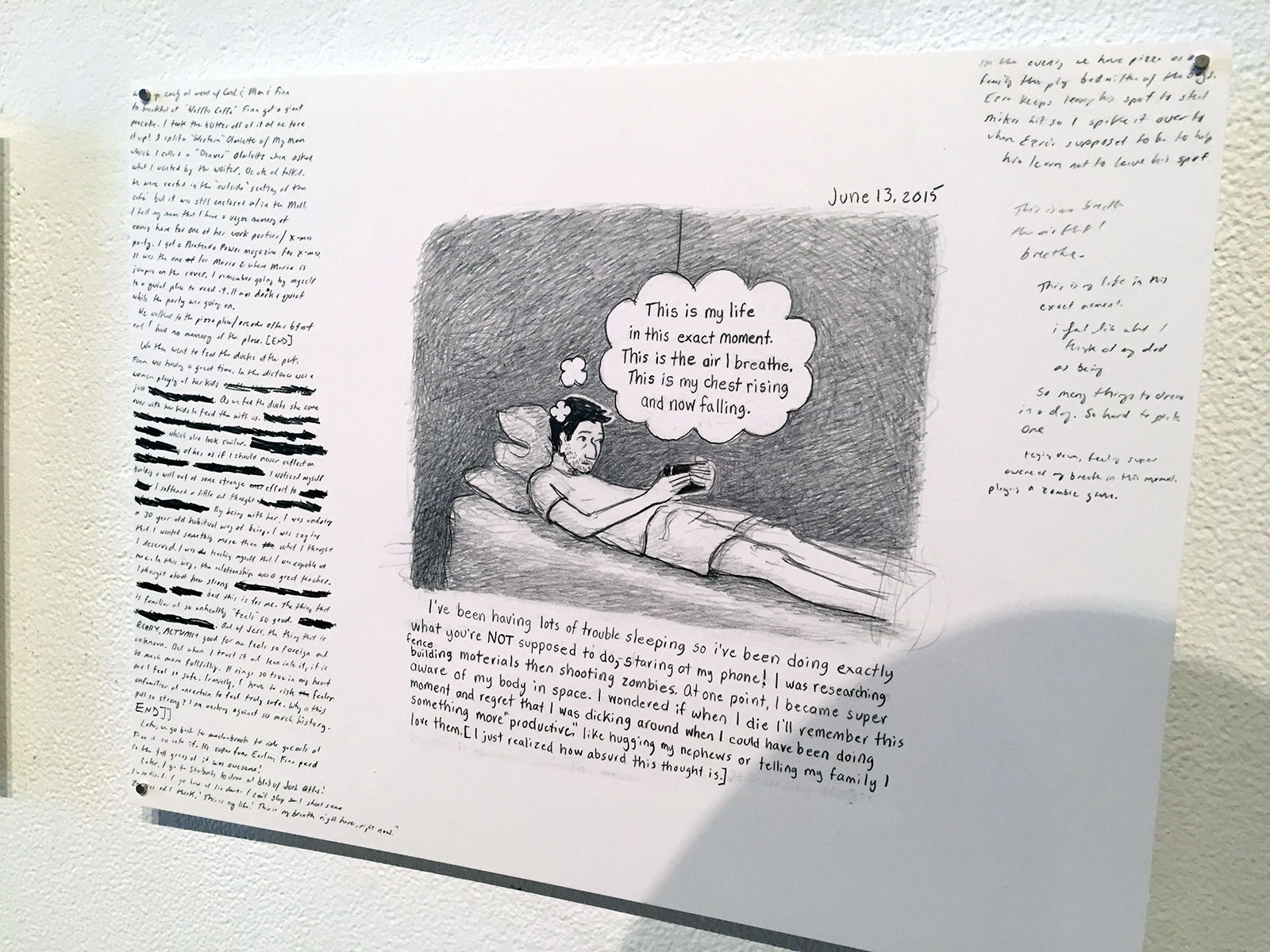 The drawings themselves look much more nuanced. You can see much more line work, much more tonal development in the shading. Its possible that because they are in the gallery right now, I am responding to them in much more traditional ways as “ART”. But online, I overlook a lot of this nuance and beauty because I am responding to them much more as autobiographical comics.