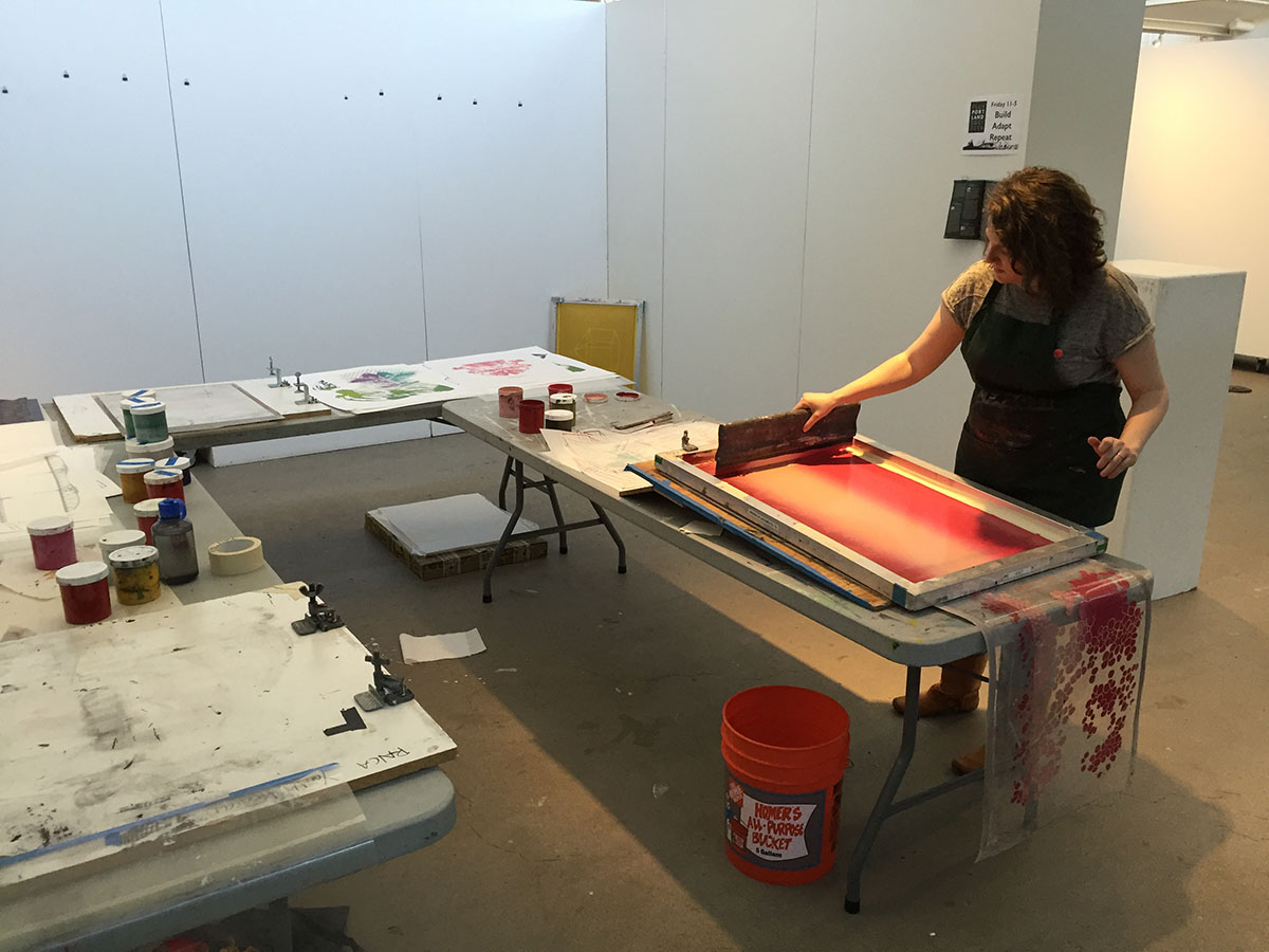 Taryn McMahon, a dynamo printmaker, getting her project started with Ellie Honl and Alison Filley…