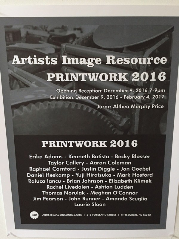 This year's PRINTWORK juried exhibition at Artists Image Resource looks great! Juror Althea Murphy-Price did a fantastic job! I was able to sneak away and make it to the opening reception, see the exhibition, and see WVU Print Grad Jacob Guzan's solo exhibition at AIR. Jake's solo show this year was part of winning the... Continue Reading →
