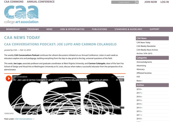 A while back Ellen Mueller, an unbelievably prolific faculty member at the University of Massachusetts in Dartmouth, asked me to be a part of a new podcast series for the College Arts Association. I asked Carmon Colangelo, now Dean at the Sam Fox School of Design & Visual Arts, to record a conversation with me about... Continue Reading →