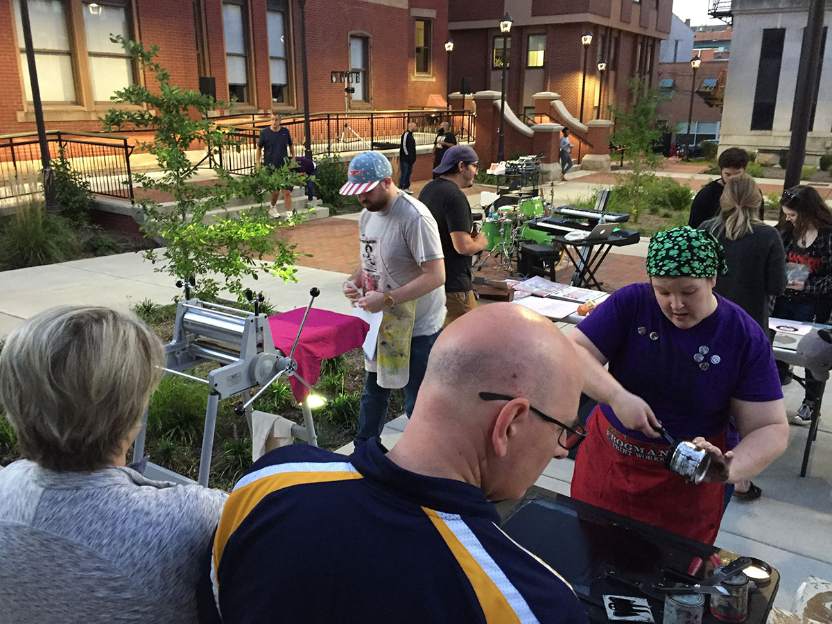 The WVU Print Club did an amazing job at this year’s Morgantown Arts Walk! They had three tables set up this year in front of the Mon County Courthouse, and it was a beautiful day outside! WVU Printmakers were selling prints and printing t-shirts on demand to raise funds for the WVU Print Club.