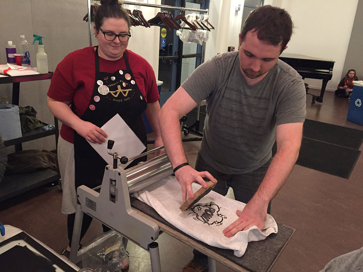 WVU Printmakers Stephanie Alaniz and Tyler Carter printing a design…
