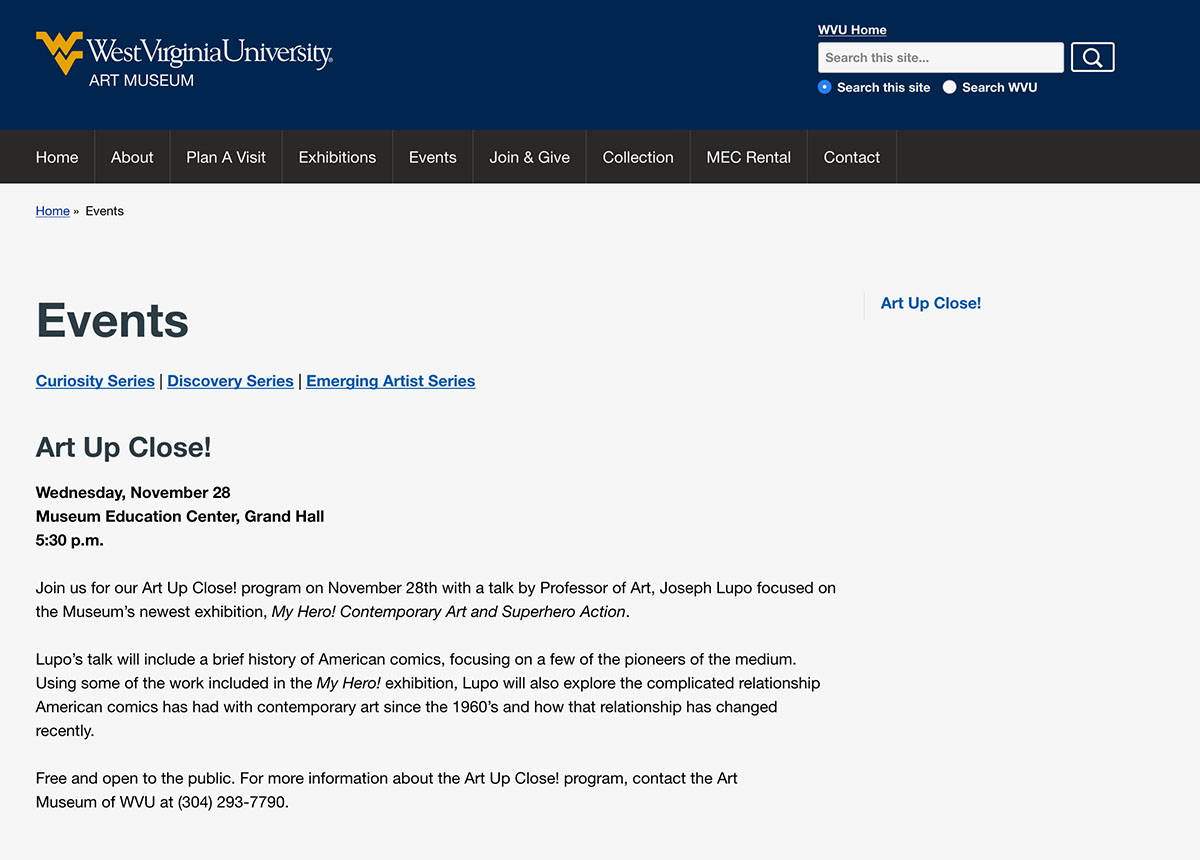 On Wednesday November 28th I will be giving a talk at the WVU Art Museum as a part of their regular ART UP CLOSE! lecture series. The talk will include a brief history of American comics, focusing on a few of the pioneers of the medium. Using some of the work included in the My Hero! exhibition, I will also explore the complicated relationship American comics has had with contemporary art since the 1960’s and how that relationship has changed recently.