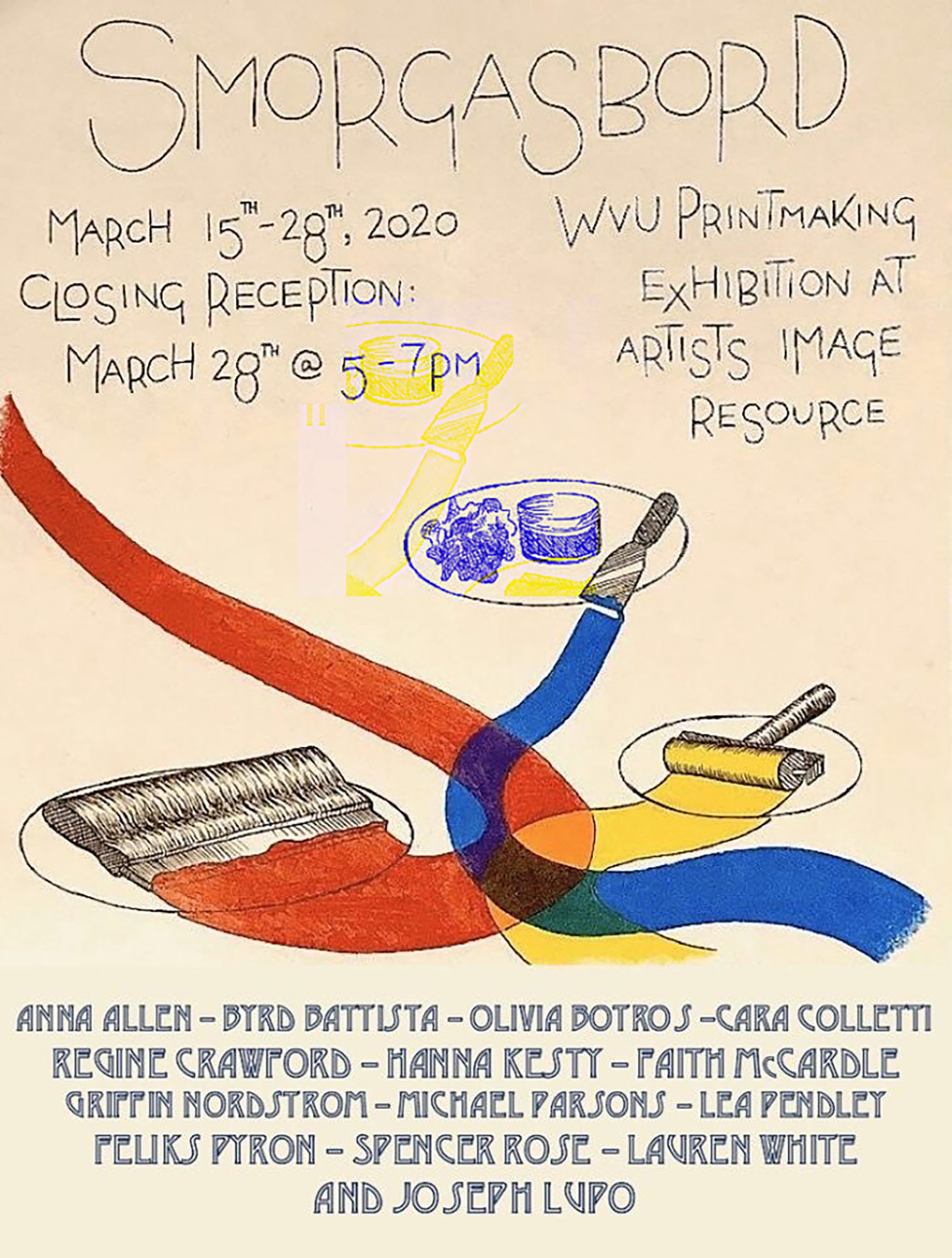 Right before WVU’s campus went on hiatus, my students installed our annual WVU Printmaking exhibition “Smorgasbord” at Artists Image Resource. This exhibition is the culmination of our academic year and the students are required to do all the work that goes into organizing and installing this group exhibition. I haven’t seen the show in person, and I might not get a chance to, but from these pictures, it looks like they did a fantastic job!