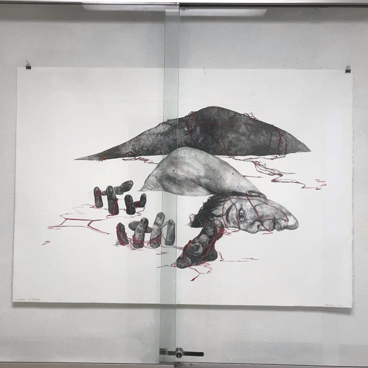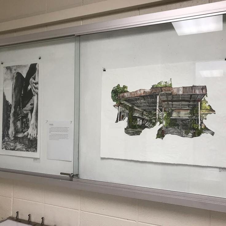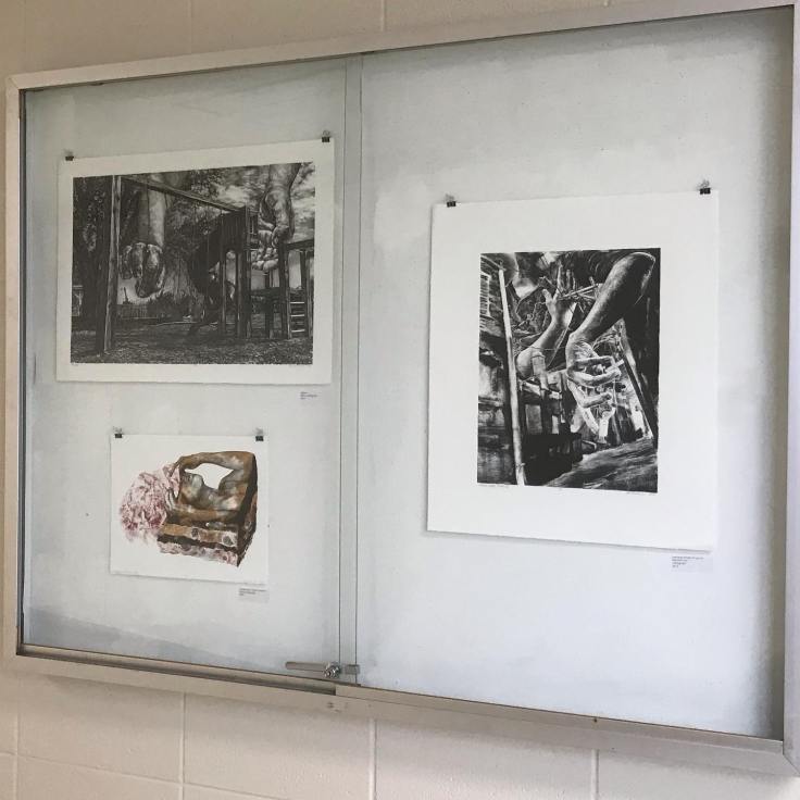 We are continuing our recent tradition of asking current MFA students or emerging artists from around the country to show their work in our glass cases. SUPER excited to have these beautiful lithographs by Zoë Couvillion. Zoë is currently a graduate student at Northern Illinois University and received a BFA Degree from University of Louisiana at Lafayette. Thank you Zoë for sharing your amazing work with us! I hope people will be able to see Zoë’s work in person at some point soon, photos do not do your work justice.