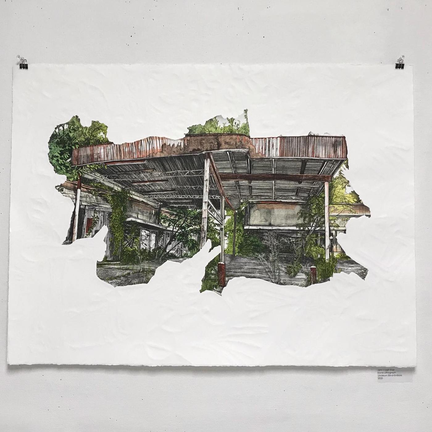 We are continuing our recent tradition of asking current MFA students or emerging artists from around the country to show their work in our glass cases. SUPER excited to have these beautiful lithographs by Zoë Couvillion. Zoë is currently a graduate student at Northern Illinois University and received a BFA Degree from University of Louisiana at Lafayette. Thank you Zoë for sharing your amazing work with us! I hope people will be able to see Zoë’s work in person at some point soon, photos do not do your work justice.