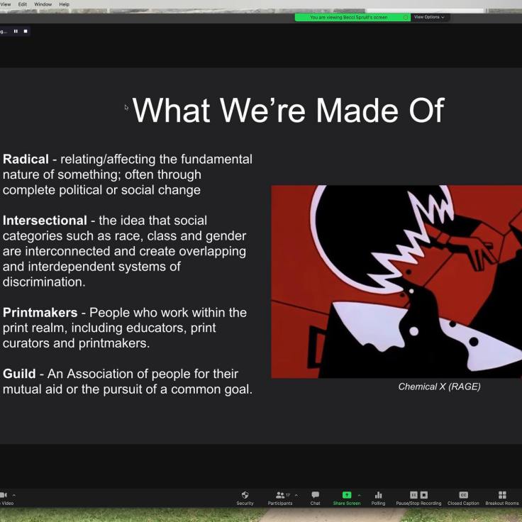 This week we hosted printmakers Olivia Richardson and Becci Spruill to talk about their work and the Radical Intersectional Printmakers Guild. This was such a great way to end the semester, excellent conversation about the realities of being an artist outside of school, finding one’s artistic voice, and being a part of a supportive artistic community.