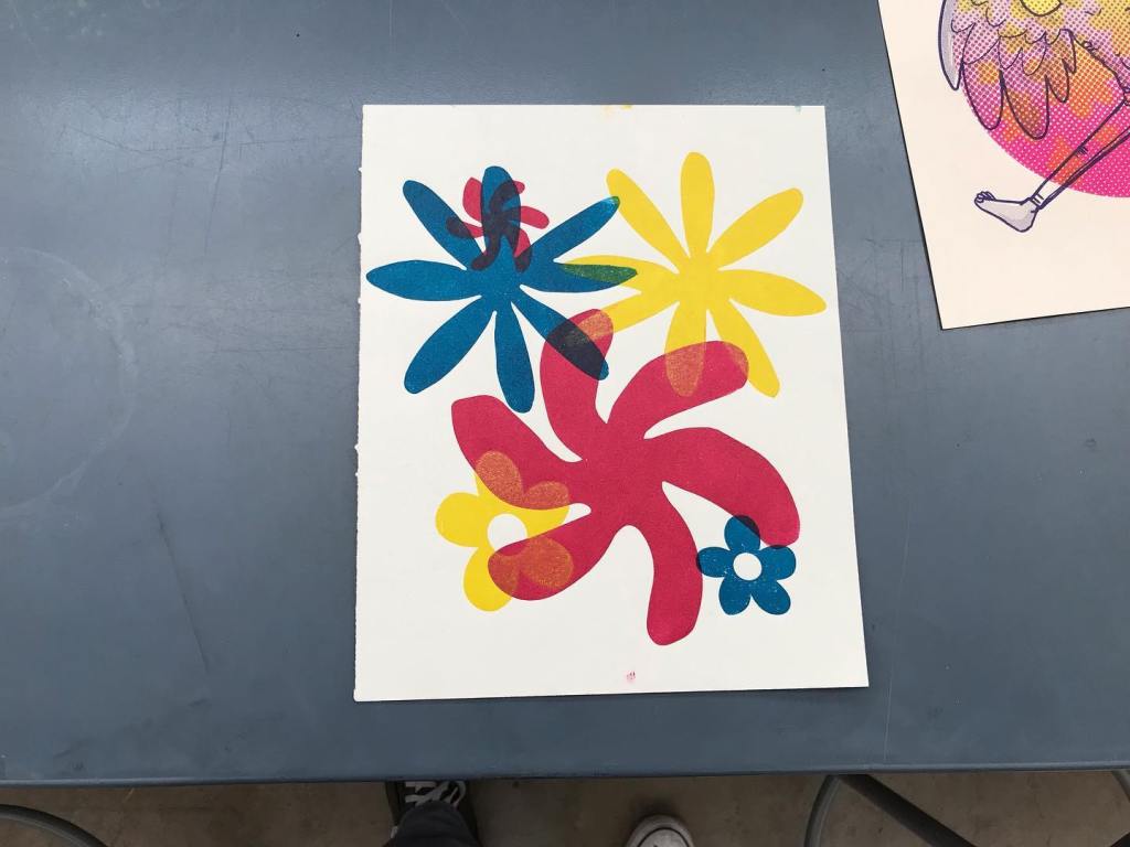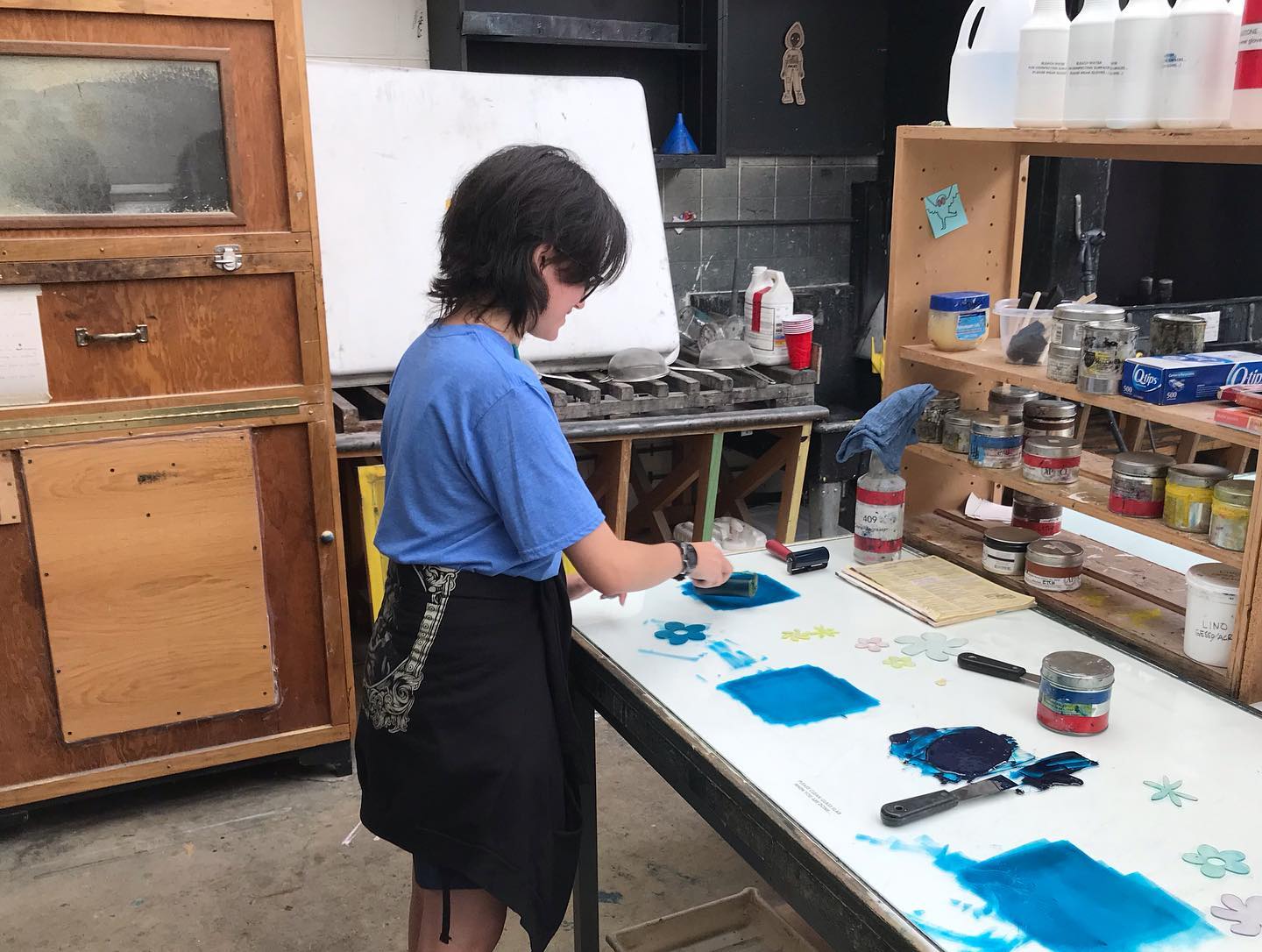 So great to see the printshop humming with activity as we hosted a portion of our ART 191 Freshman Orientation class. These workshops give students early access to processes they may have not encountered in their high school art programs. Students were able to run a three color screen print, print a tote bag with a relief block, and ran a three color monotype with laser cut acrylic plates.