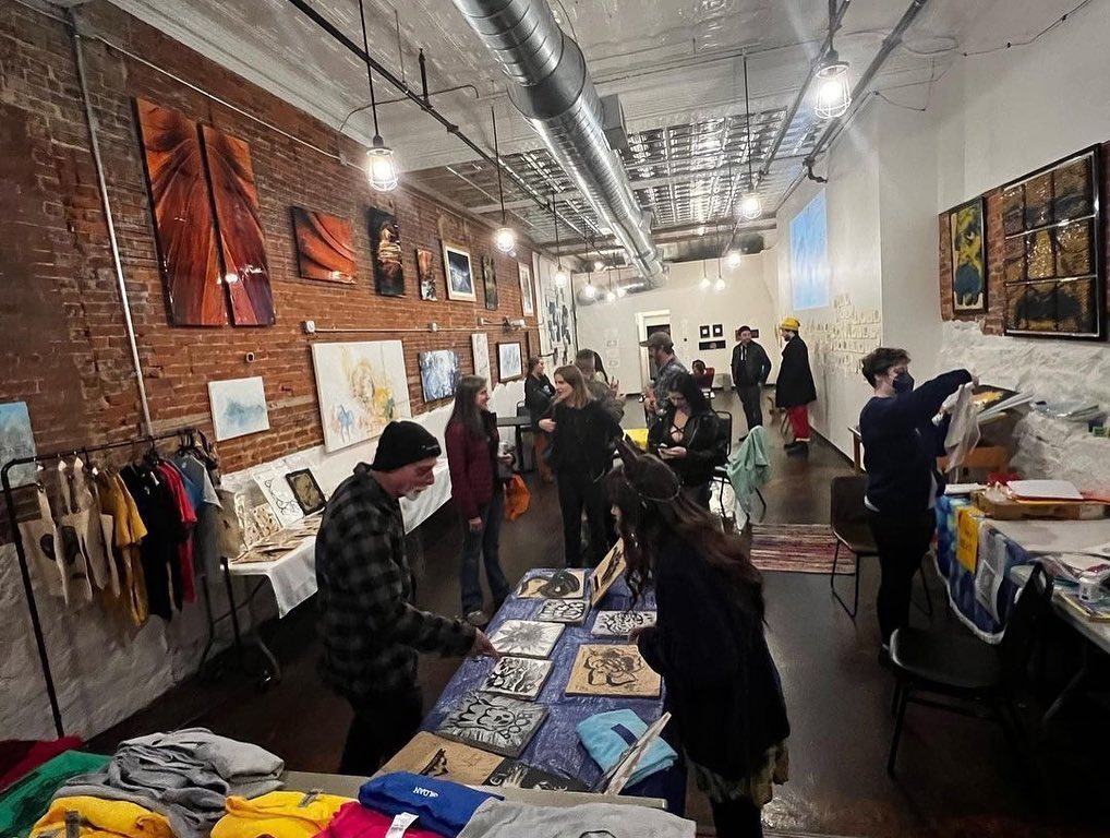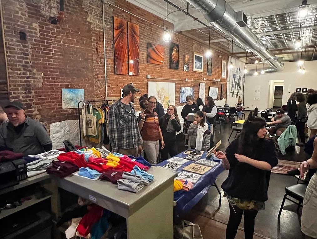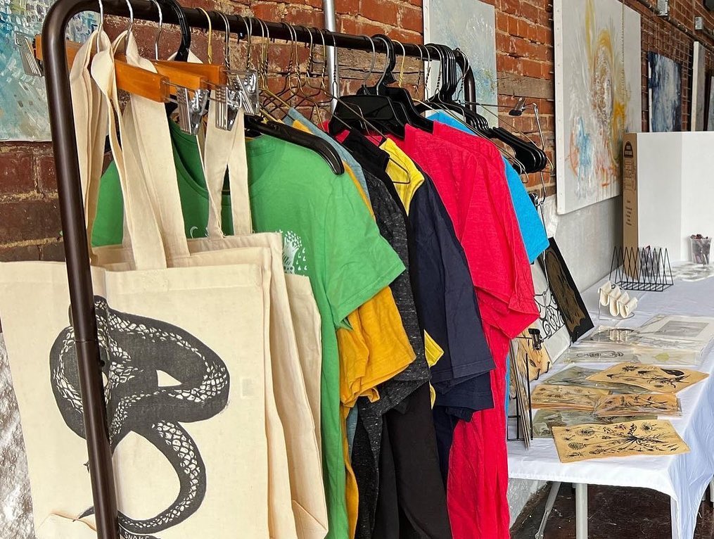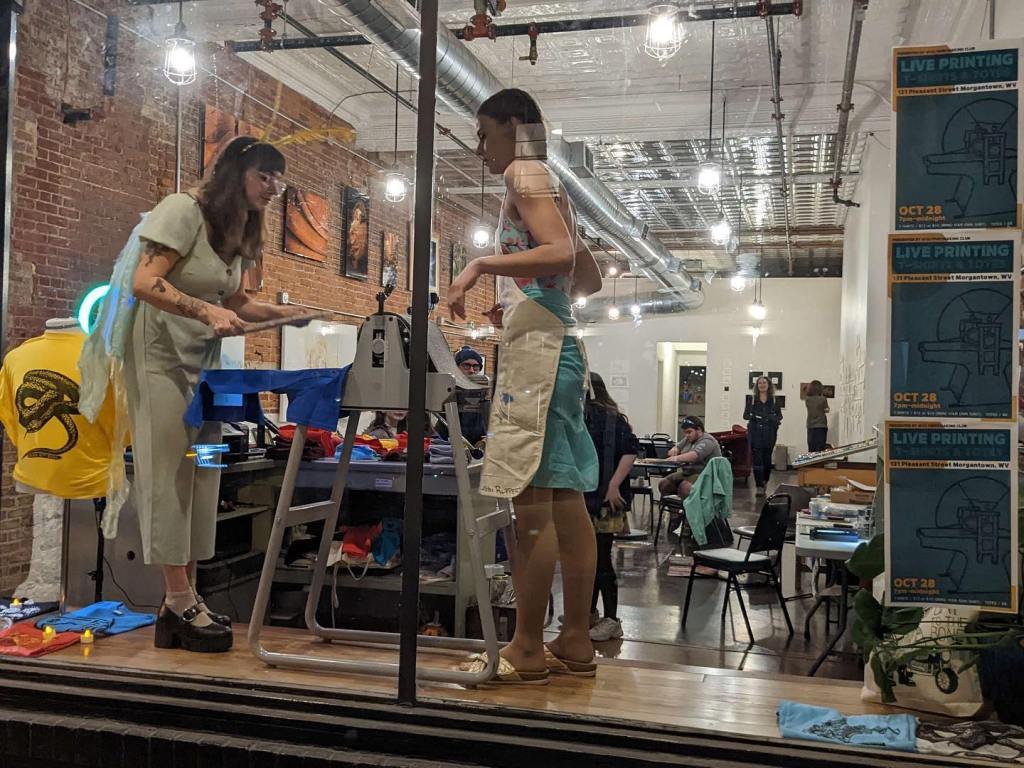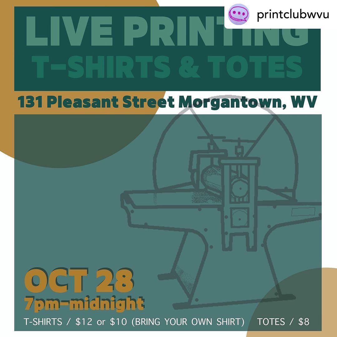 Last weekend was a busy as the WVU Print Club also held a very successful live t-shirt and tote bag printing event next to 123 Pleasant Street! A big thank you to everyone who came out to buy something and support our students and student organization! Funds raised during these events support students in attending important conferences and workshops across the country, helping them learn valuable new skills and processes and work with new tools and materials, and build their community of print friends and artists! Great job printmakers! Look for another live printing event during the holiday season.