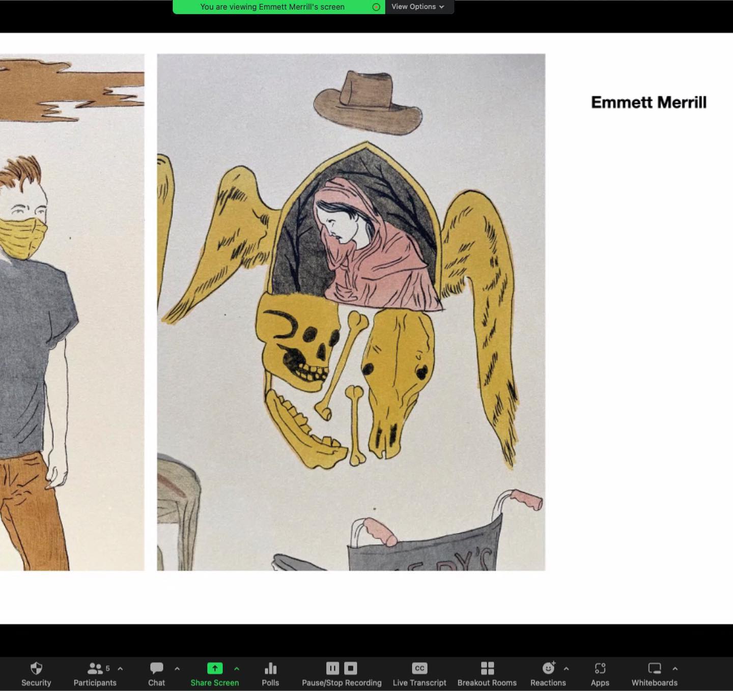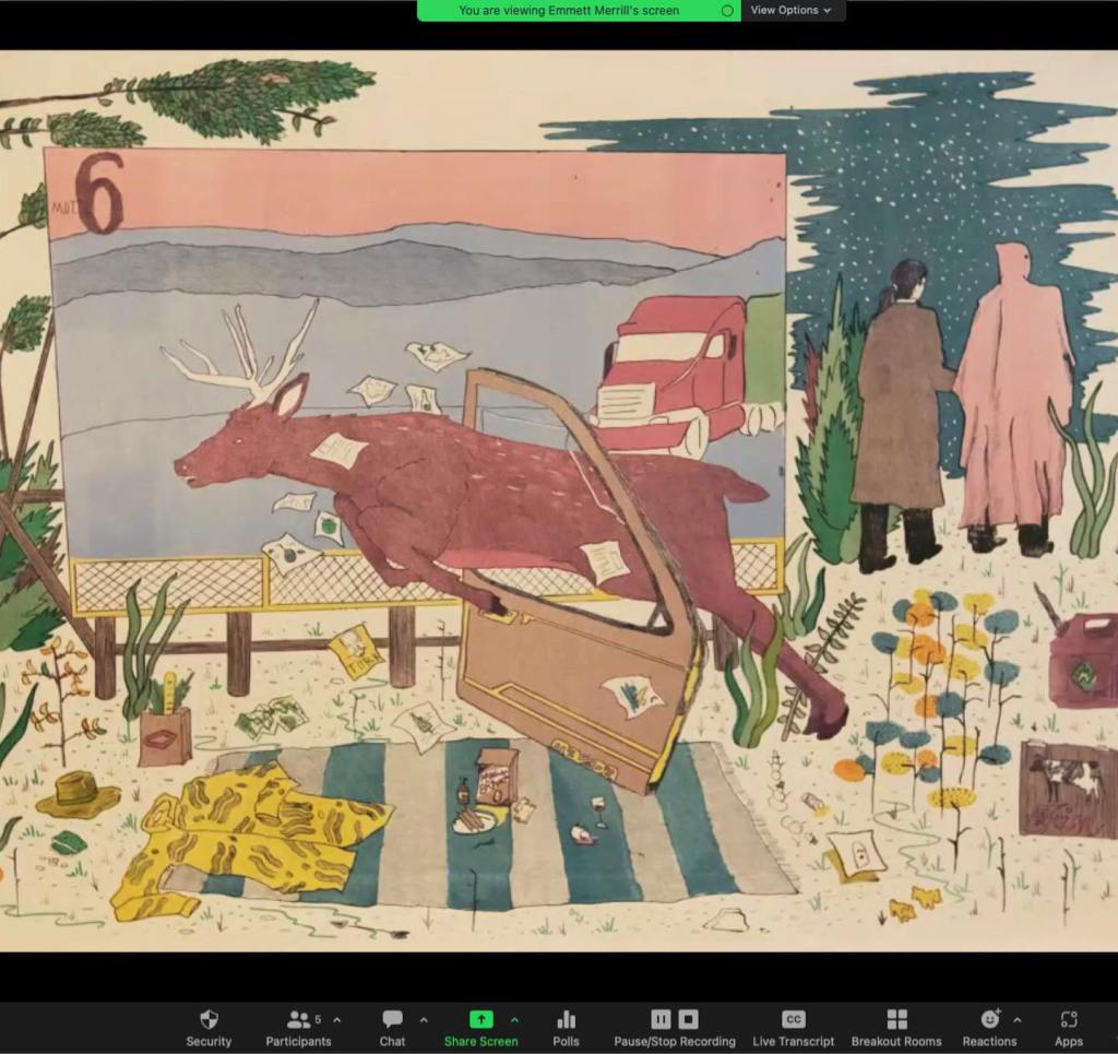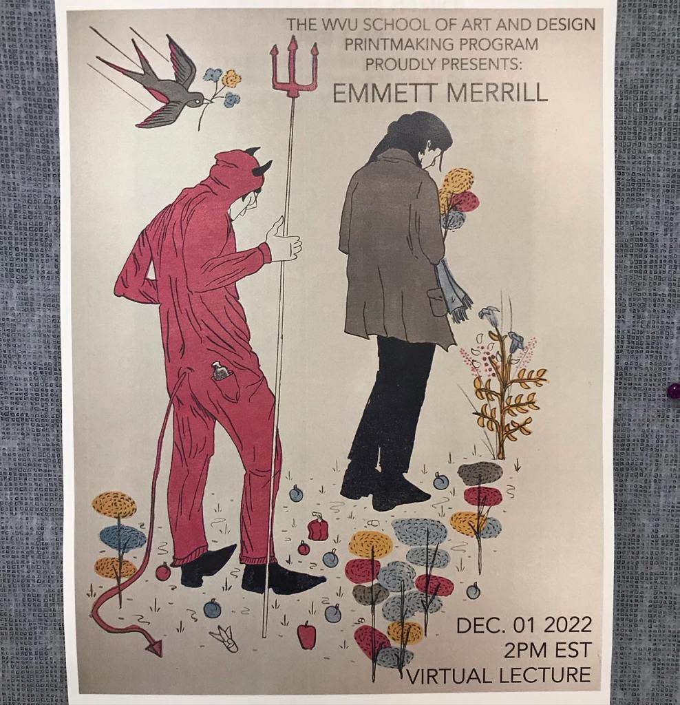 Last week our advanced printmaking class was visited by Emmitt Merrill. Big thank you to Emmitt for taking time to speak to our students and talk about their work! I’m such a big fan and it was really great to hear what goes into the creation of these images and the stories that inform them. Thank you again Emmitt!