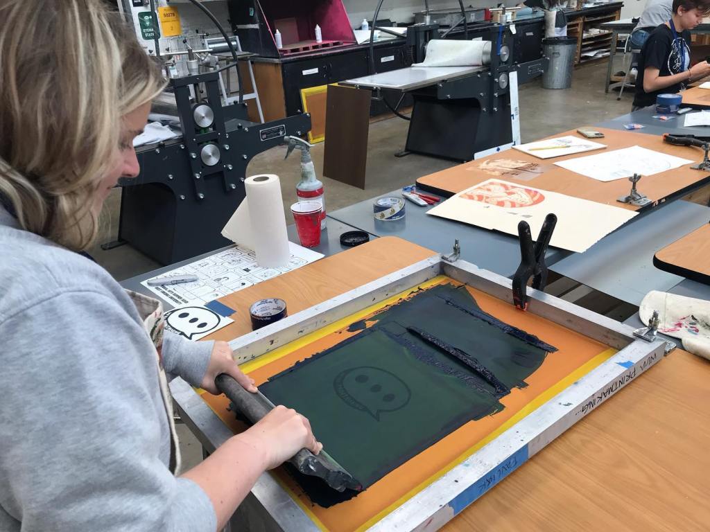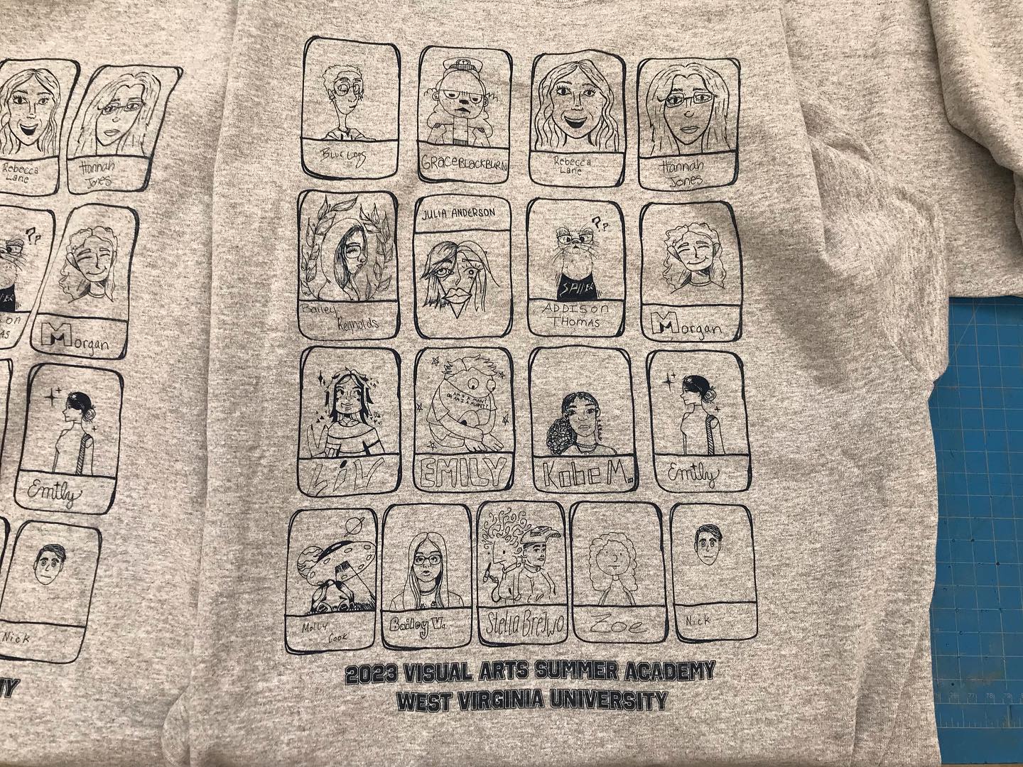 Last studio day for the WVU Residential Visual Arts Summer Academy was filled with t-shirt printing! At the start of camp each student drew a self portrait which was combined into a single image and printed on the back of a shirt. My group worked hard printing for the whole camp! Hope to see some shirts on campers during the end of the week event tomorrow! Nice work everyone!