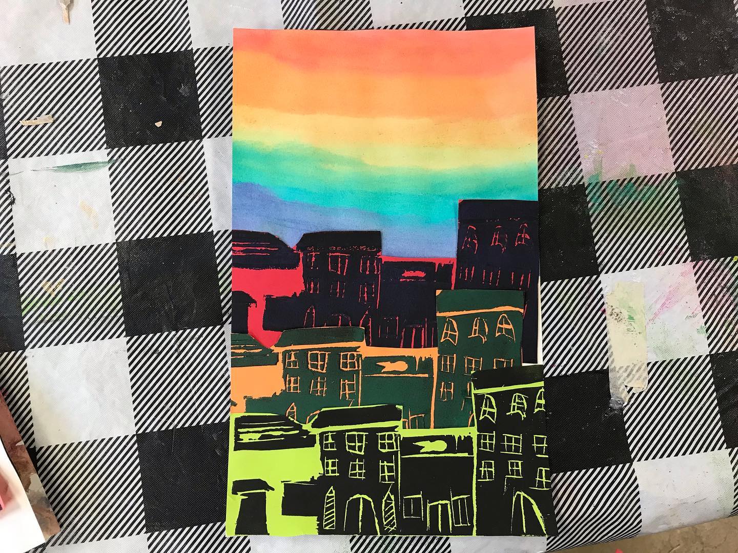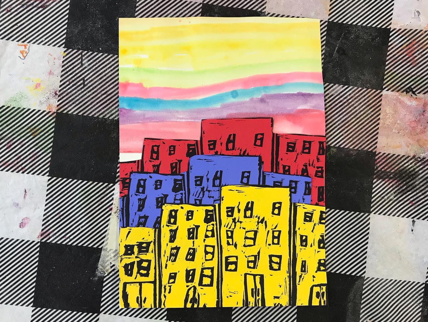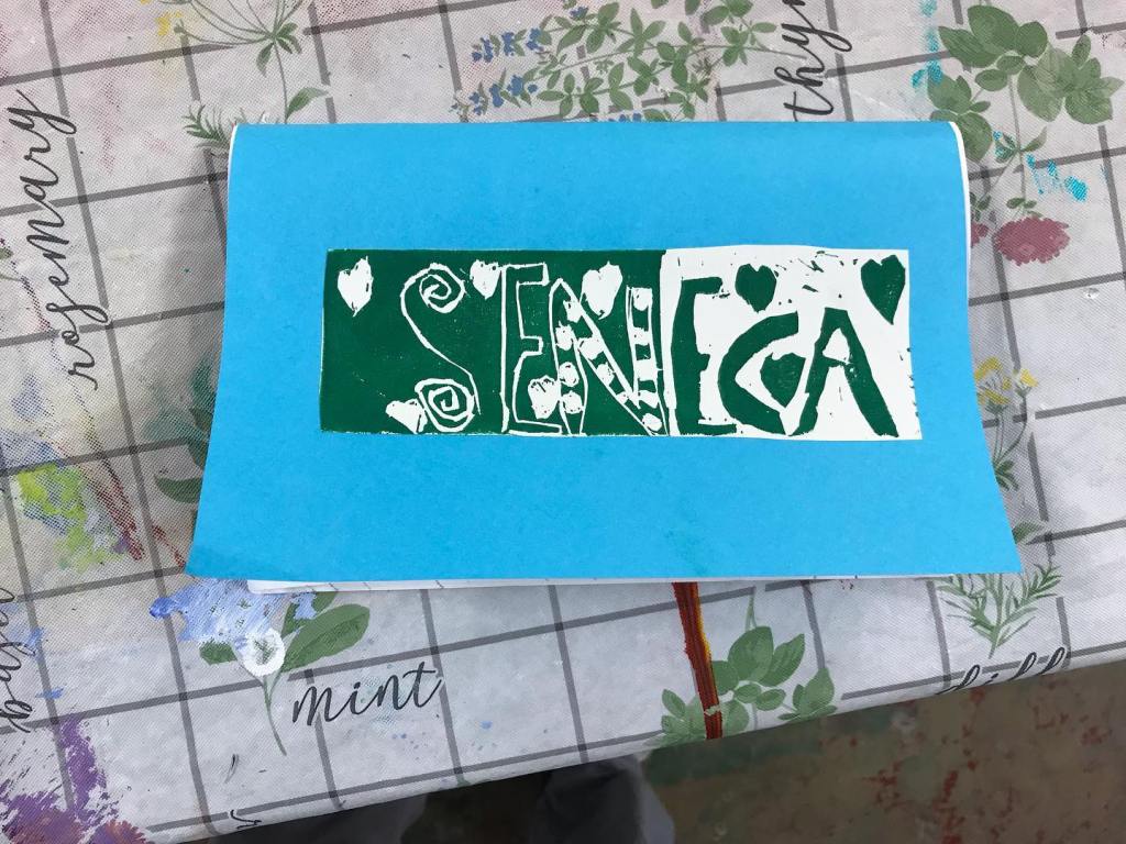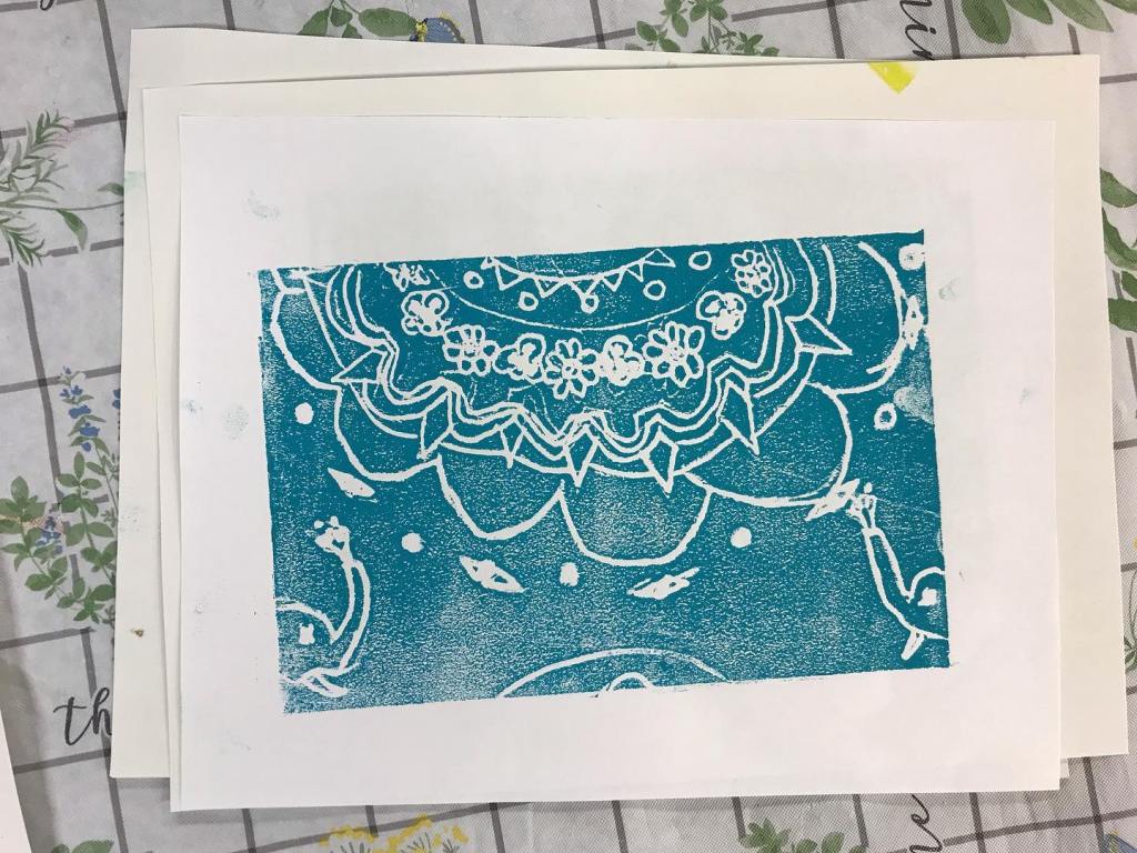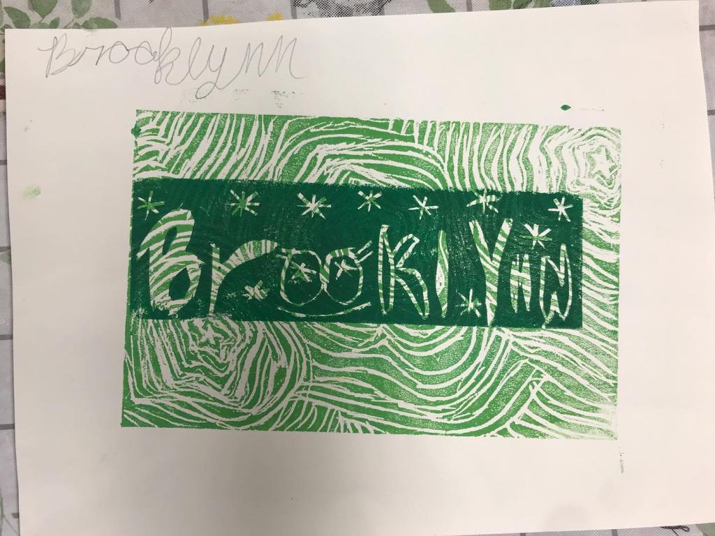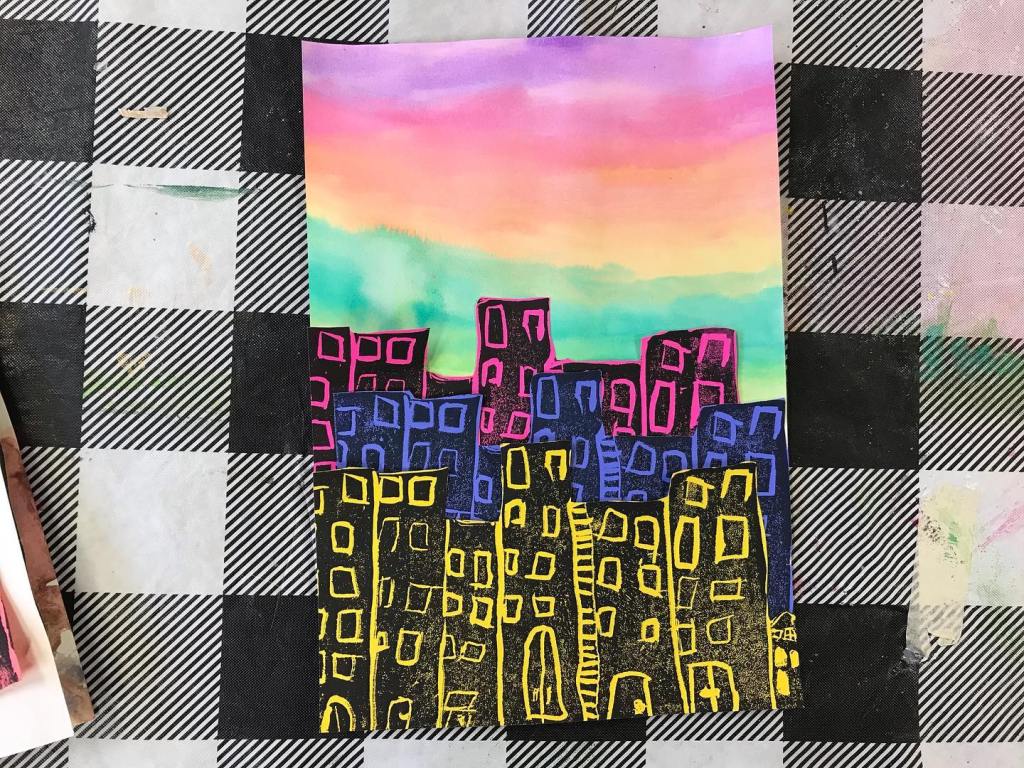 This summer we made sketchbooks that featured a two color print that features their name. Students used a 4×4” template to create a repeating pattern that could be transferred onto the linoleum, carved, then printed in sections. In our cityscapes projects we looked at reference photos of buildings in Morgantown and created new cityscape drawings. Students were asked to consider the architectural details that make buildings unique and visually interesting. We then then transferred those drawings onto our relief blocks, made prints, water colored a sky on a fresh sheet of paper then collaged the prints together to create the illusion of space.