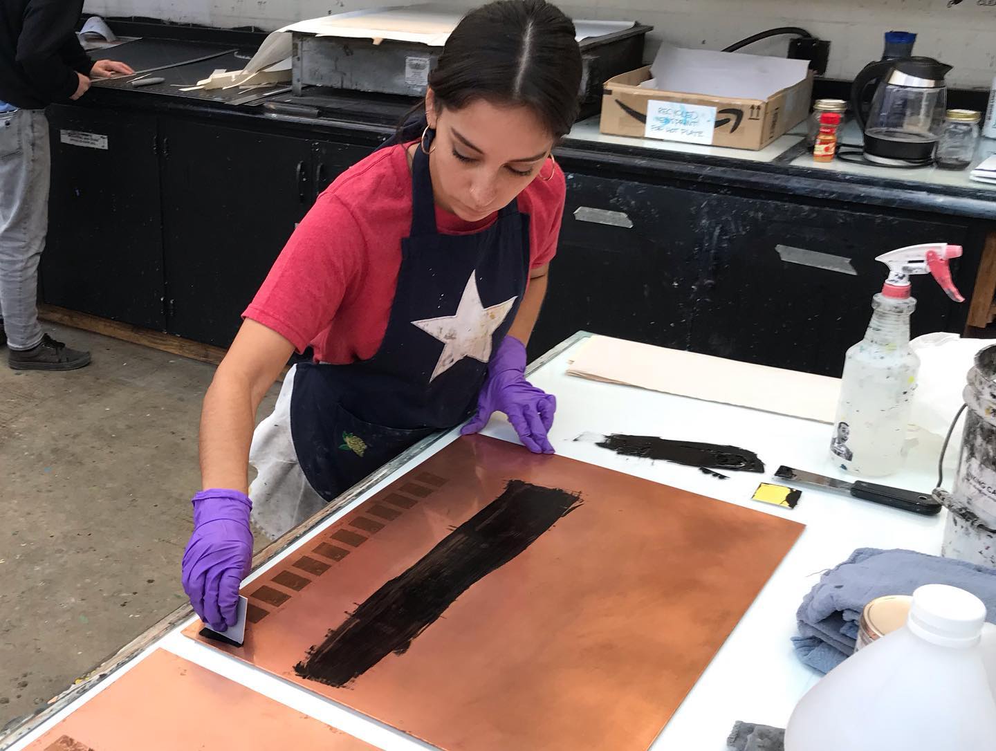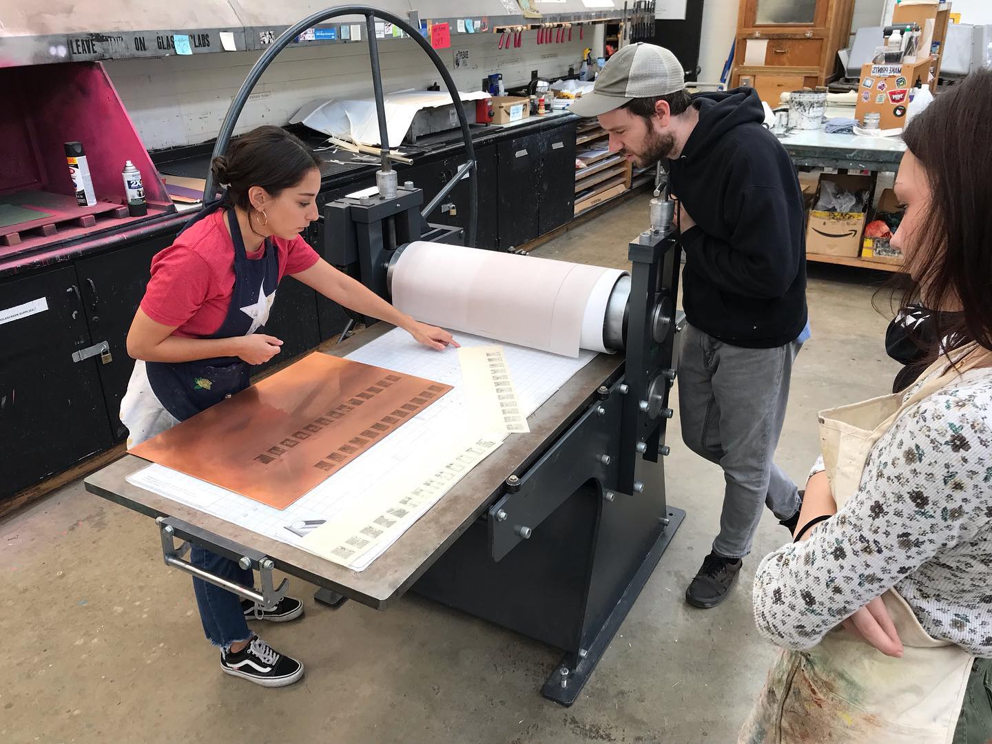 We had a fantastic two day visit from Leigh Garcia, our 2023 Lost Arrow Printmaking Lecture in Memory of Joe Hestick. Leigh worked with WVU printmakers to print a series of intaglio prints on Kitakata paper to then be dyed and constructed into their final form back at their studio. Leigh also gave a fantastic lecture and enjoyed a short reception in the printshop after. As always, a big thank you to Beth Hestick for funding this lecture series.